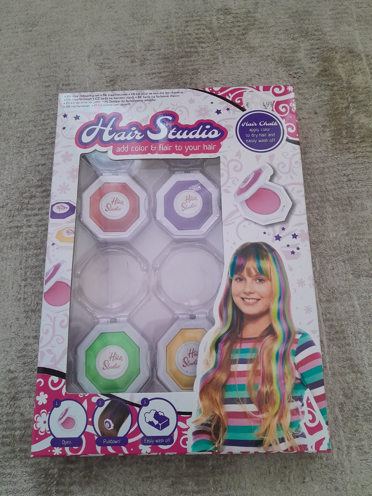 Kriedové farby na vlasy, na prilezitostne pouzitie,hned sa zmyju, ruzova farba bola pouzita ( foto )