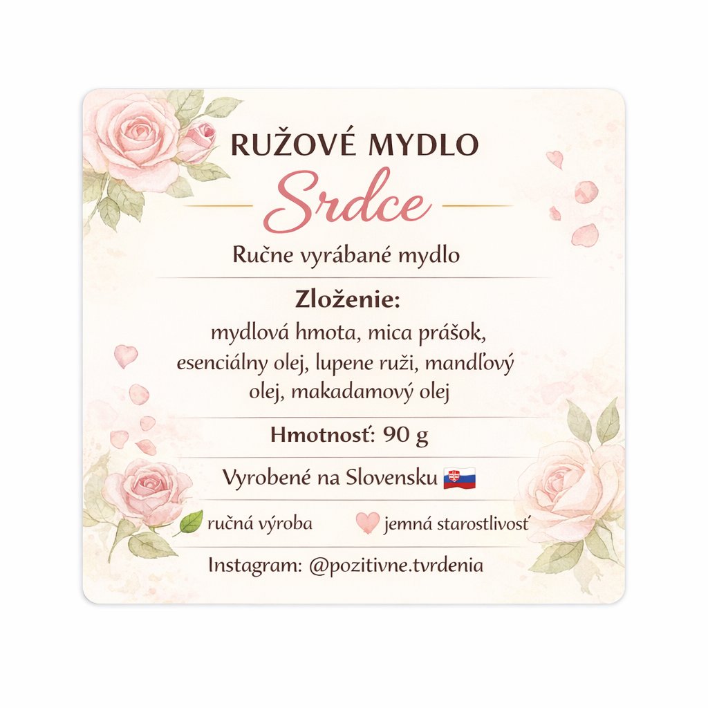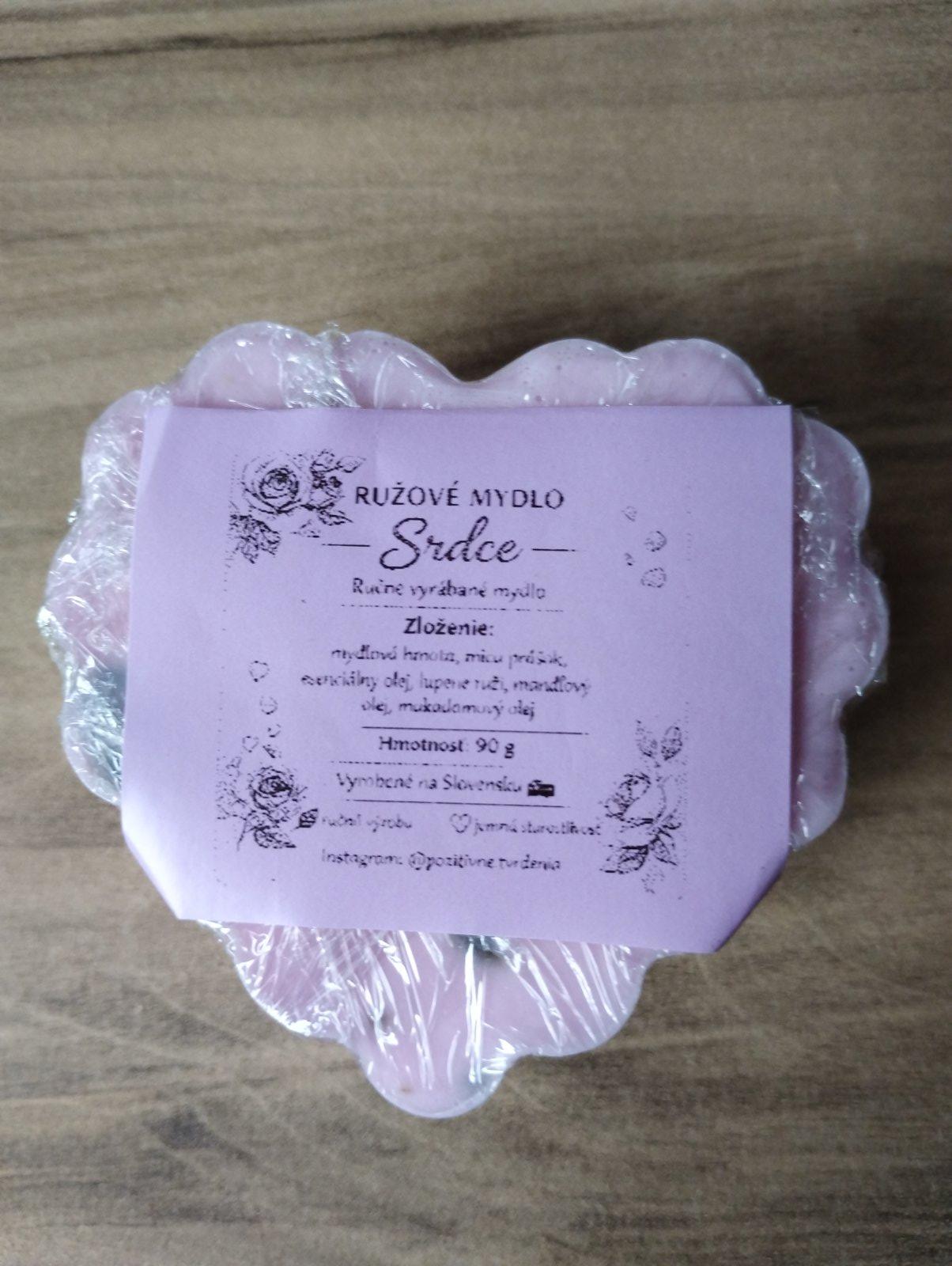 Ruzove mydlo srdce, zlozenie: mydlova hmota bez sls, mica prasok, esencialny olej, lupene ruzi, mandlovy olej, makadamiovy olej, hmotnost 90g, rozmery:7x6,5x2,5 cm. Ihned k odberu- krasna kvetinova vona.