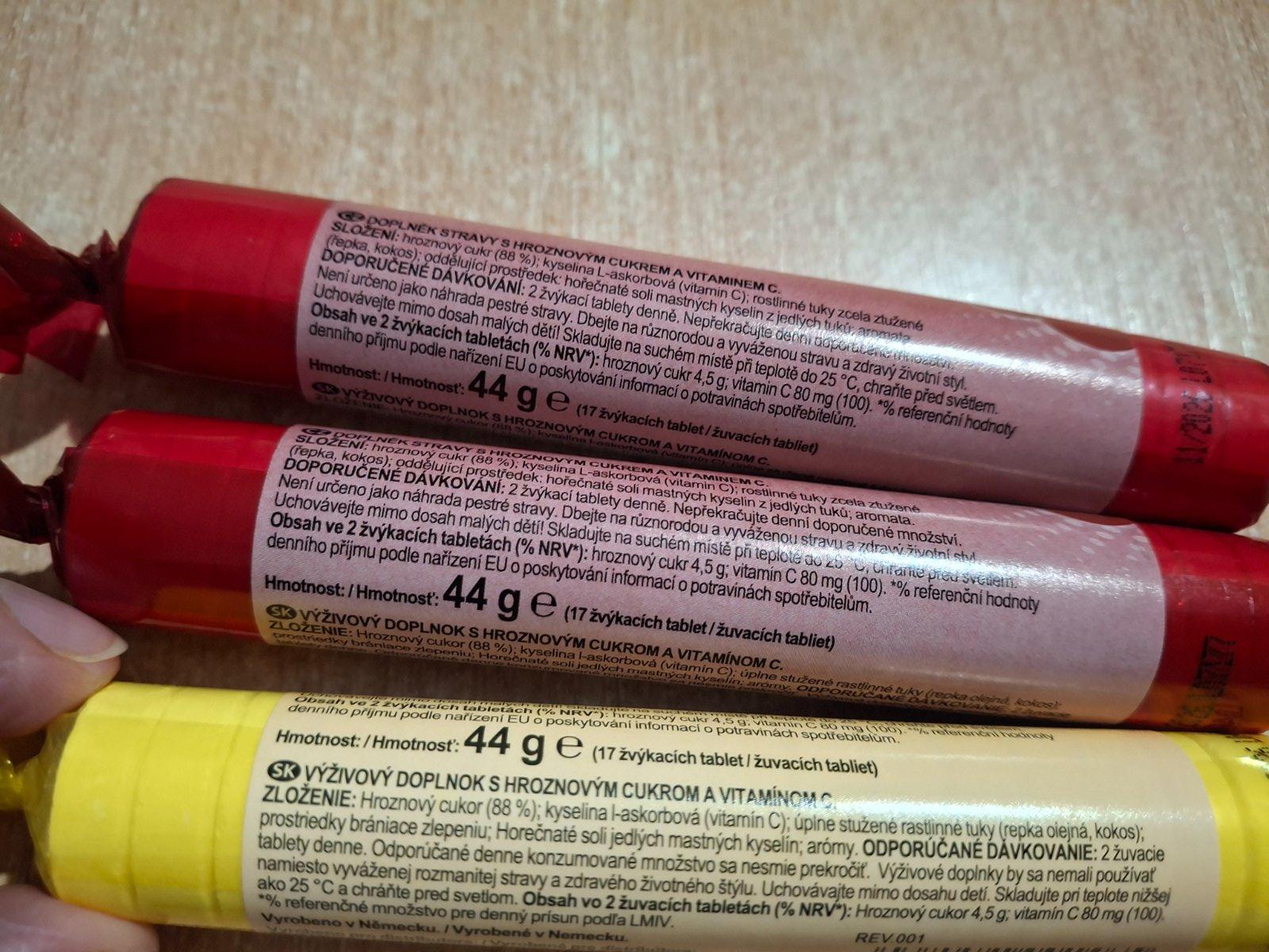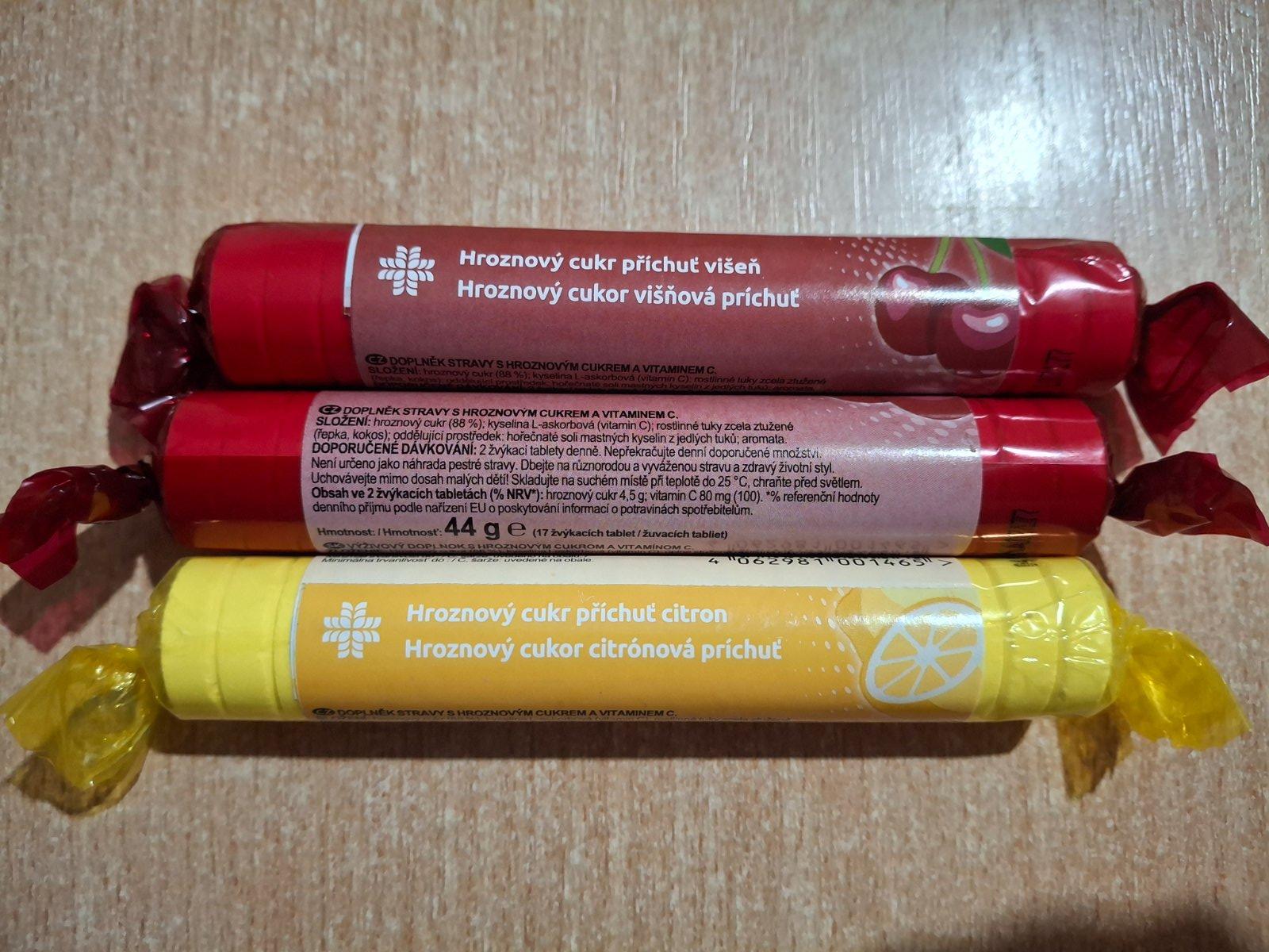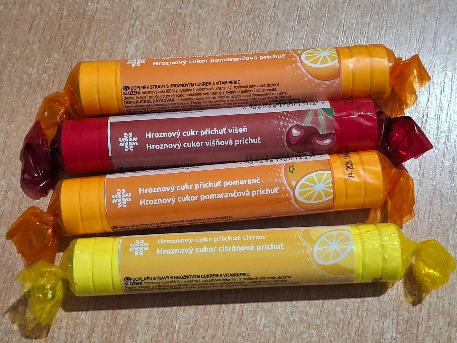 Hroznový cukor s vitamínom C. Výživový doplnok, hroznový cukor (dextróza) s vitamínom C, rolka, príchuť citrón, višňa, malina, pomaranč. Balenie za 1,90 eur. Minimálny odber 4 eur, plus poštovné.