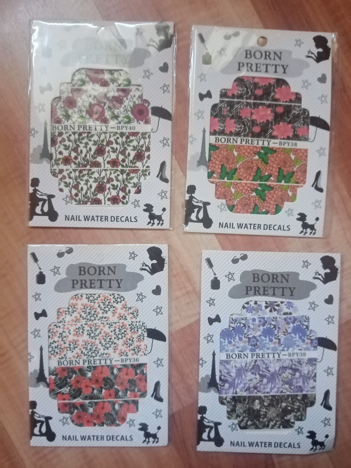 Nálepky na nechty - používajú sa s vodou, jednoduchá aplikácia, krásne držia. Nepoužité. Cena 4€ za všetky 4 balenia + poštovné (SSp.)