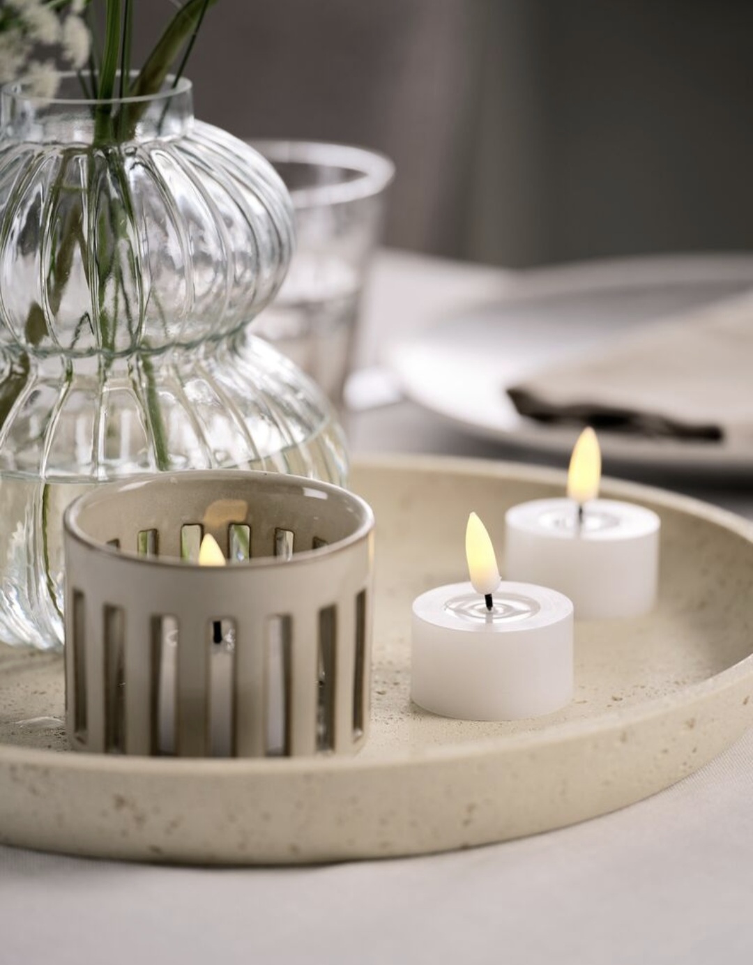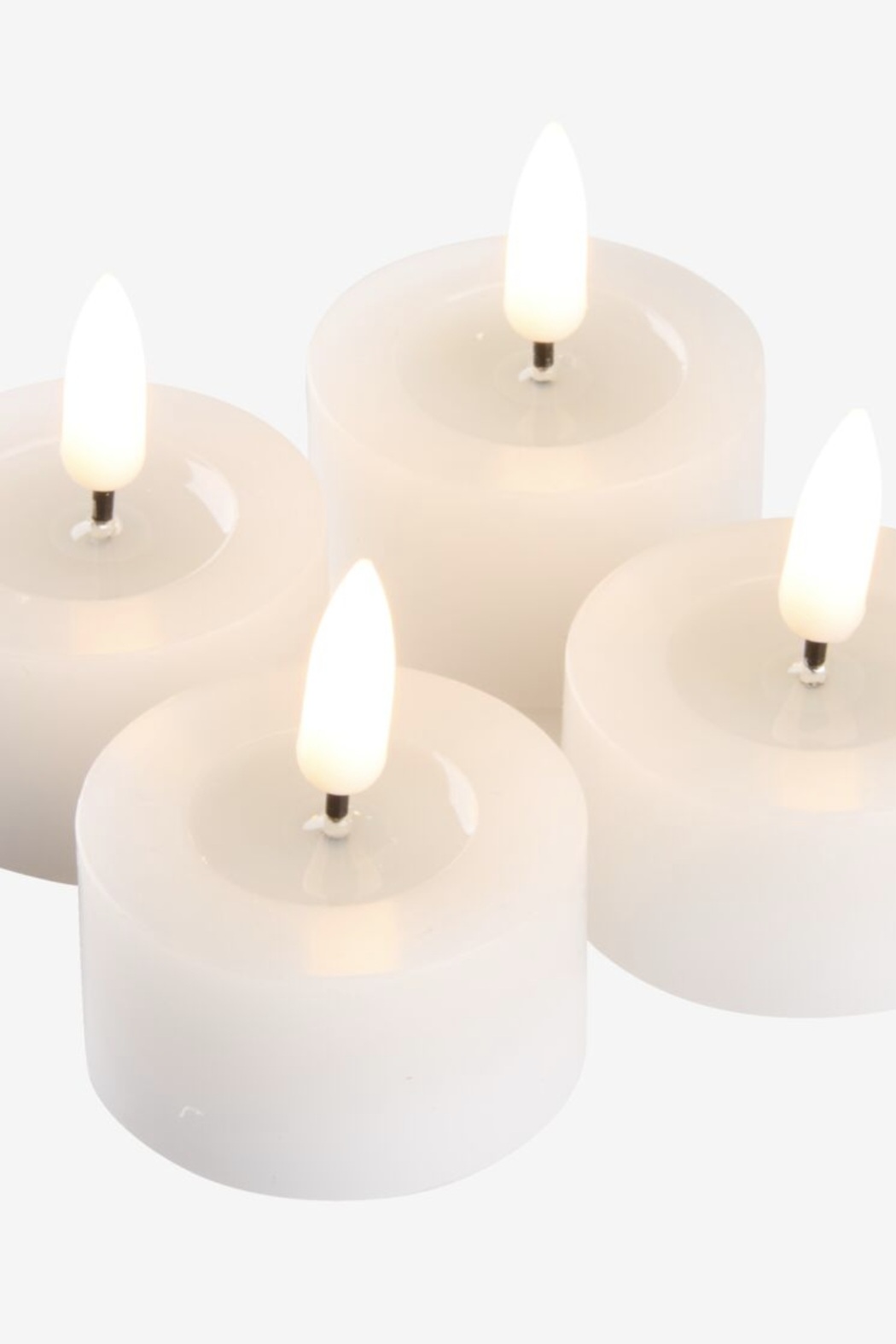 4ks bielych LED čajových sviečok s praktickou funkciou časovača. Majú klasický vzhľad vosku a poskytujú teplú, realistickú žiaru. Čajové sviečky vyžadujú batérie (nie sú súčasťou balenia). Š9 x D9 x V5 cm