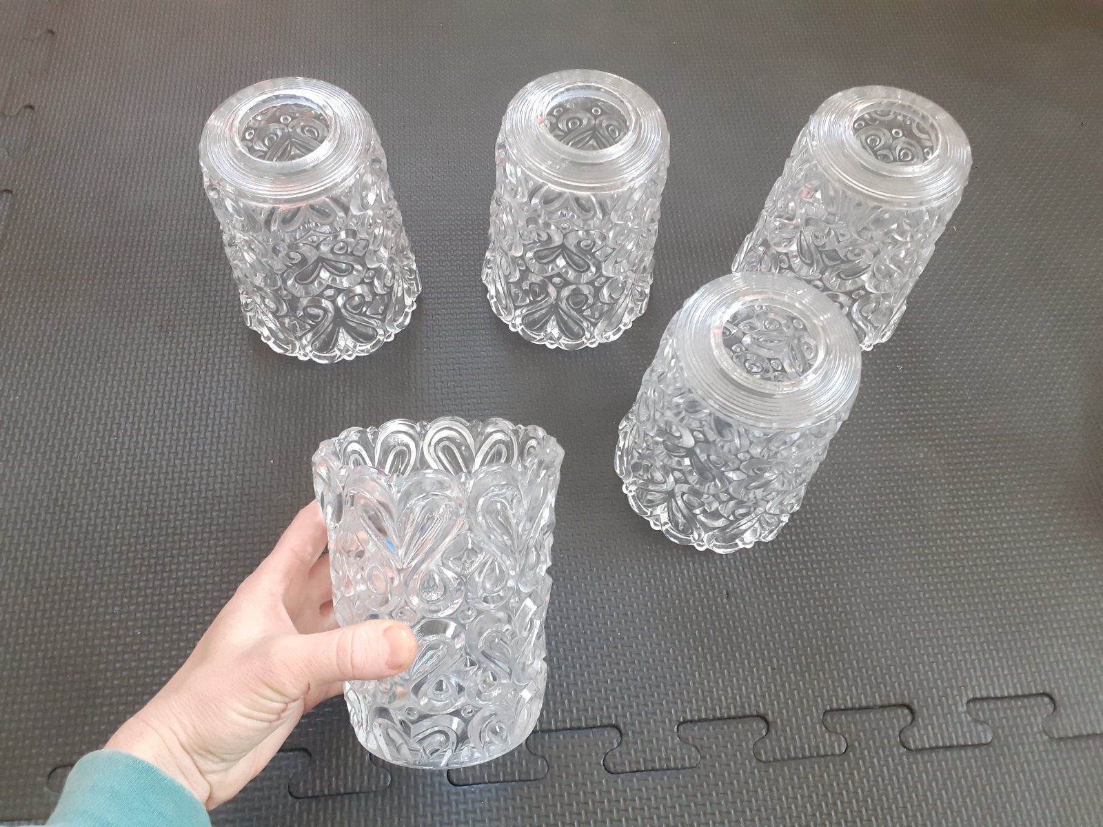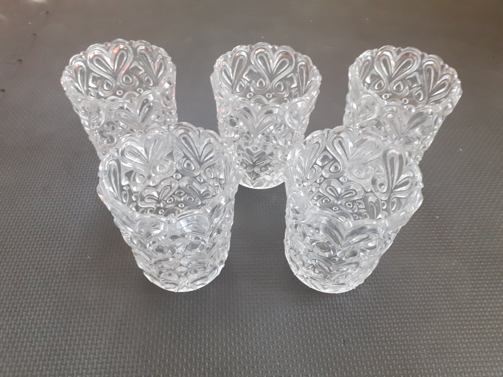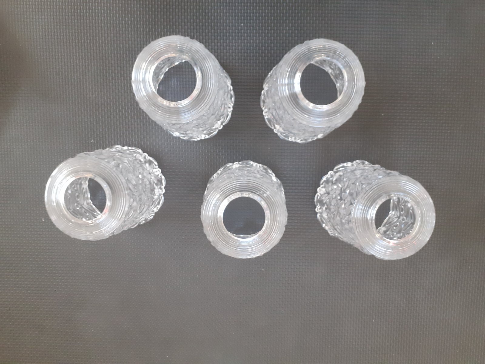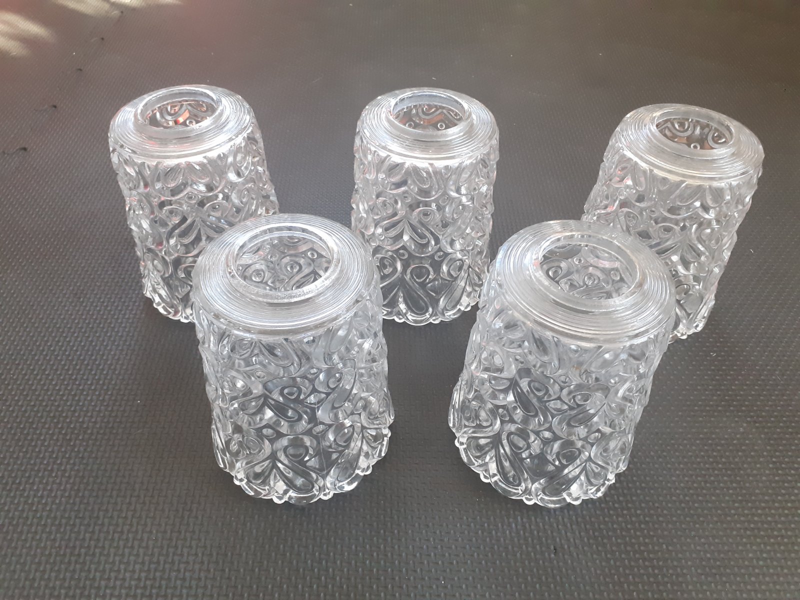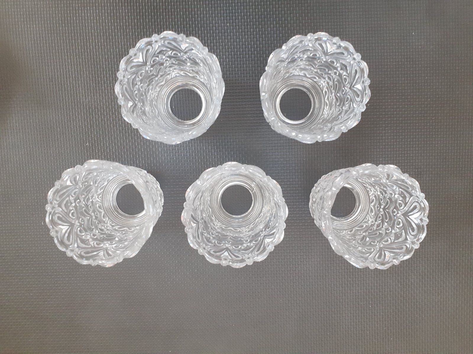 Predám staré sklenené kryty / tienidlá na luster / lampu / svietidlo. Sú z číreho skla, nie je to brúsené krištáľové sklo ale odlievané sklo, sada 5 kusov, zdobené reliéfnym ornamentom, v bezchybnom stave. Sú to tienidlá, ktoré sa nešraubujú ale nasadia sa na pružné oceľové plechy, ktoré ich zafixujú. Možno sa niekomu budú hodiť na svoj starší luster.
