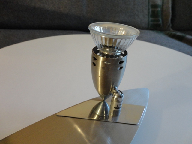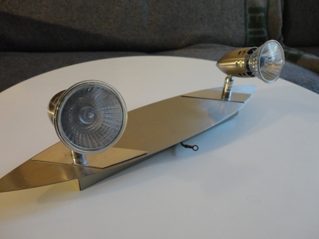 Predám bodovú LAMPU – nástenné bodové osvetlenie. 2x bodovky v tvare špicu na oválnom plochom stojane, materiál: nerez. Svetlá majú nastavitelný sklon – 90 stupňov.
