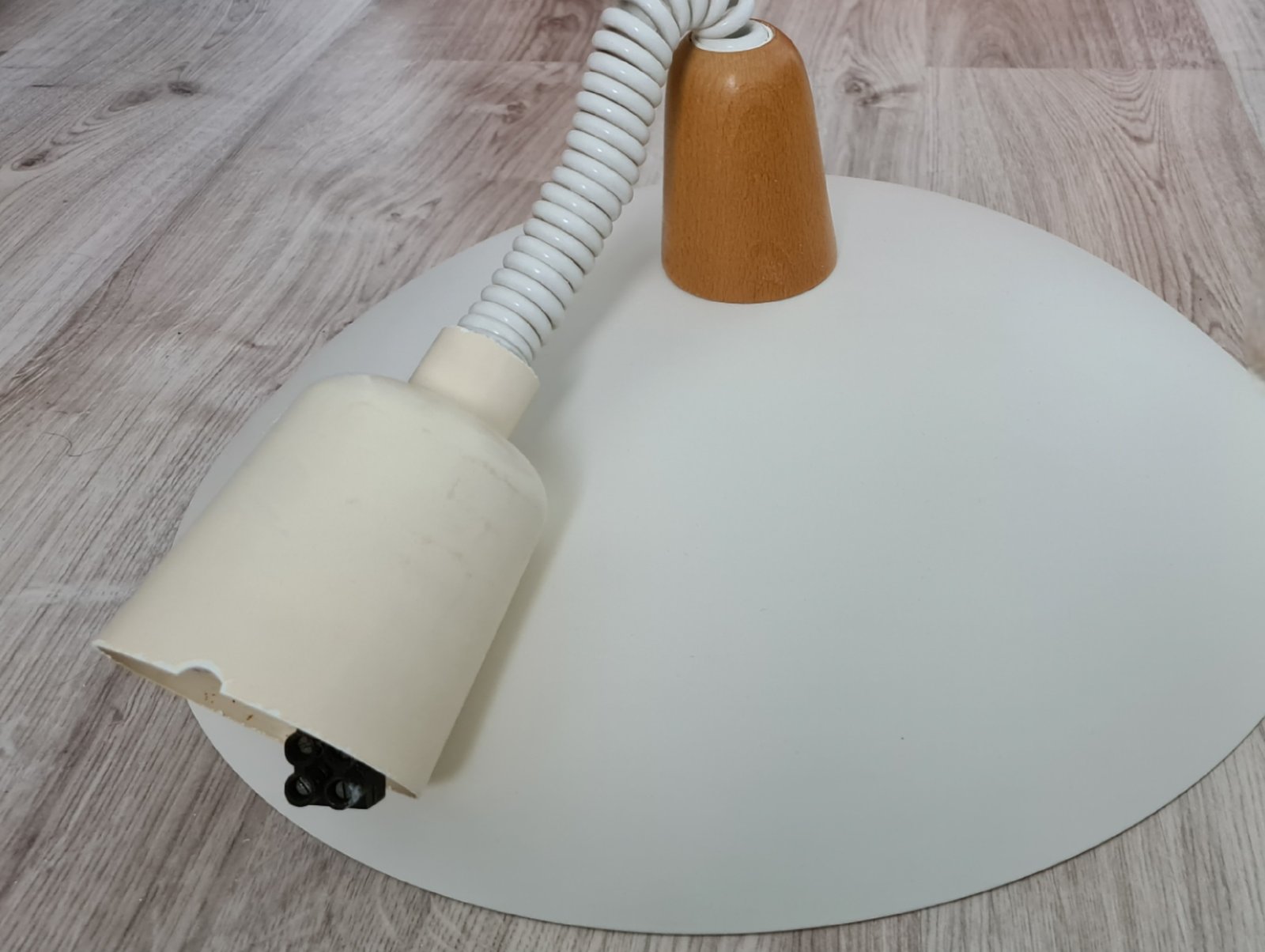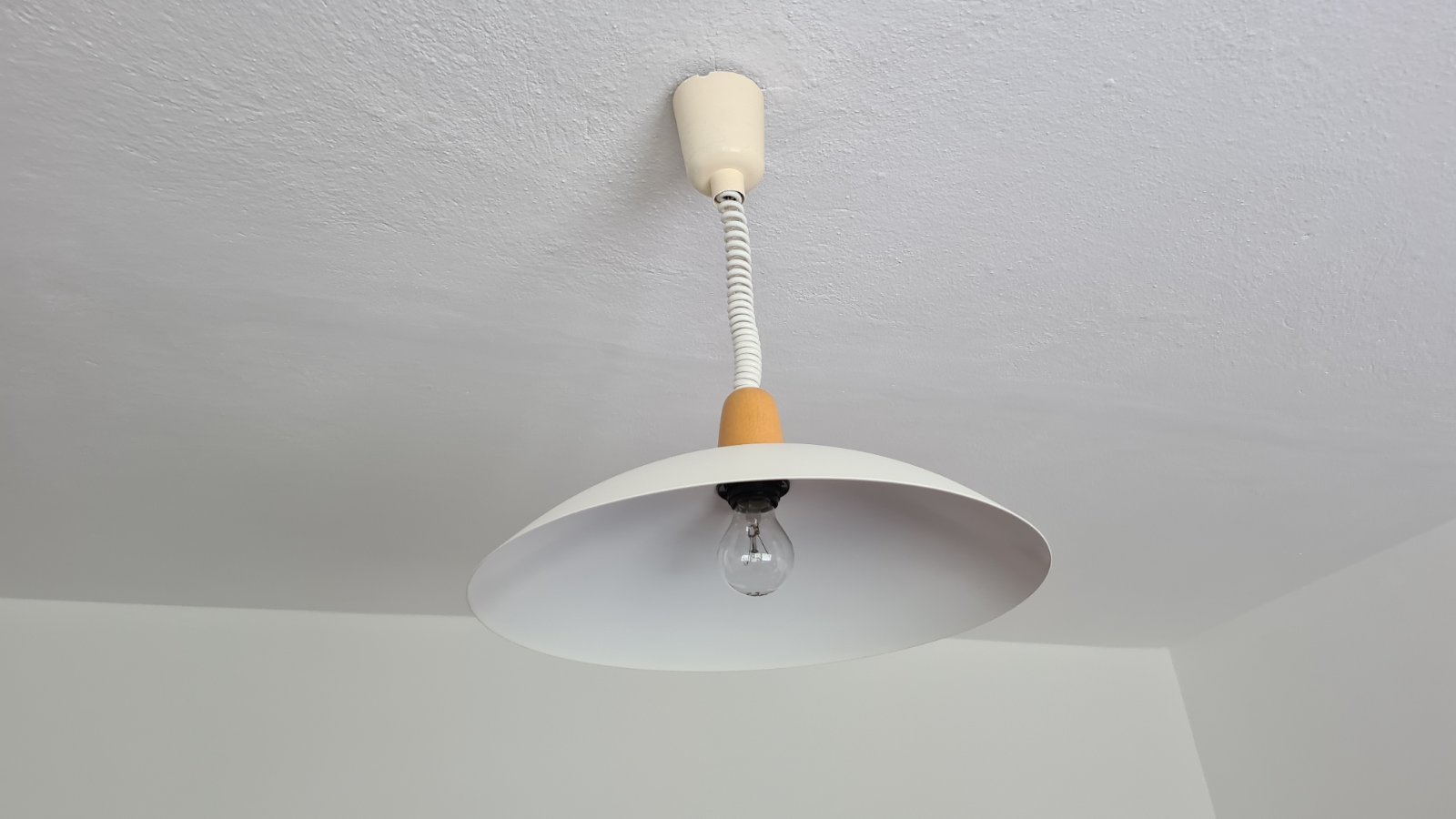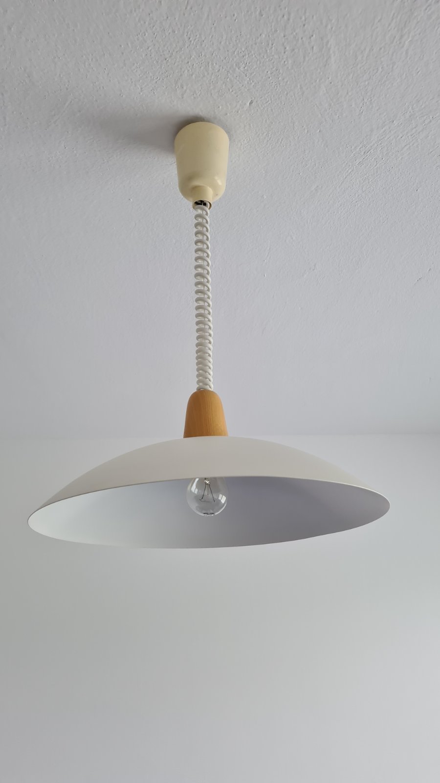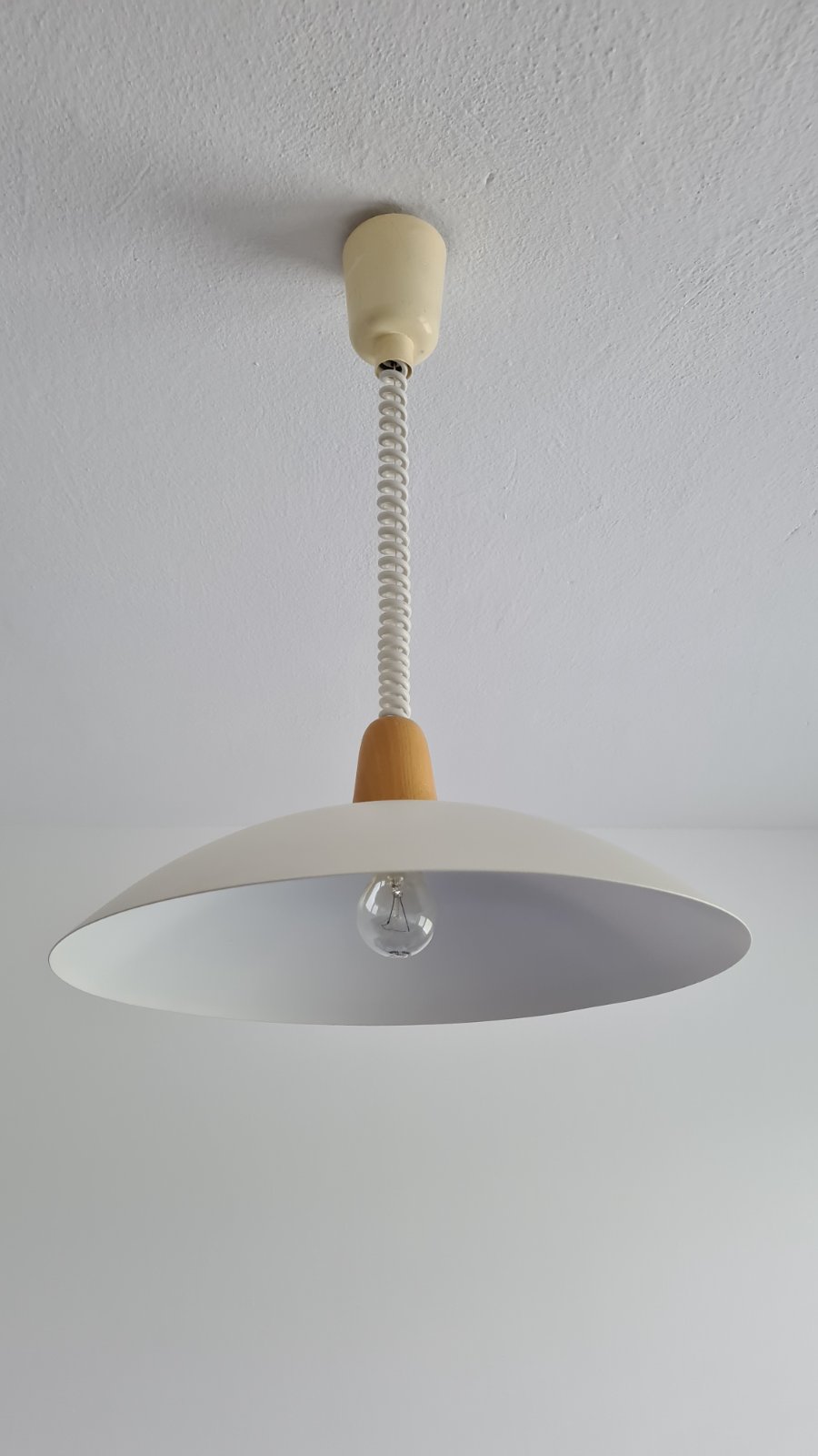 Predám závesné svietidlo bielej farby s dreveným detailom. Svietidlo je používané, ale plne funkčné. Z hornej krytky je trochu odlomené, čo je vidno na fotke. Svietidlo je možné výškovo nastavovať pružinkou, ktorá je veľmi pevná a stabilná. Závit na žiarovku je E27.