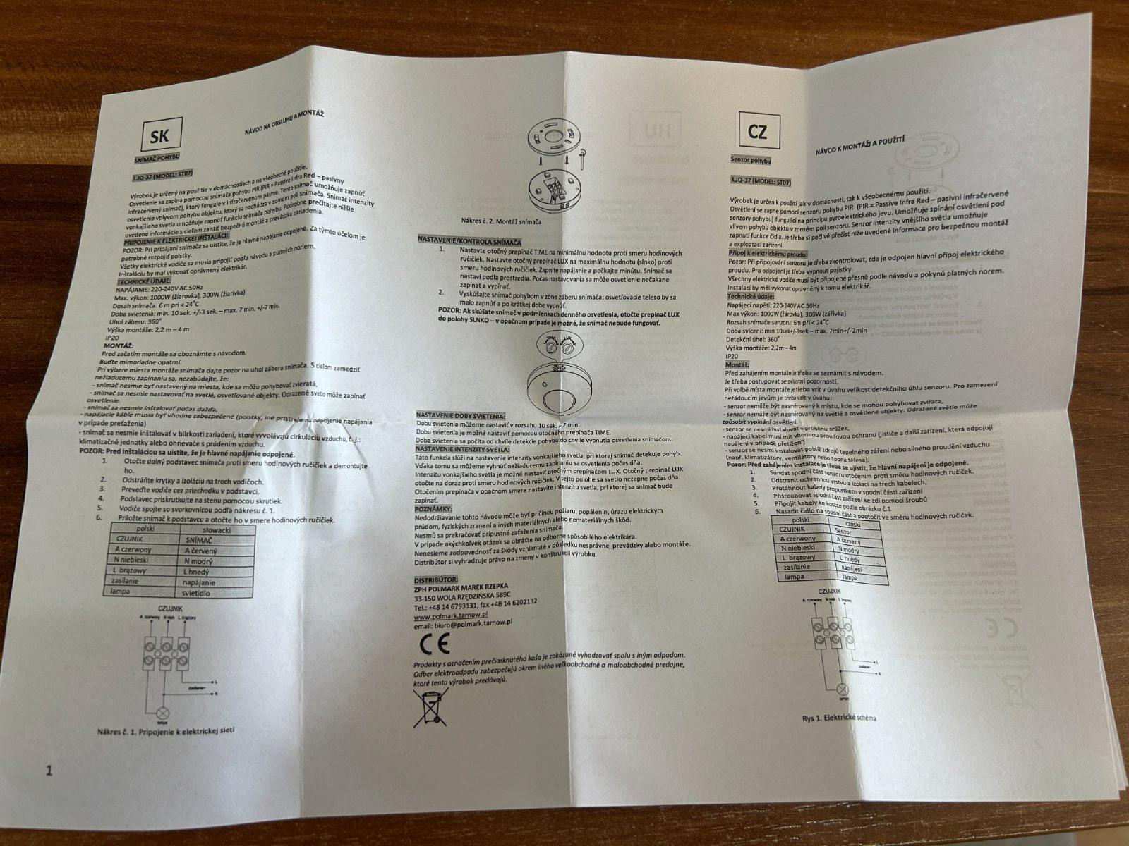 Balenie obsahuje - snímač, montážny návod, a hmoždinky a šróby na upevnenie