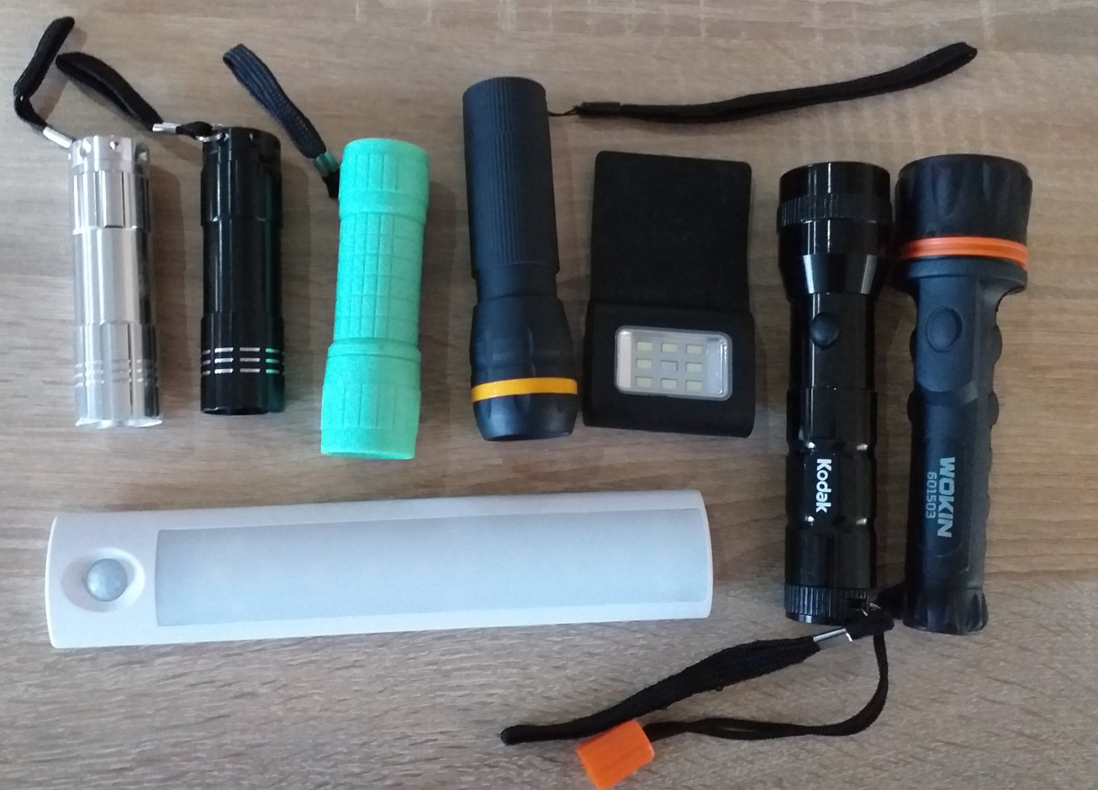 Všetky v 100% stave, bez bateriek. AAA alebo AA. Menšie v hornom rade po 1.50 eur, väčšie na kraji po 3 eur, veľká biela LED lampa s dvomi režimami 7 eur.