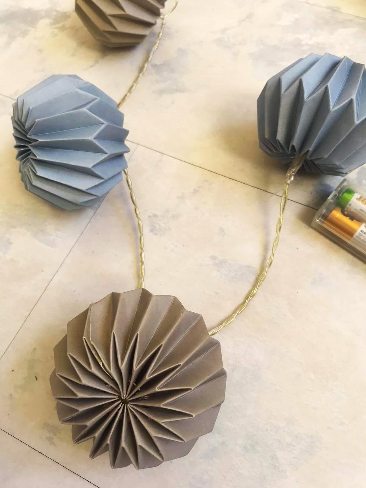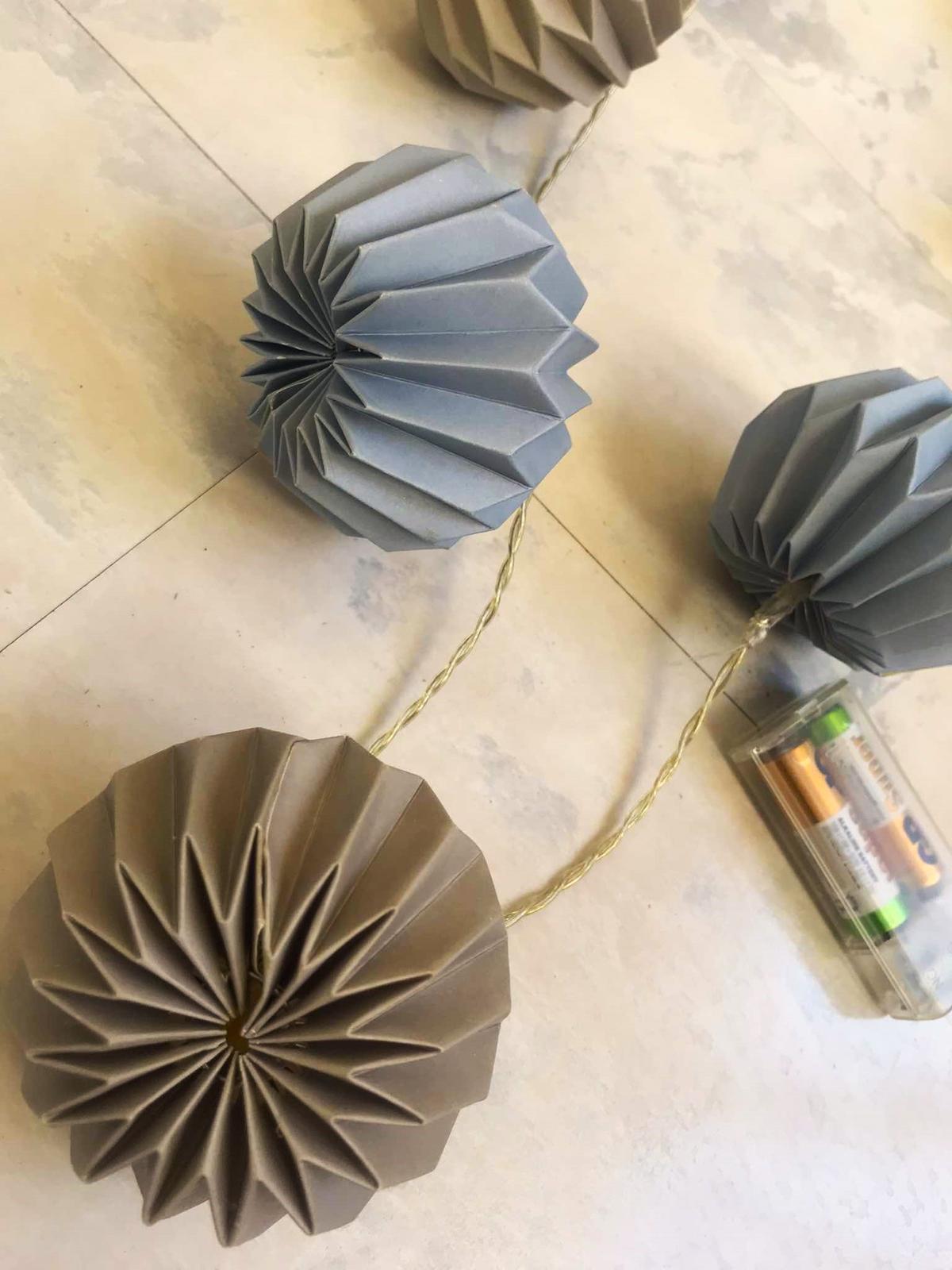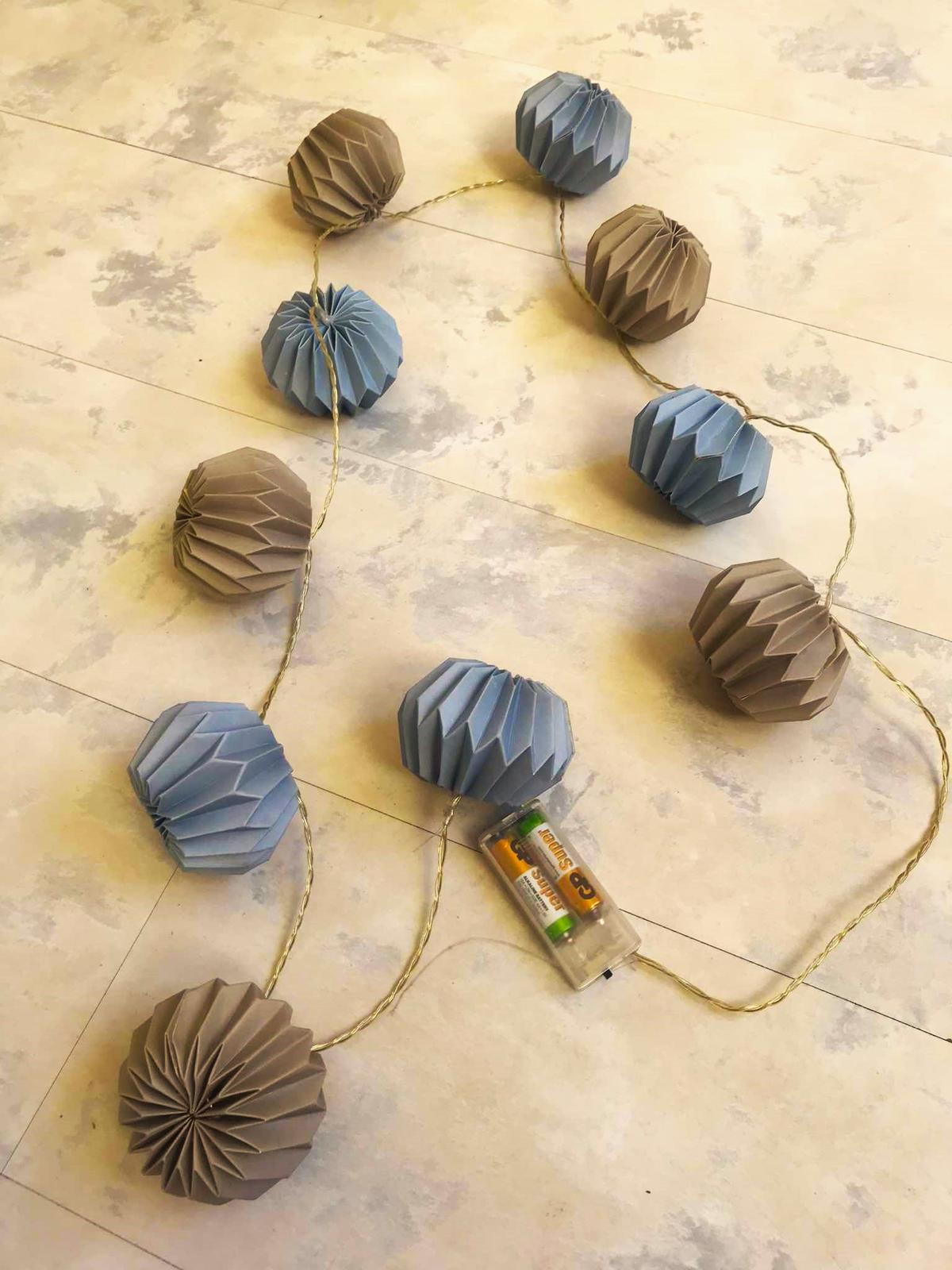 pekná dekorácia, vhodná aj do detskj izby,10 ks,jemné odtiene pastelovej oceľovo-modrej a studenej béžovo hnedej,je to pevný kartón a dnu sú žiarivky,dlžka kábliku cca 160 cm,LED 3V/20mA,výška lampiónu = 7 cm, šírka v najširšej časti = 8 cm