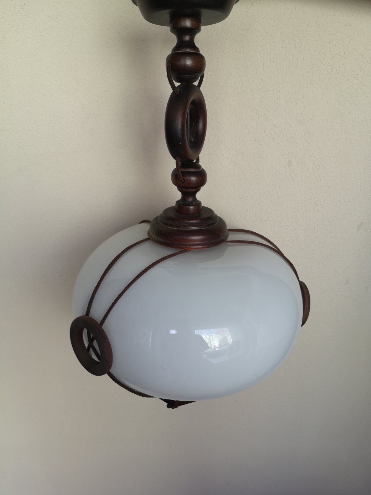 Ponúkam krásne stropné retro svietidlo, kombinácia sklo a drevo. Bez poškodení. Súčasťou je aj žiarovka E27.