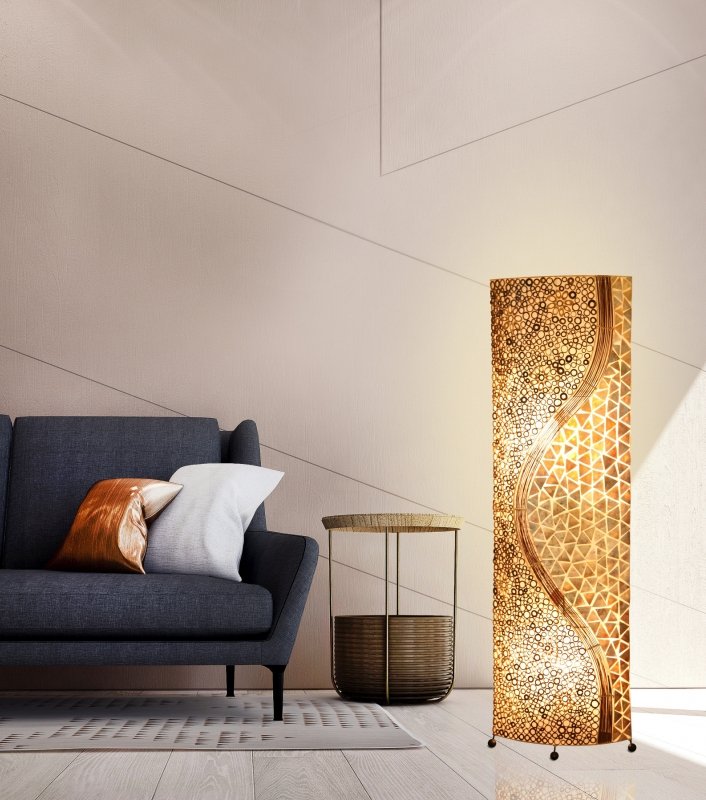 Stojanové svietidlo- Dizajn svietidla je inšpirovaný orientálnou kultúrou. Telo lampy je z kovu a plastu a morských ulít.