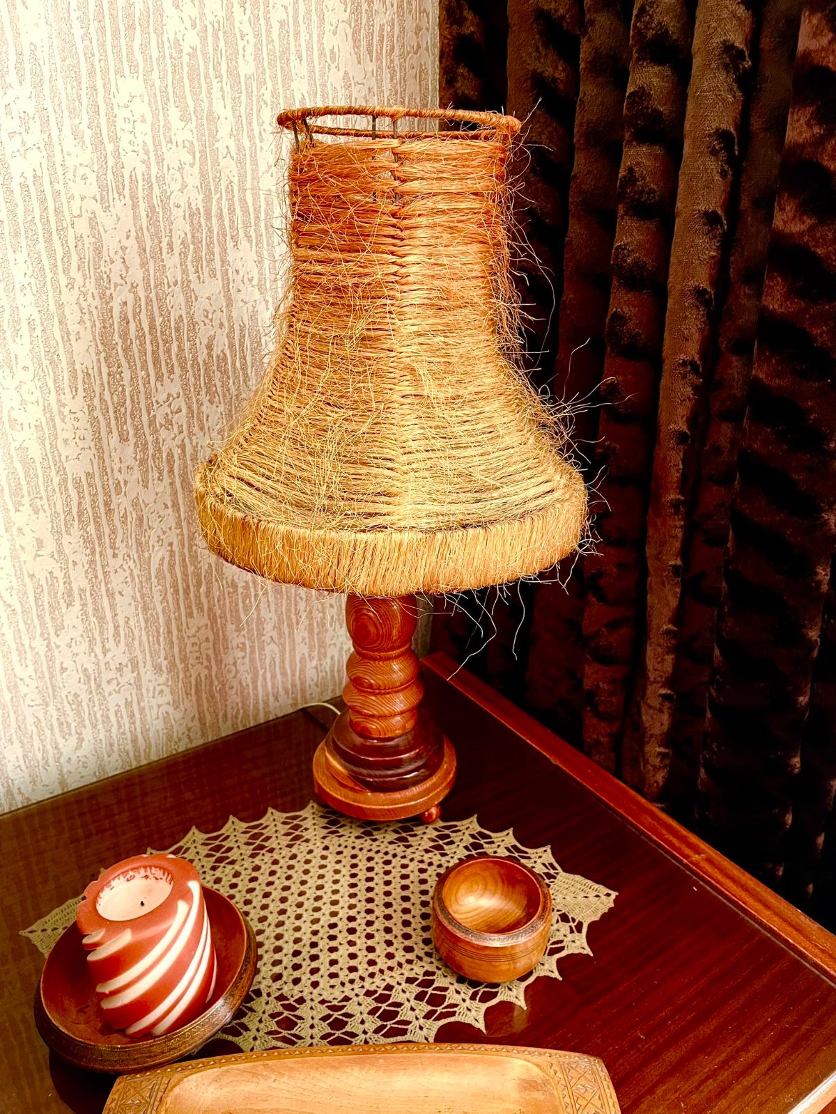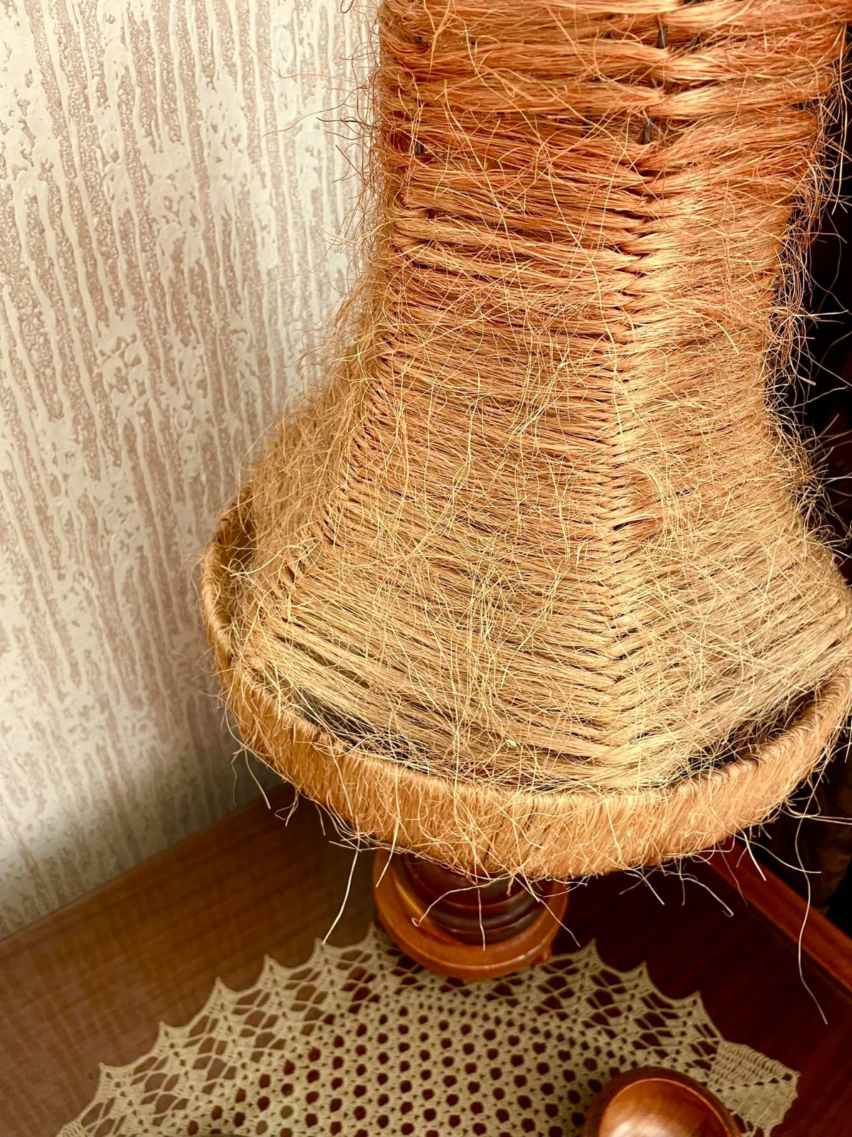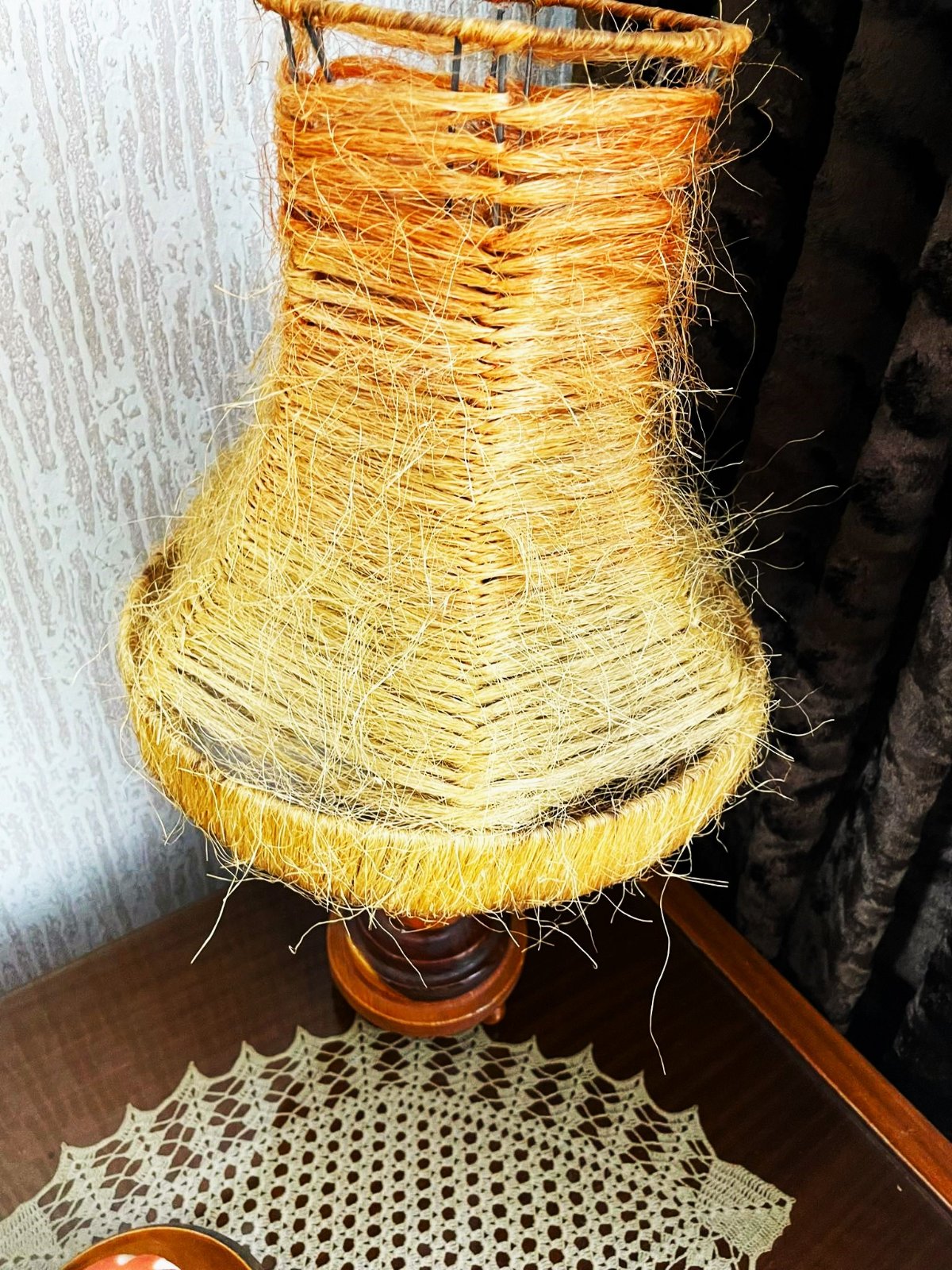 krásna naturálna lampa,klobúk je zo sisalu a nasadí sa na žiarovku,jemne tieňovaný,super aj do chaty,ale nielen, tienidlo vydáva krásne teplé žlto oranžové svetlo,výborne sa udržiava - iba sa vysprchuje, je to prírodný materiál, - je treba dorobiť el.kábel s vypínačom - šikovný kutil to vie jednoducho urobiť,pozri k tomu aj :