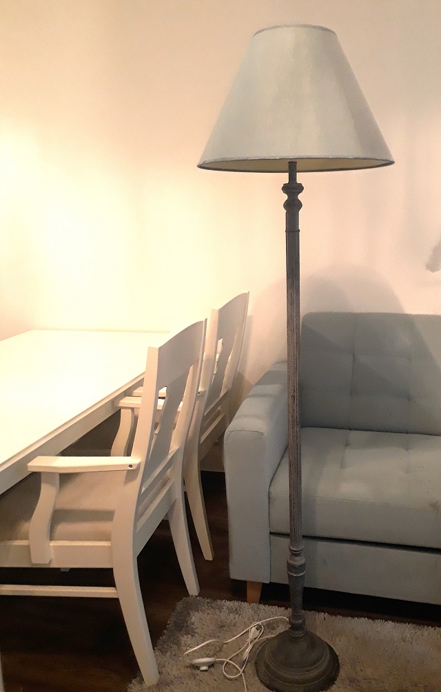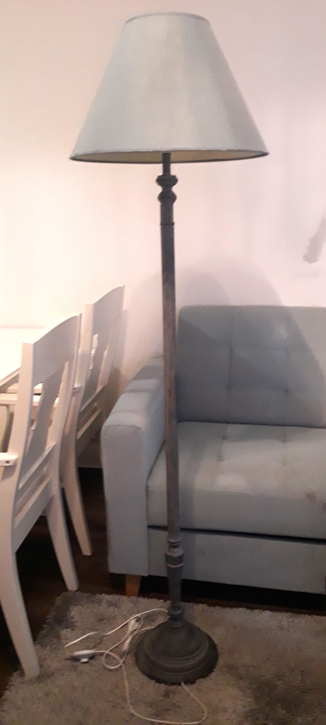 Predám stojacu lampu, ako nová, nepoškodená. Klobúk je tyrkysovo modrej farby, stojan drevený, sivý patinovaný. Pôvodná cena 125 eur.