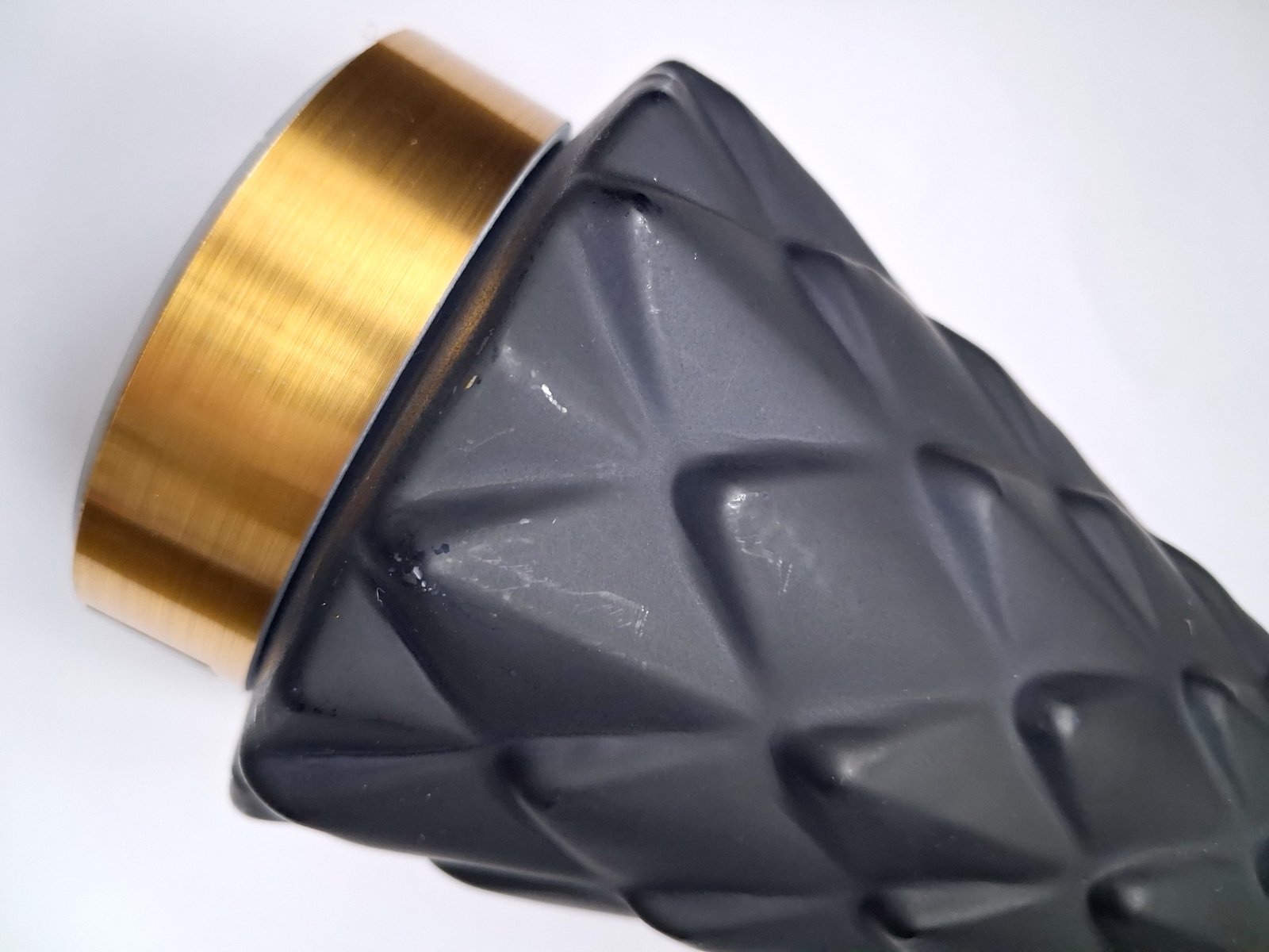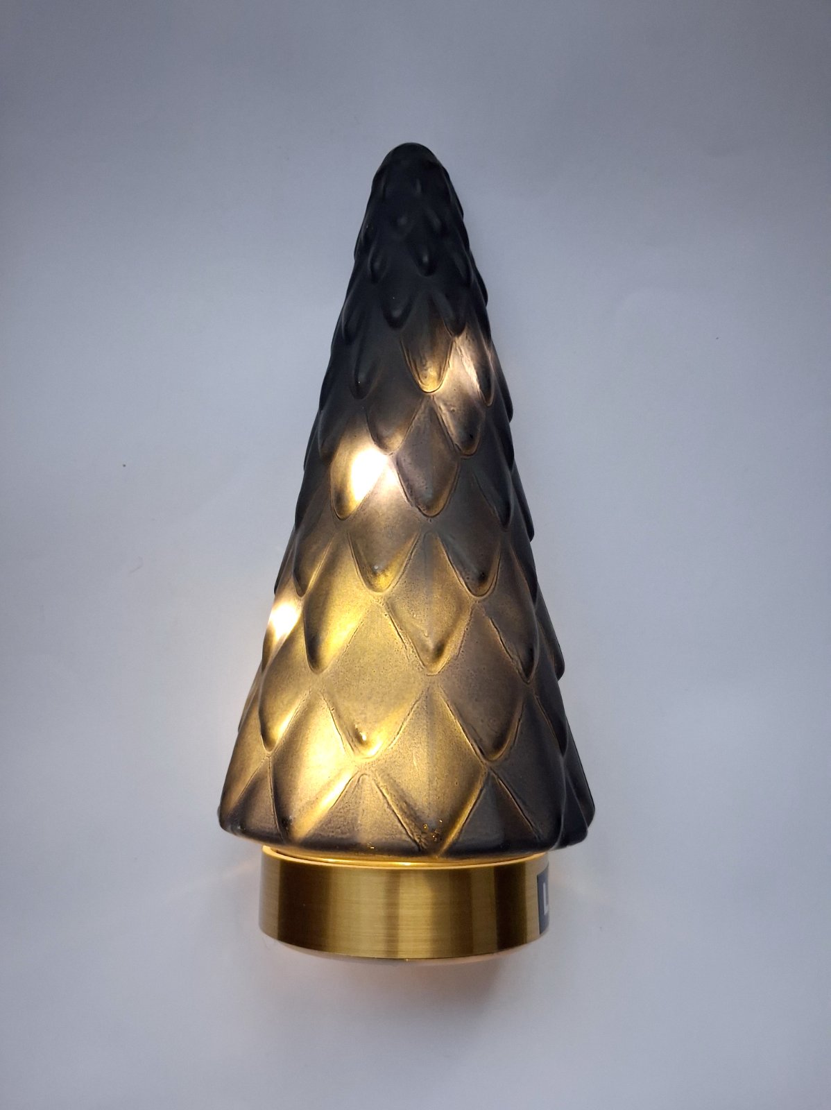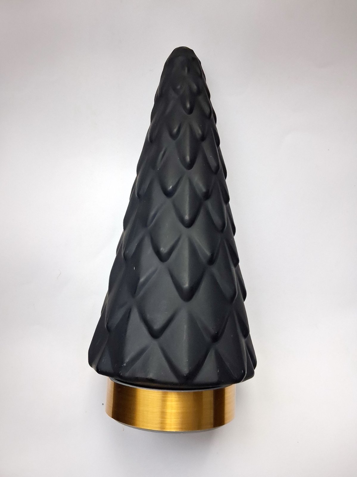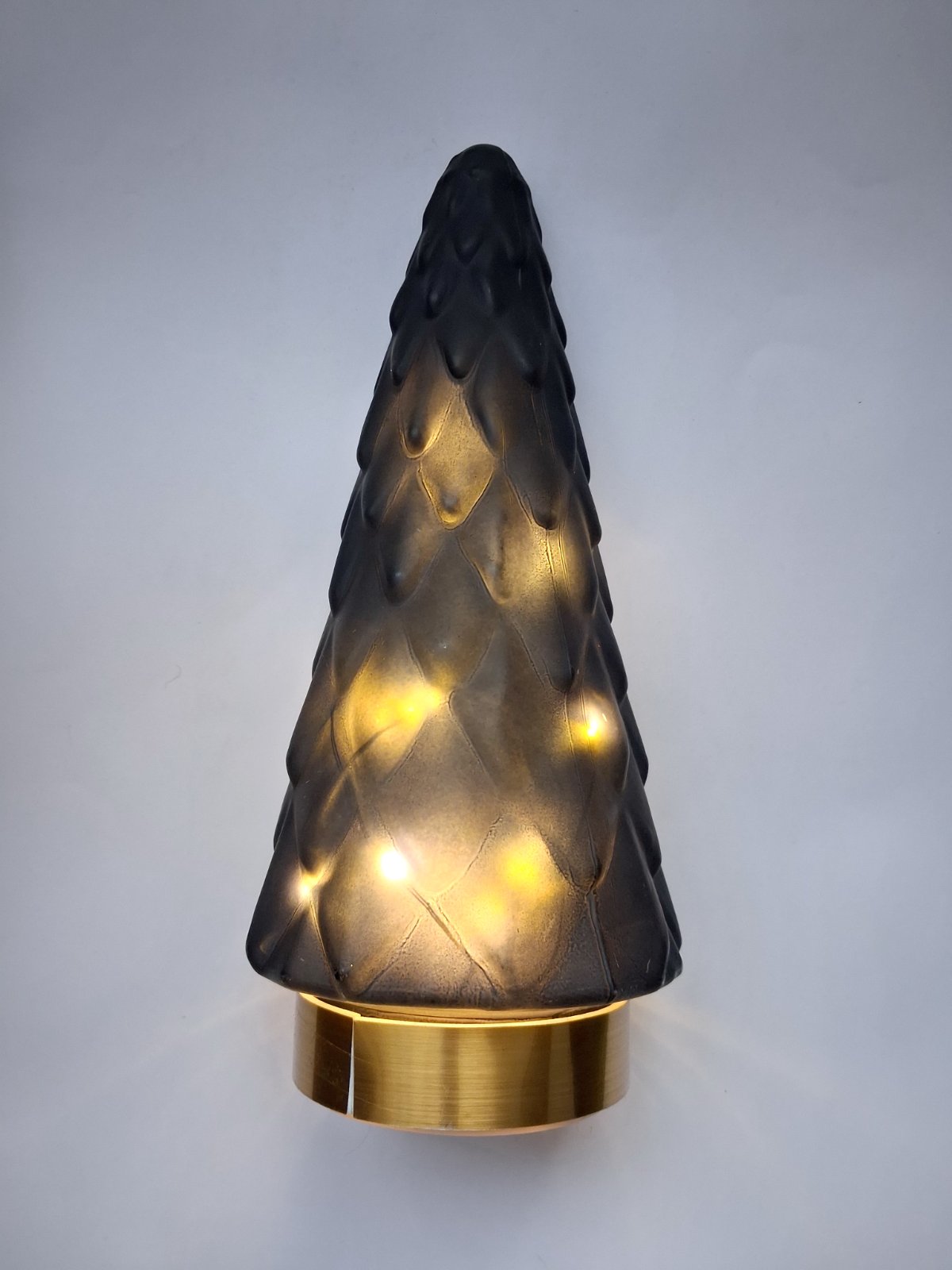 Vianočná dekorácia - lampička - sklenený stromček na baterky. Čierne matné sklo a zlatý kovový spodok. Idú doň 3 AAA batérie, predávam BEZ batérií. Na skle sú sem-tam malé šuchnutia, nie príliš nápadné, zvlášť, keď svieti. Dole na poklope na batérie chýba skrutka na jeho uchytenie, no vôbec ju netreba, pretože to veľmi dobre drží aj bez nej, nevypadáva. Výšku odhadujem na cca 20 cm, v prípade záujmu odmeriam.