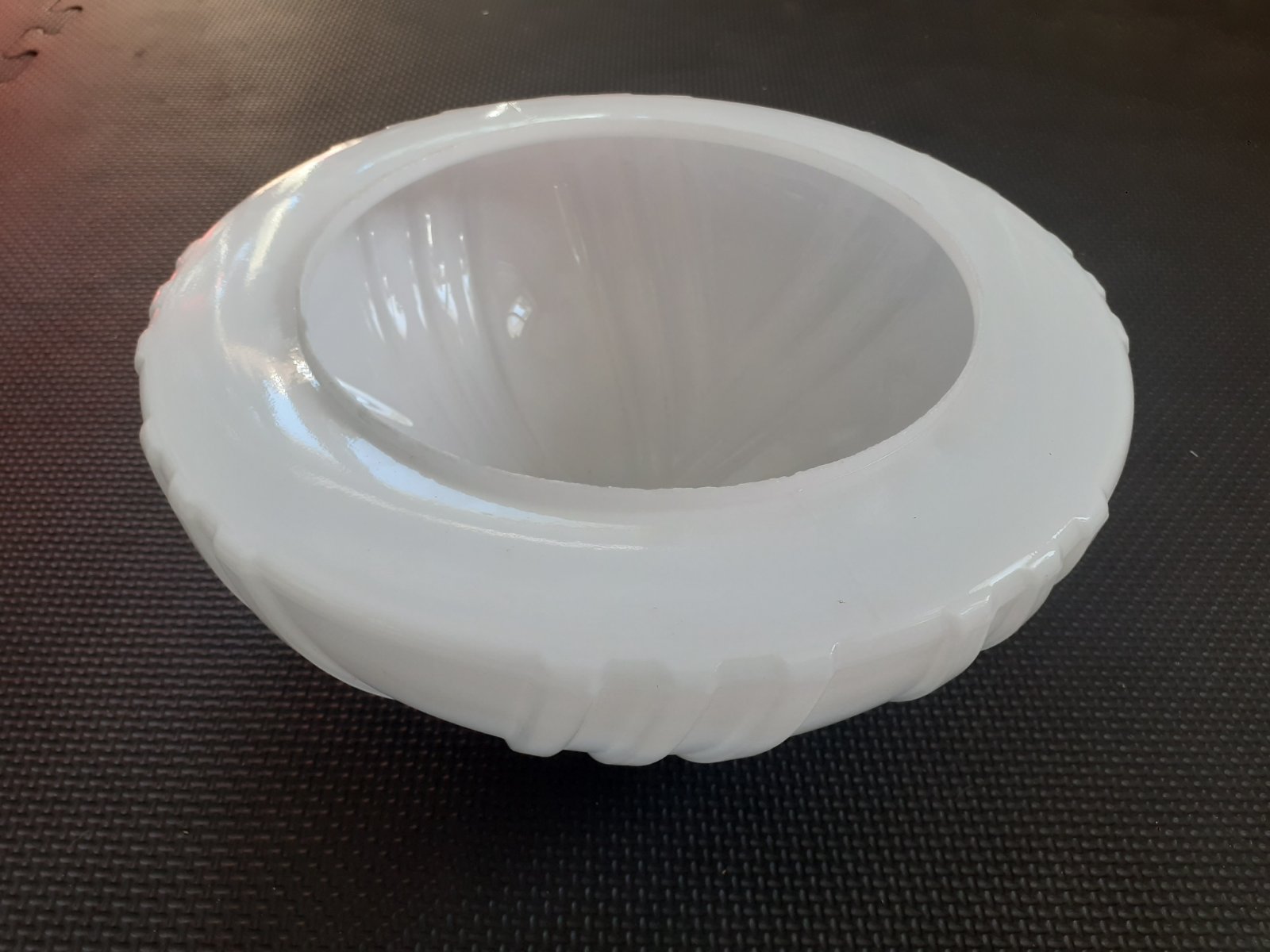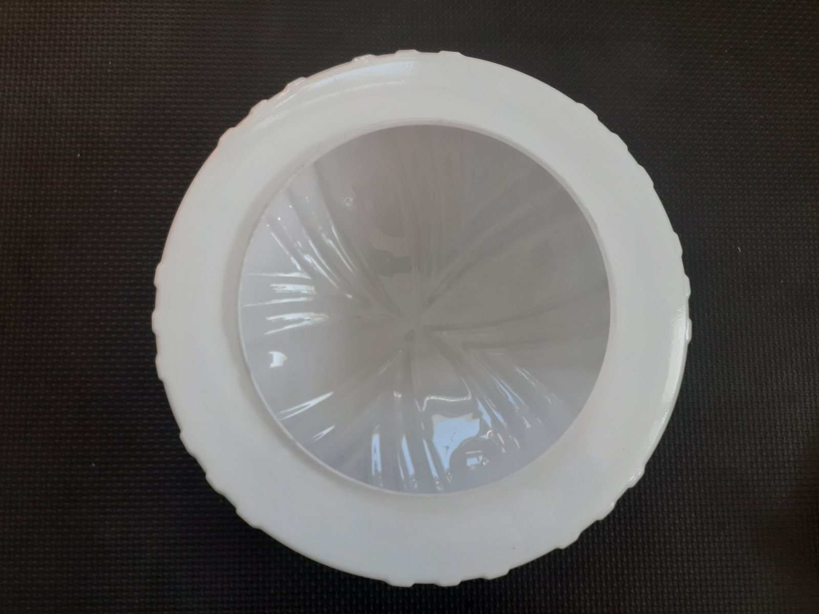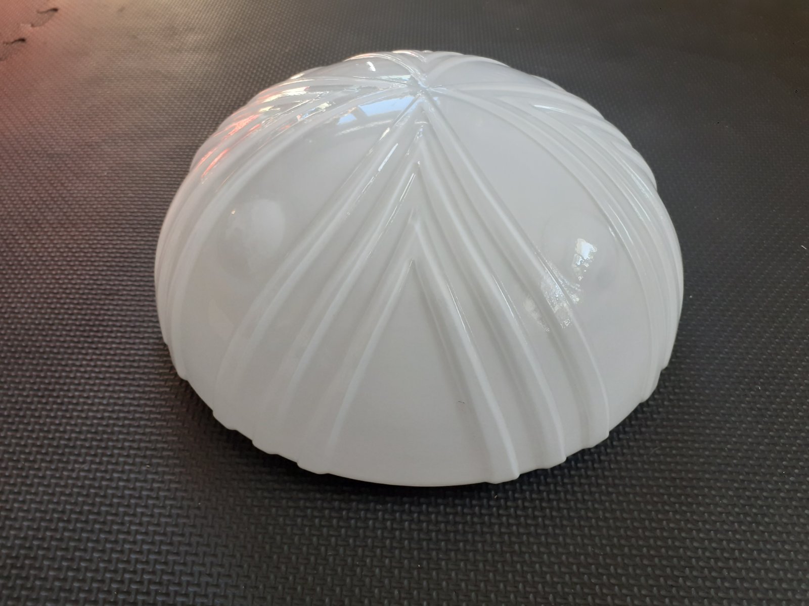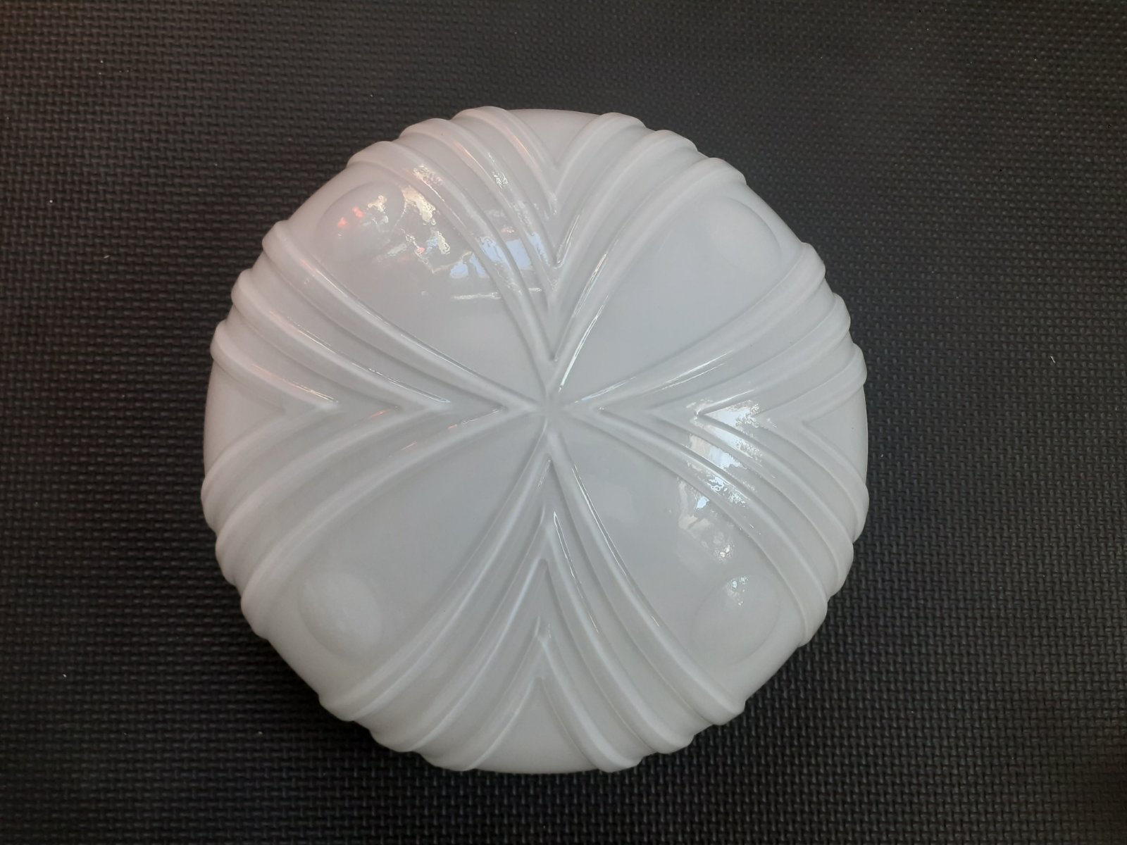 Predám staré, v bezchybnom stave, socialistické veľké sklenené kryty / tienidlá na stropné svietidlá / lampy / lustre. Používali sa vo vestibuloch, halách, chodbách, veľkých miestnostiach. Sú z mliečneho skla s reliéfnym geometrickým vzorom. Môžu mať využitie aj ako obal na kvetináč / črepník / kochlík.