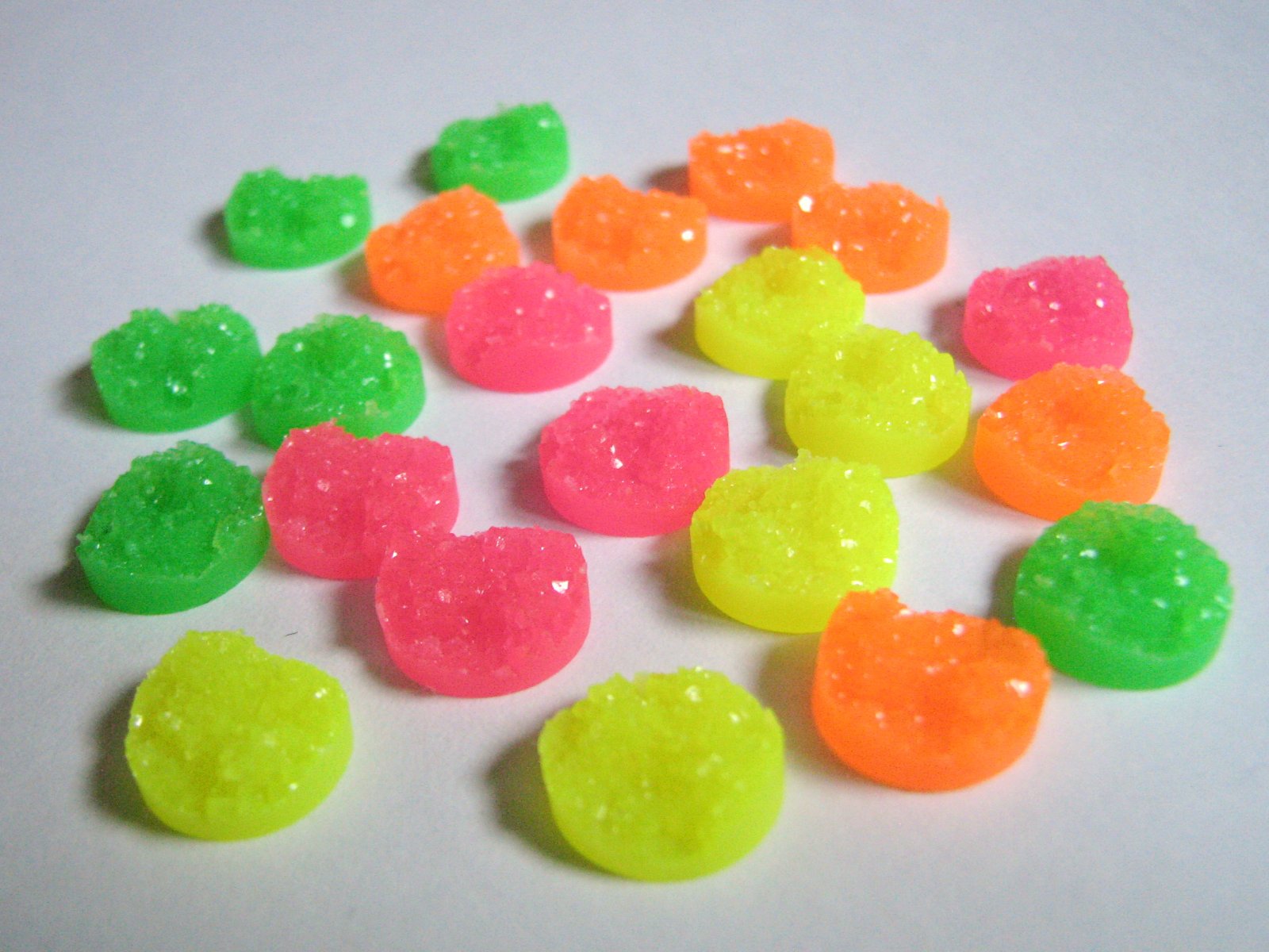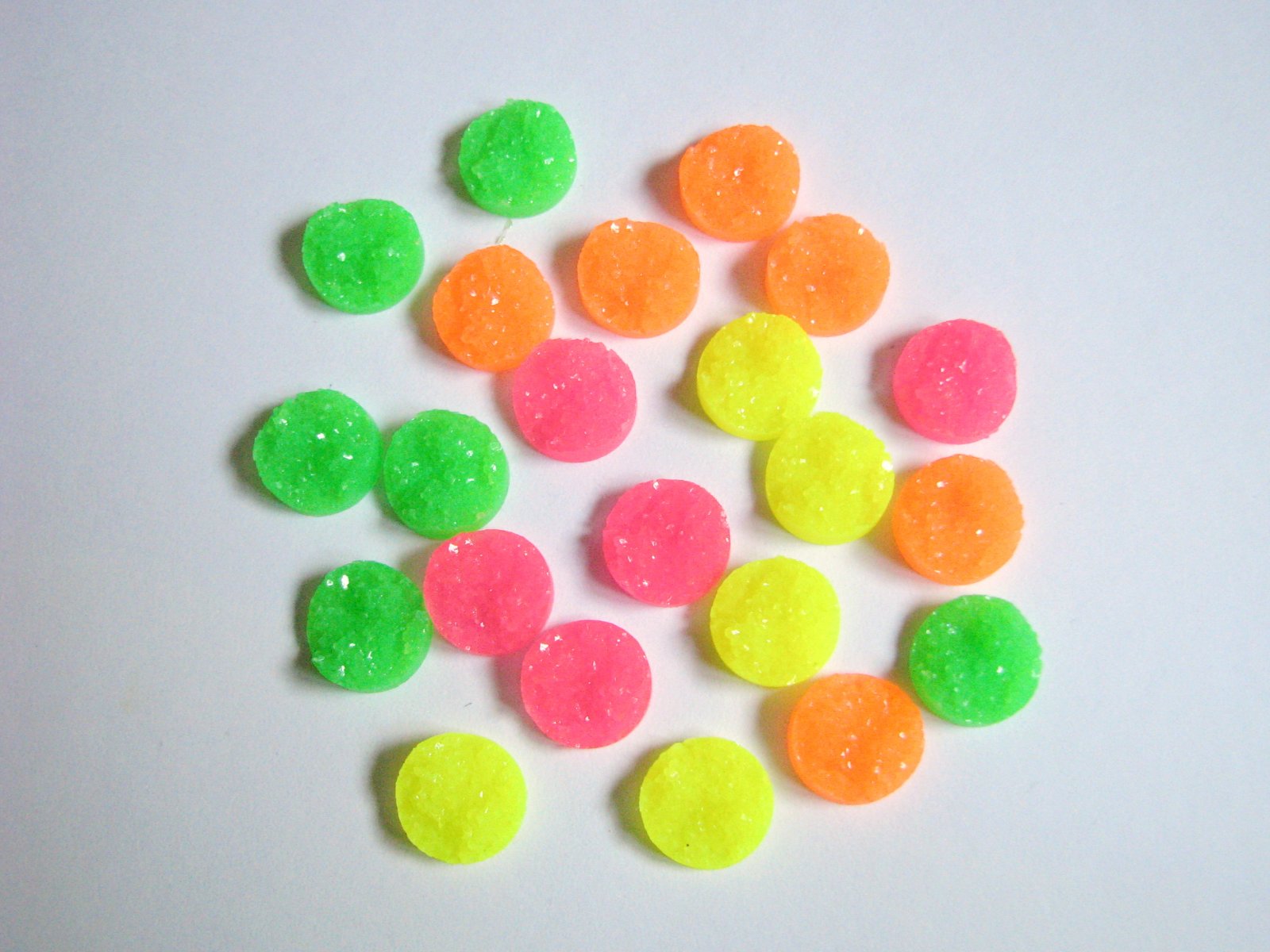 Plastové kabošony s priemerom 12 mm, s akoby kryštalickým povrchom, v neónových farbách - ružovej, zelenej, oranžovej a žltej. Nevyužité.