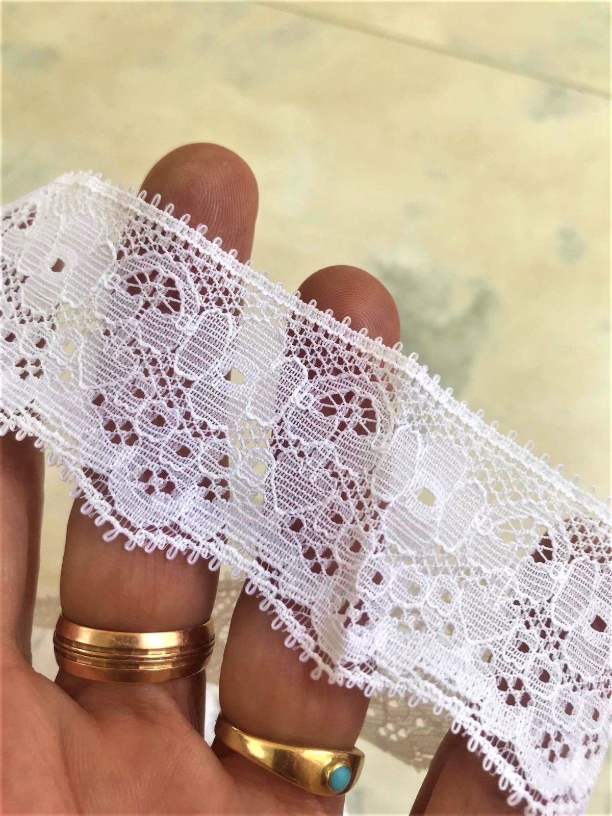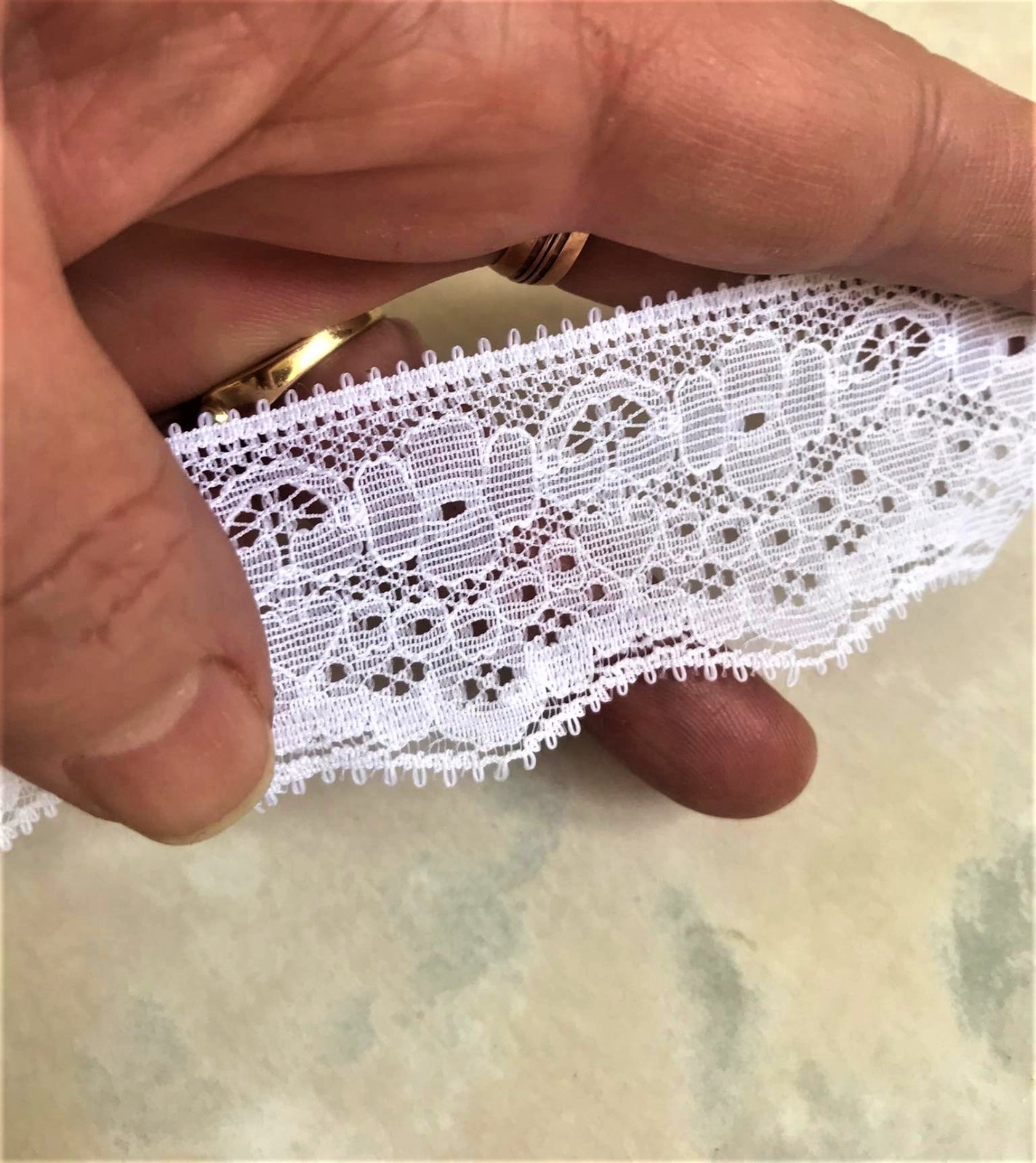 zbytok syntetickej čipky,nie bavlnenej,ozdobí blúzky, šaty, saká i bytový textil,1.kus =,6 metrov,šírka 3 cm,2 kus = 5 x 97 cm