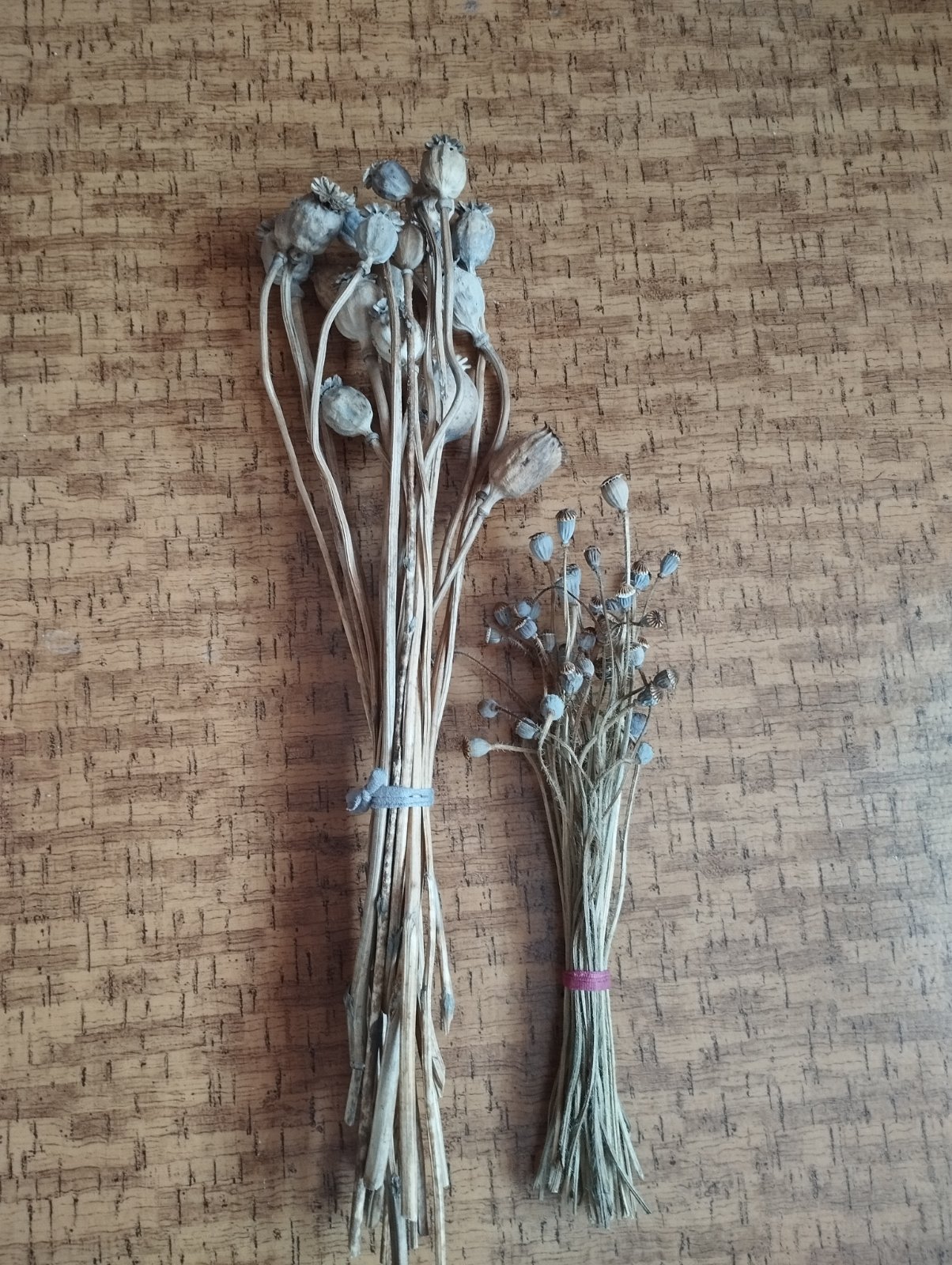 Sušené makovice vhodné na ďalšiu tvorbu - aranžmán do ikebán a kytic. Vľavo sú 20 ks makovičky s priemerom cca 2,5 cm. K tomu je aj kytička divých makov.