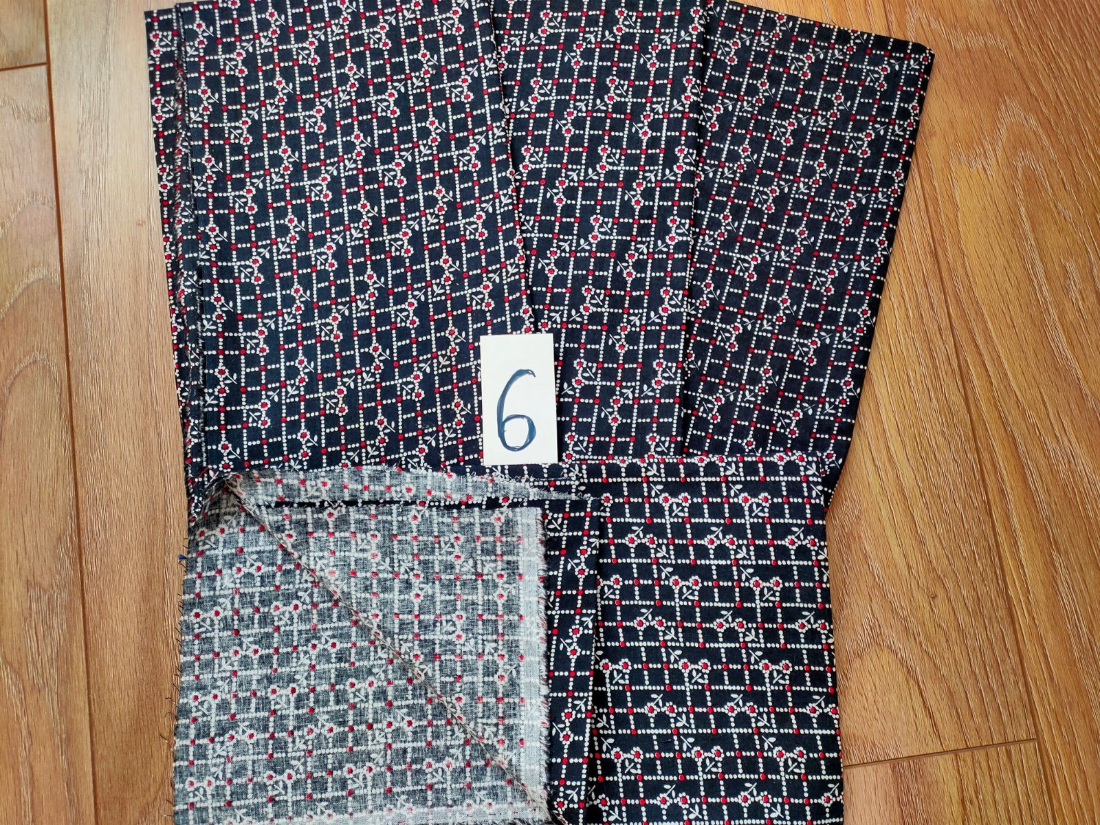 6.Tkanina,bavlna,kvietky,červené a biele gulicky,4ks rozmer 0,64x0,76,cena 8€