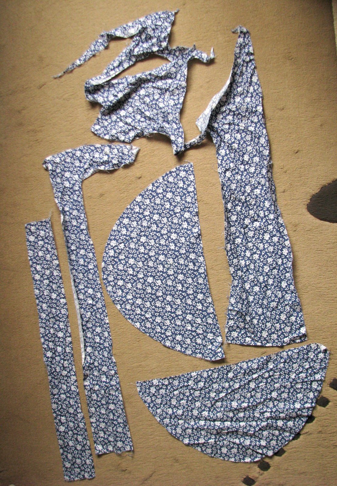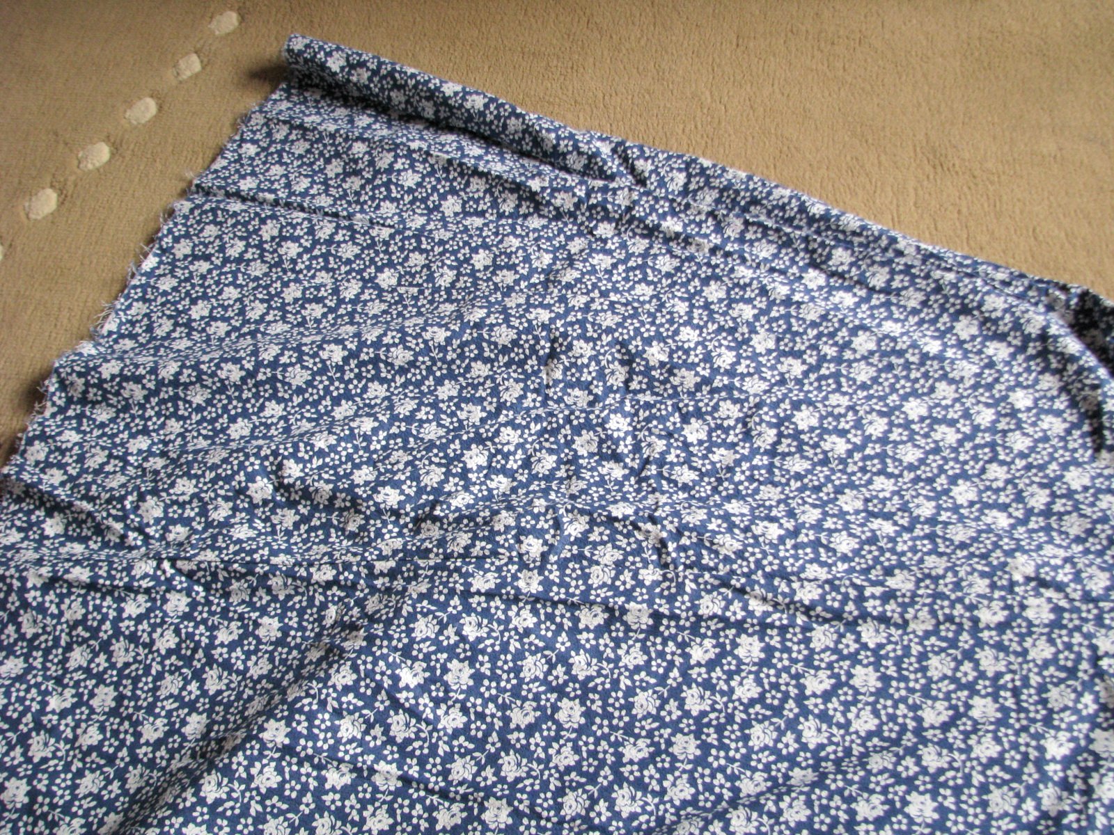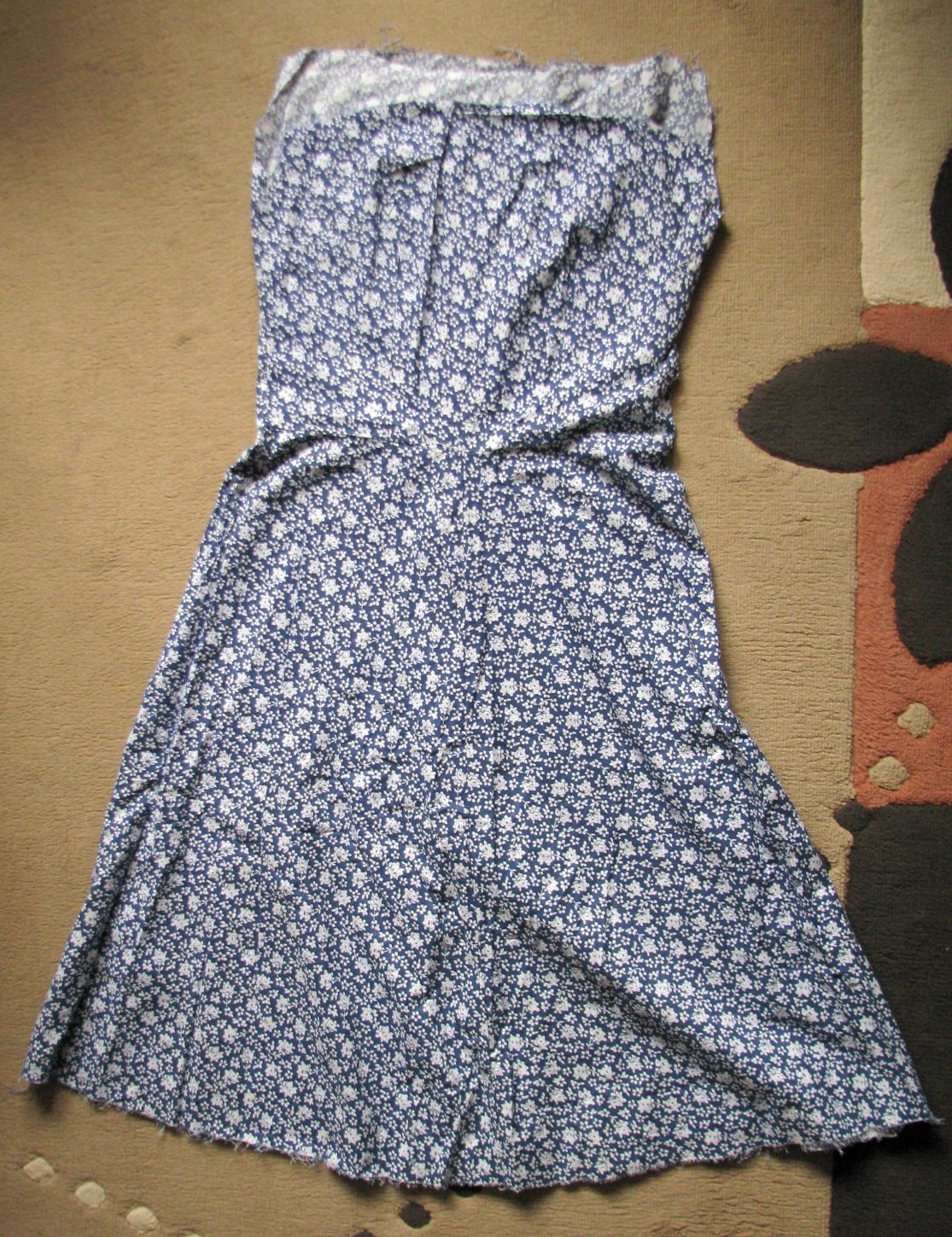 Nedošité vintage šaty z bavlnenej látky pripomínajúcej modrotlač - modrá s bielymi kvietkami. Na hornej časti predného dielu sú na látke viaceré malé hrdzavé fliačiky, ktoré nešlo vyprať. Možno by ste si z nich vedeli ušiť šaty v trochu inom strihu, prípadne sukňu. Pridávam aj odstrižky látky.