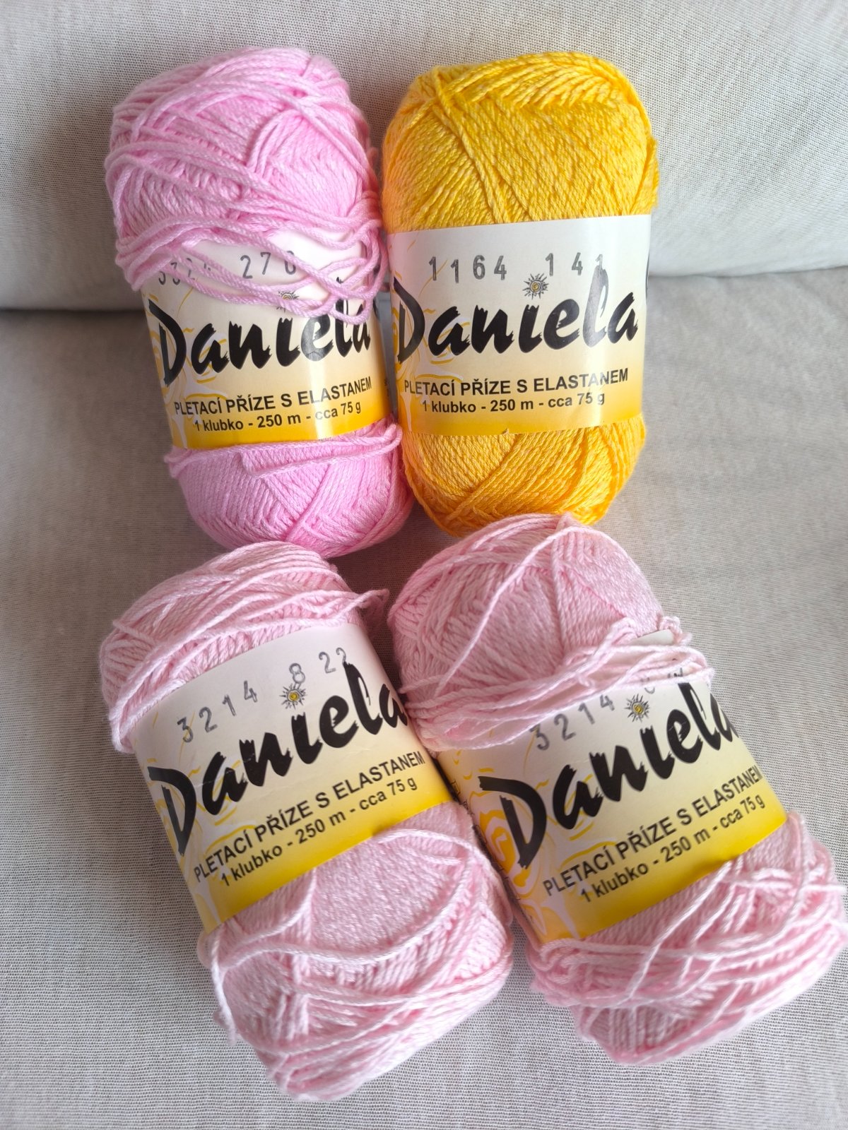 Dve bledo ružové majú číslo farby 3214, ružová je 3324 a žltá 1164..