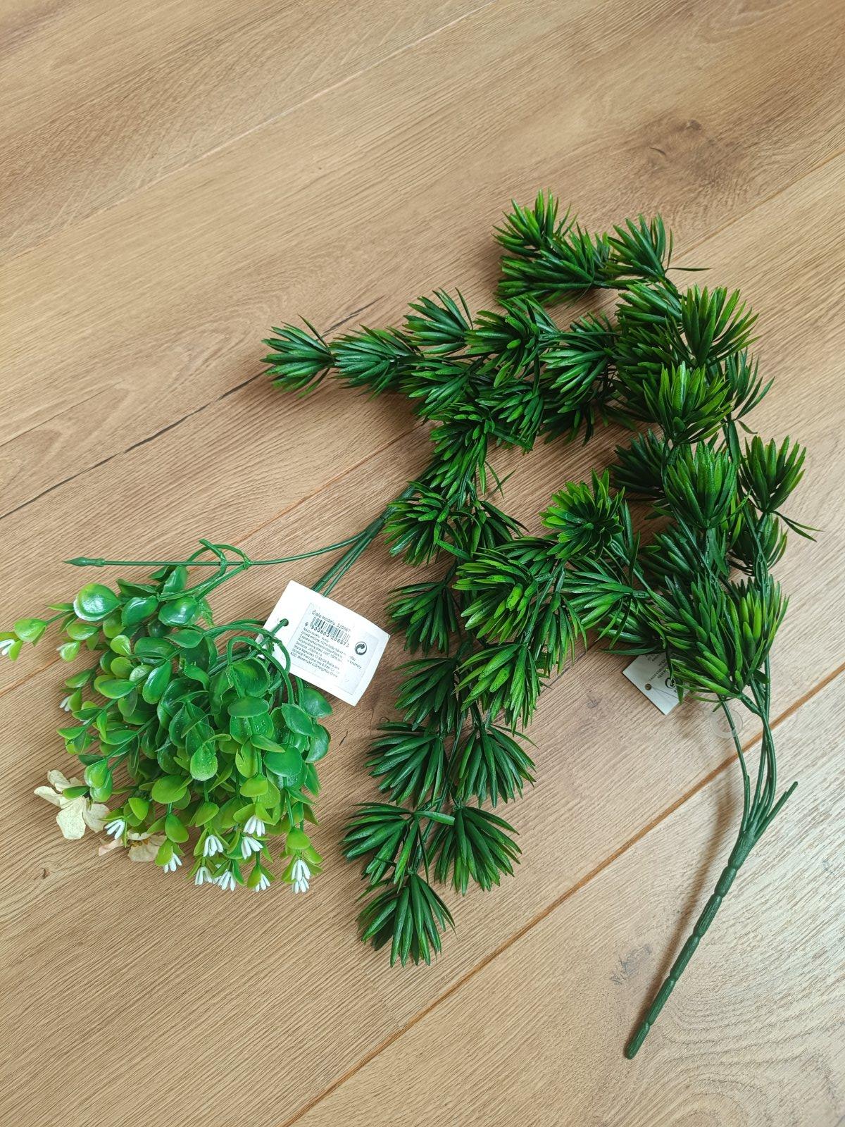 Plastova kytica a retaz s listami, vhodne na kreativnu dekorativnu tvorbu.