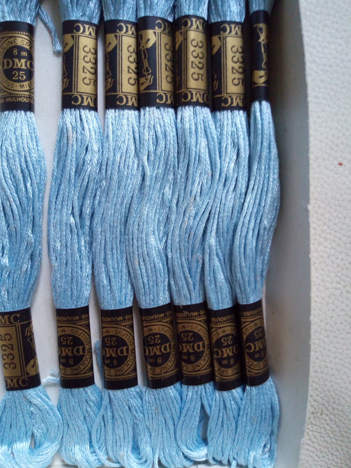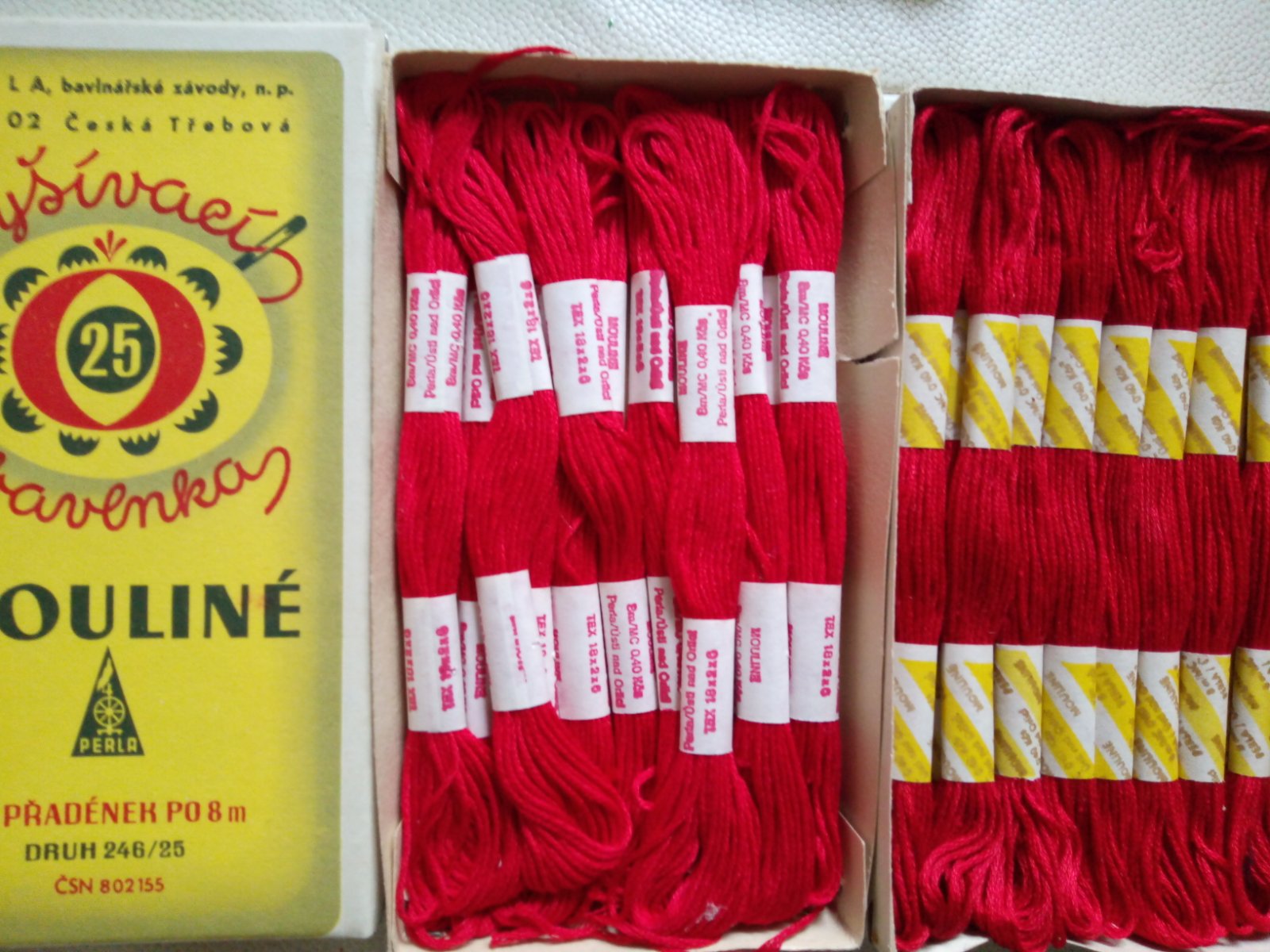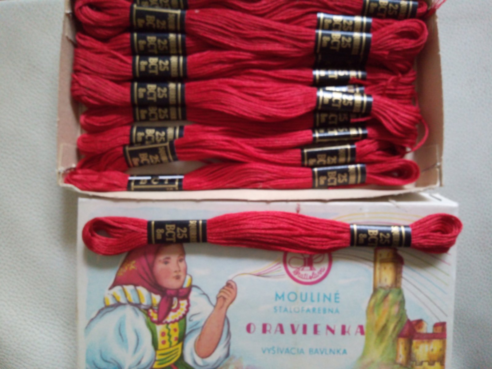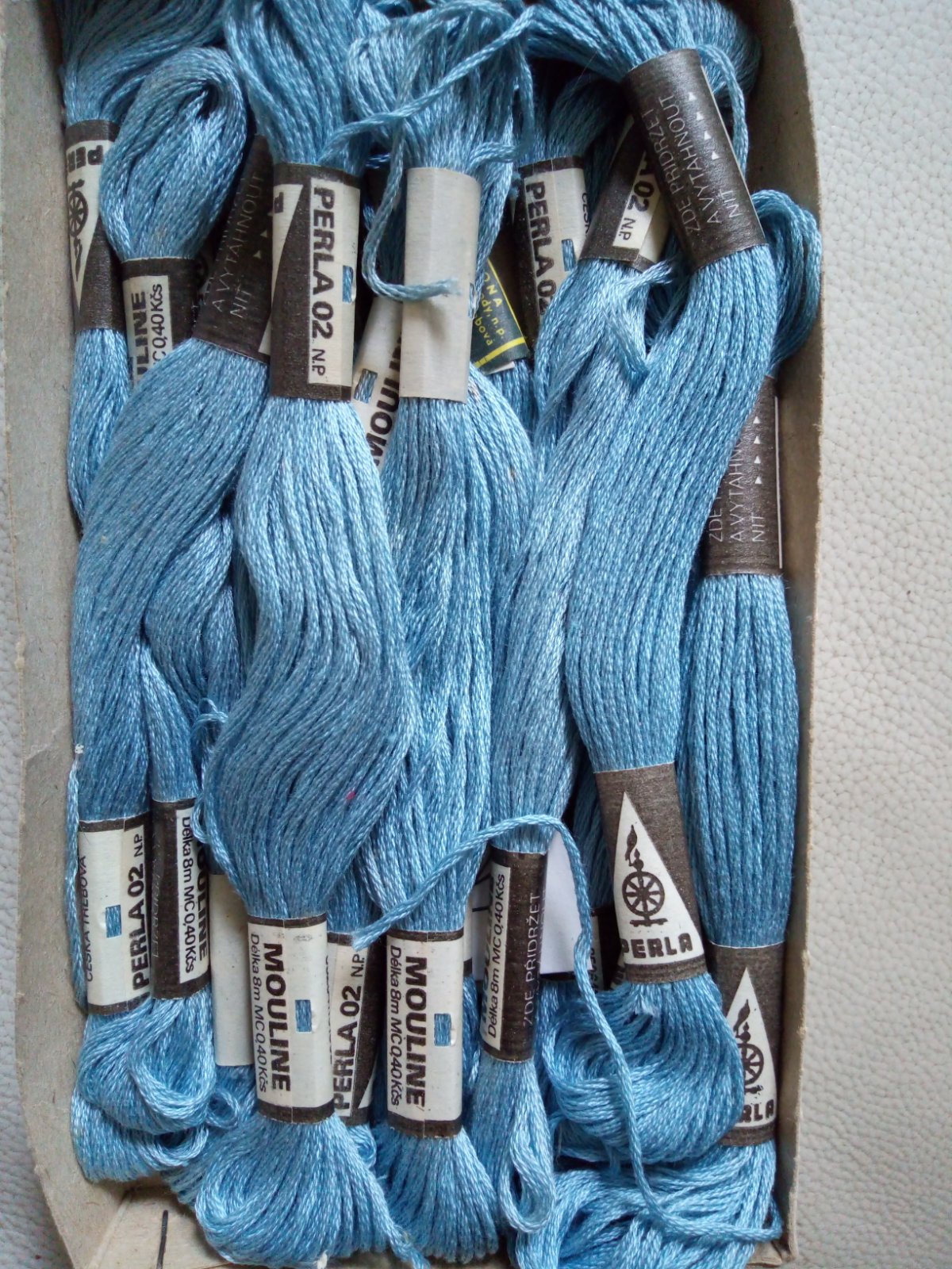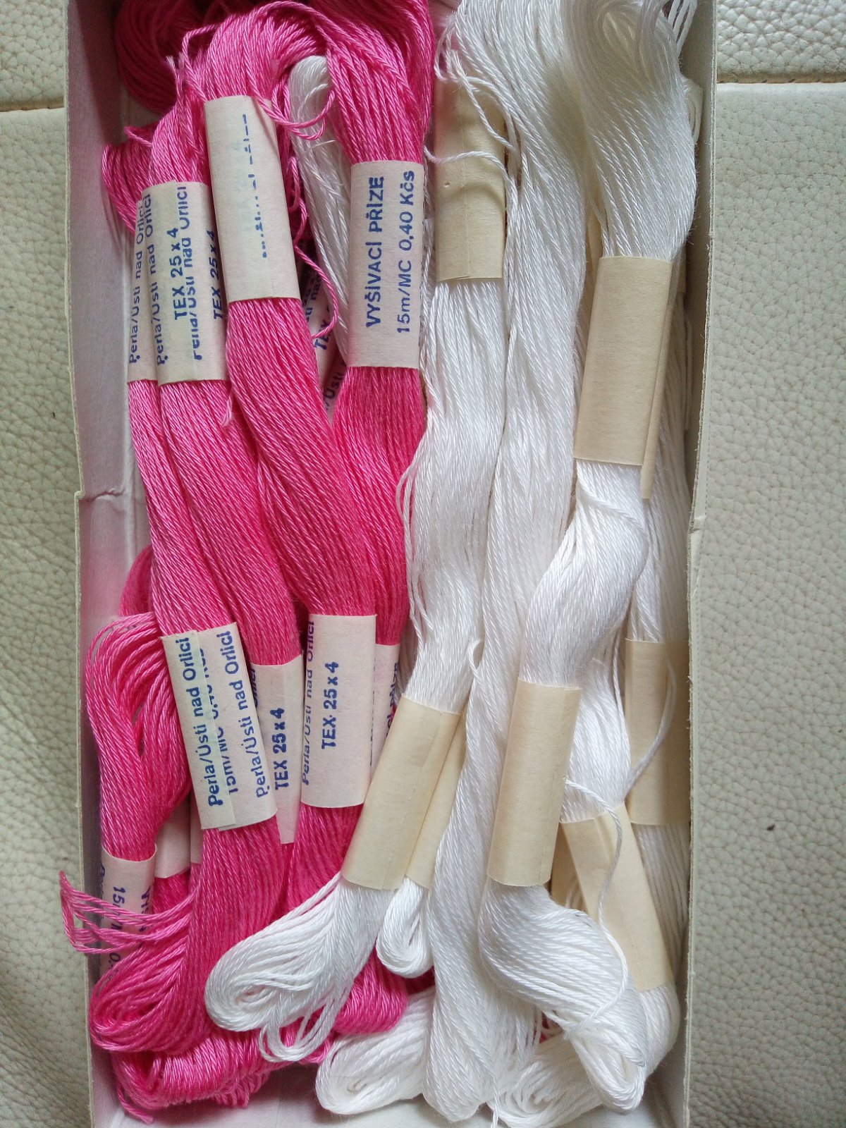 Rôznofarebné mulinky na vyšívanie. Cena za kus 0,30 €, len francúzske ( DMC, modré sú za 0,50 € za kus.) Biela je v ponuke už len tenká, tá čo je v krabičke s ružovou.