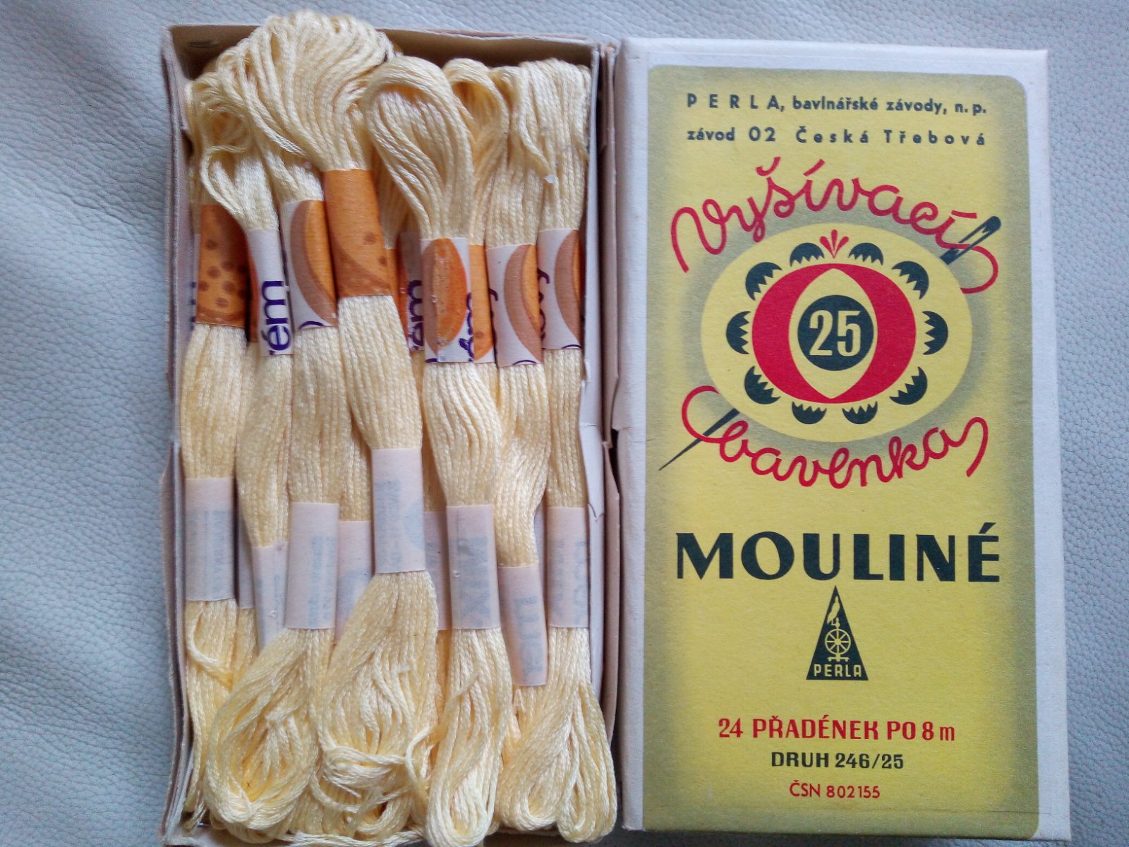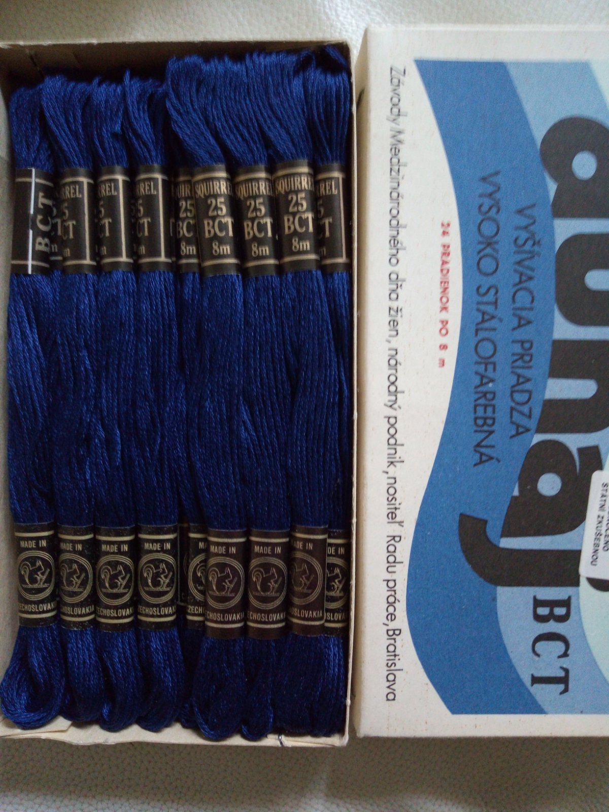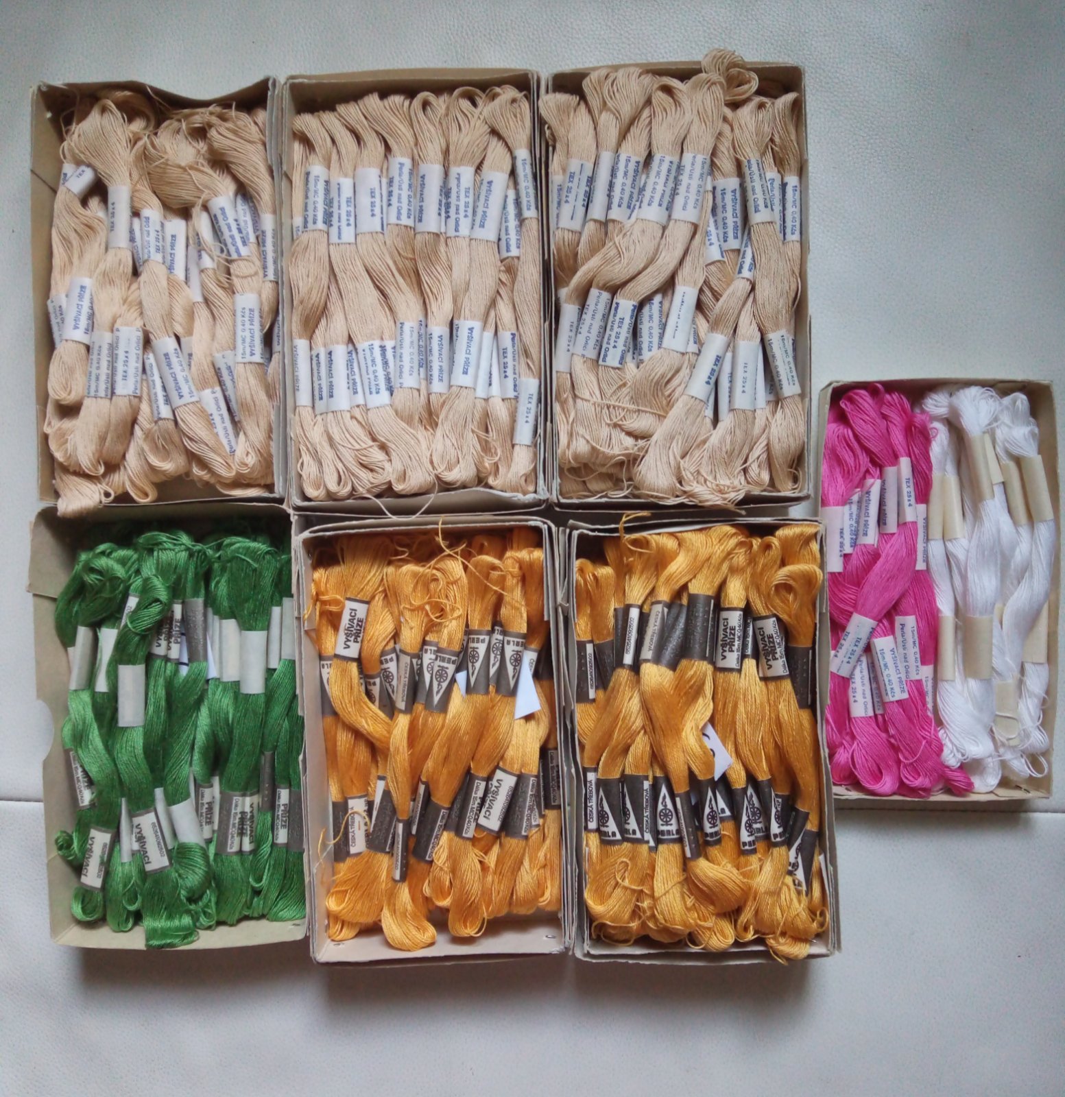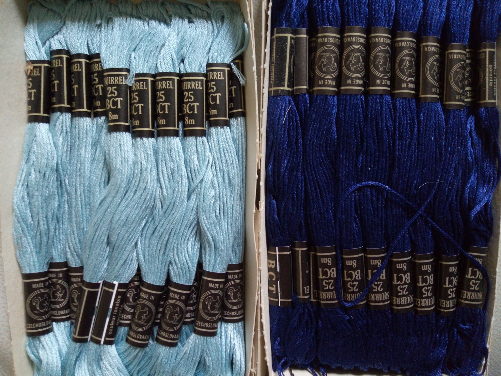 Rôznofarebné mulinky na vyšívanie. Cena za kus 0,30 €, len francúzske ( DMC, modré sú za 0,50 € za kus.) Biela je v ponuke už len tenká, tá čo je v krabičke s ružovou.