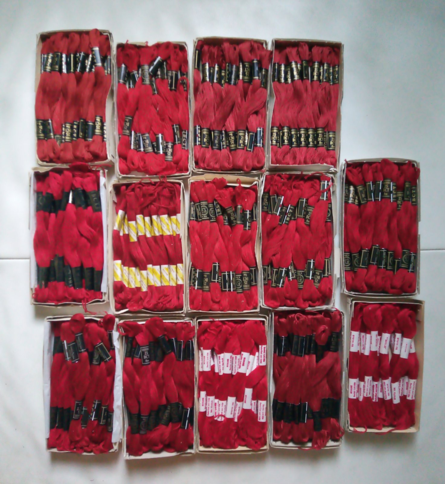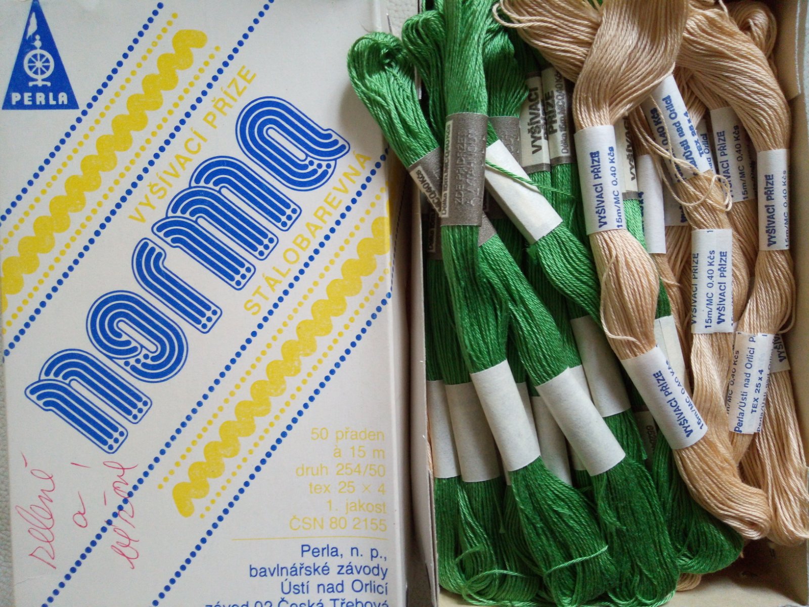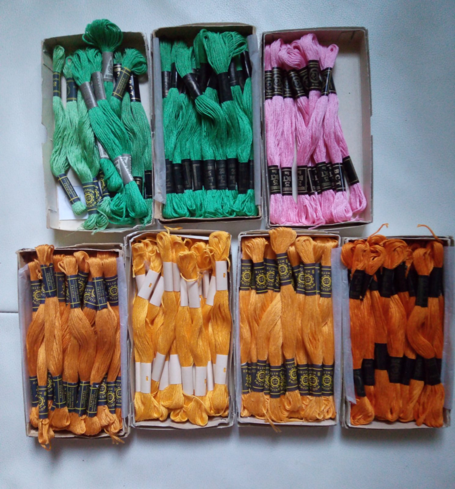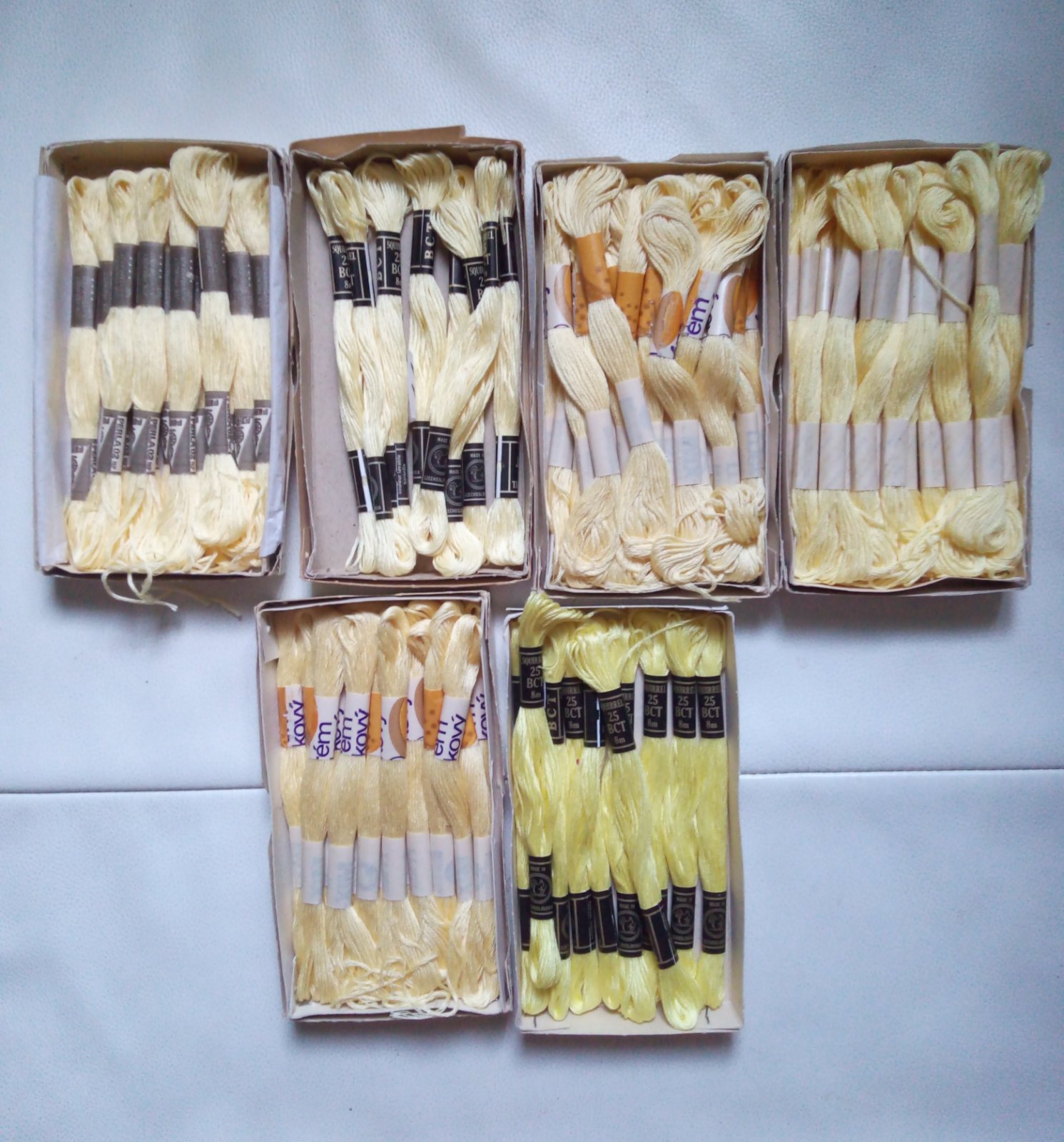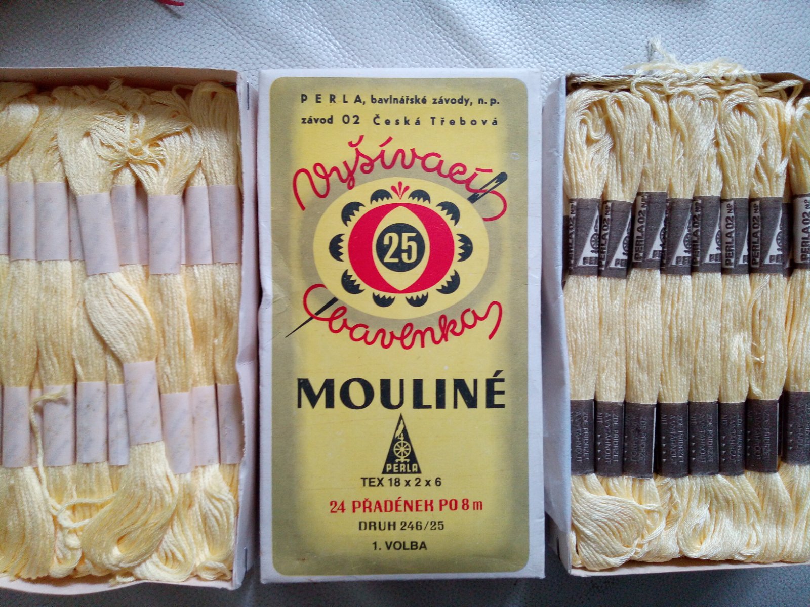Rôznofarebné mulinky na vyšívanie. Cena za kus 0,30 €, len francúzske ( DMC, modré sú za 0,50 € za kus.) Biela je v ponuke už len tenká, tá čo je v krabičke s ružovou.