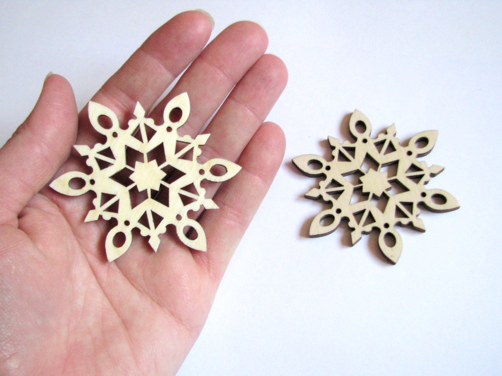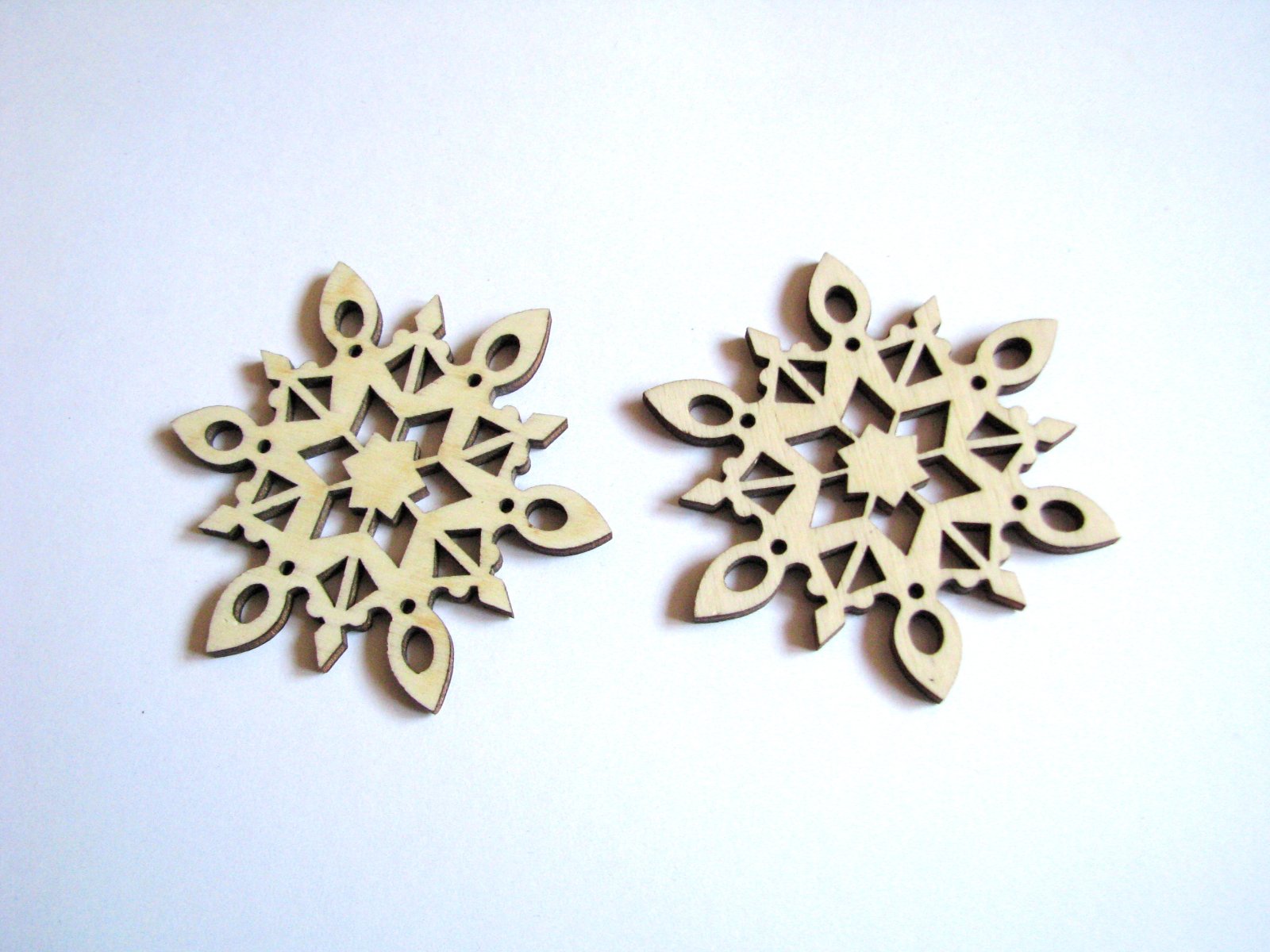 2 drevené snehové vločky - polotovar, možno pretrieť (alebo aj ponechať surové drevo, ako chcete) a vyrobiť z nich ozdoby na stromček, do vencov alebo i výrazné náušnice :)
