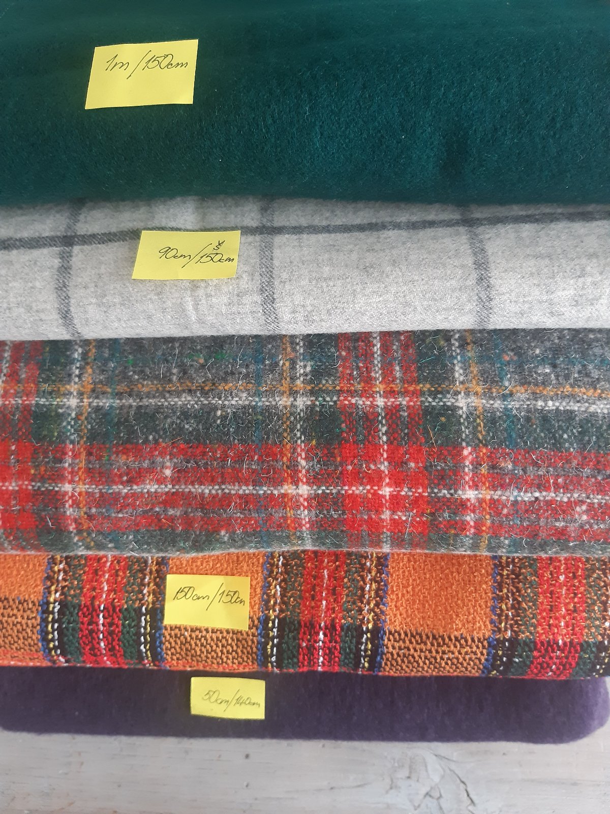 Nové krásne kárované vlnené tkaniny, kúpené na midi sukne, ktoré už nebudem šiť. Jednofarebné sú hrubé vlnené flauše, zvyšky. Predám za 6e/1m, alebo za 25 celý balík + poštovné