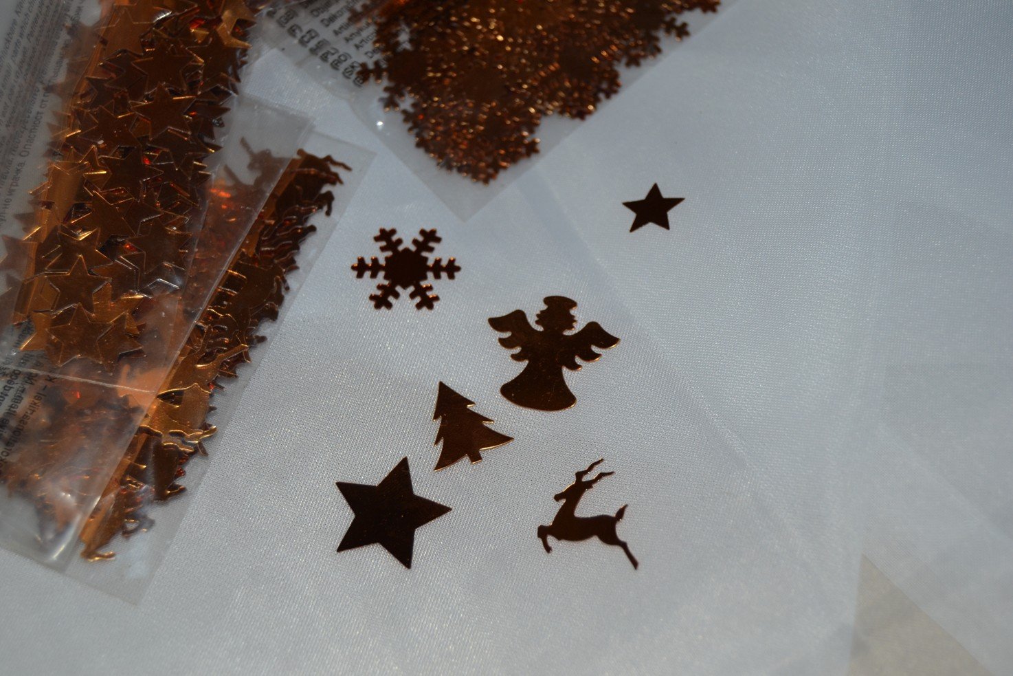 Dekorácie rôzne typy, v ponuke anjelik, hviezdička malá, hviezdička veľká, stromček, vločka a jeleň. Možné nimi ozdobiť podľa svojej fantázie, oznámenia, pohľadnice, darčeky...Farba zlatá, veľkosť cca 5-10 mm. Cena za balíček 0,60€, pri 6 ks cena 3,-€.