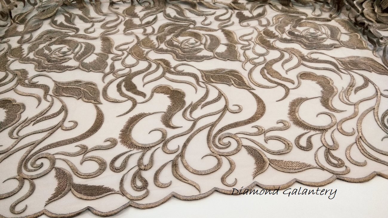 Luxusné tkané vzory na jemnom tylovom podklade. Šírka látky je 125 cm. Materiál: 100 % polyester. Len ručné pranie do 30 stupňov Celzia. Cena je uvedená za 10 cm látky, látka sa posiela v celku.
