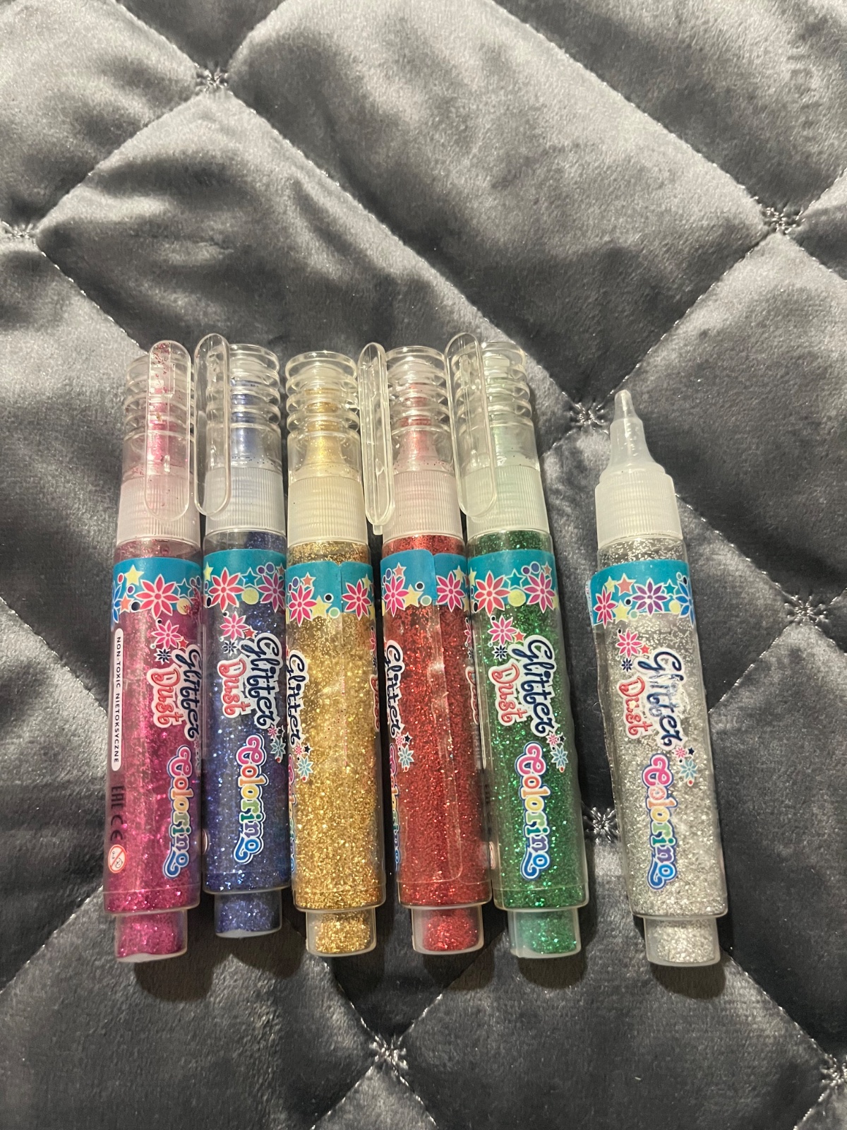 Perá s trblietkami na papier. Na druhej foto vidieť koľko je toho použitého. Na striebornom chýba zátka.