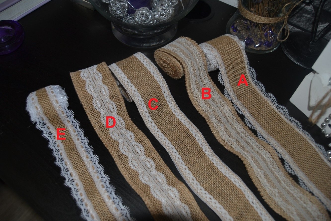 Jutové stuhy, s rôznym typom čipiek, typy sú označené na foto1, treba uviesť ktorú chcete, cena je uvedená za jeden meter 1€. Šírka od 3-5 cm.