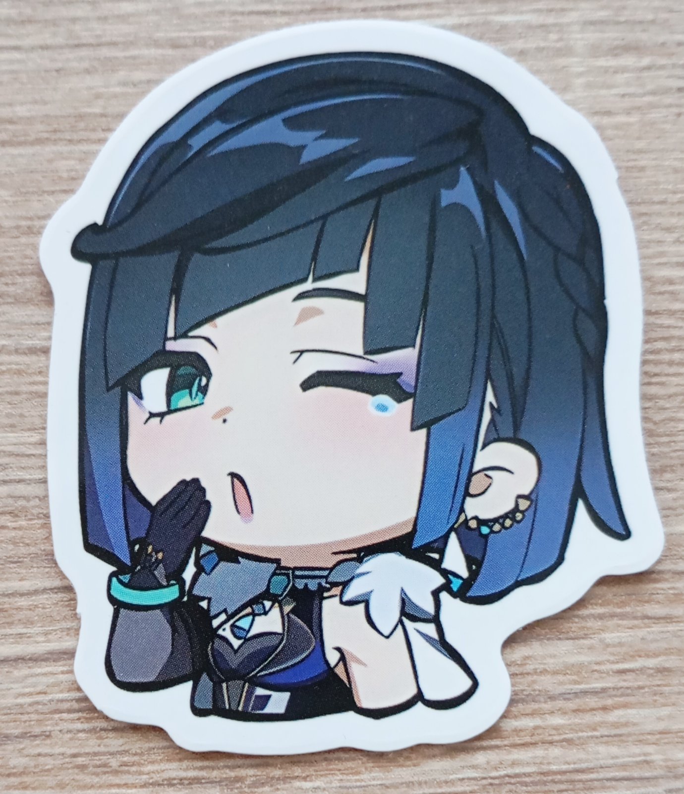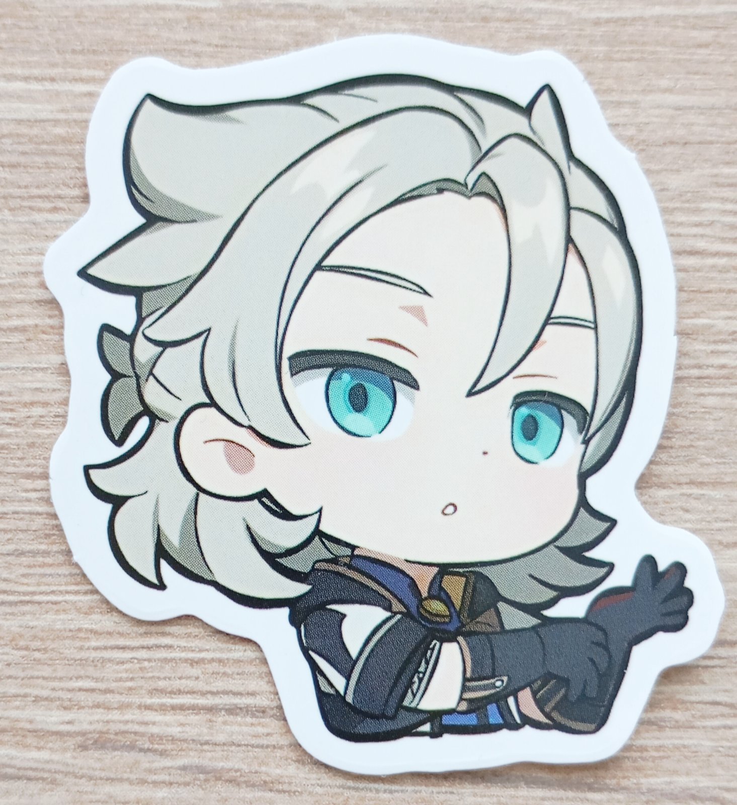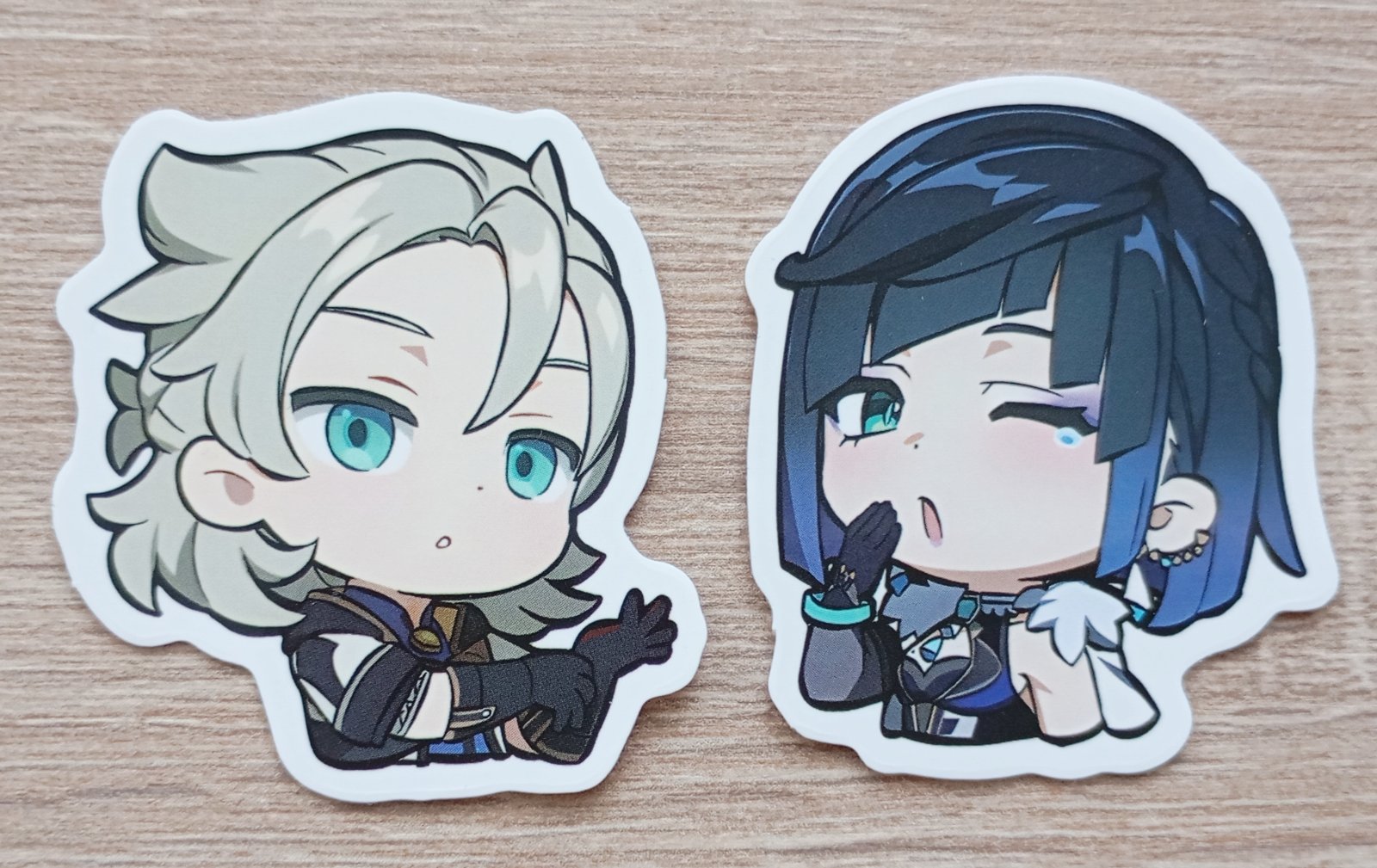 Dve zberateľské nálepky s motívom dvoch postáv z populárnej videohry Genshin Impact. Mená postáv by mali byť Albedo a Yelan.