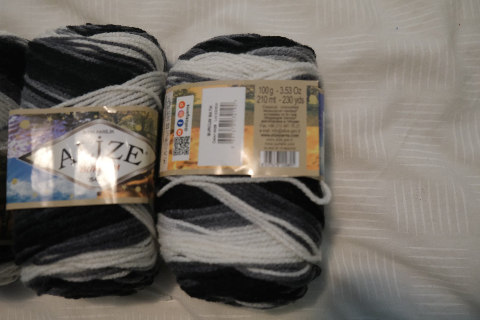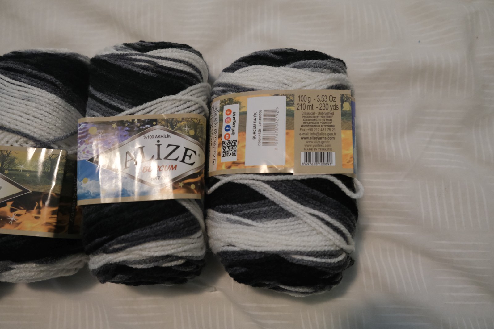 Táto priadza vynikne vďaka krásnemu melíru, ktorý vytvára pásy striedajúcich sa farieb čiernej, šedej a bielej.