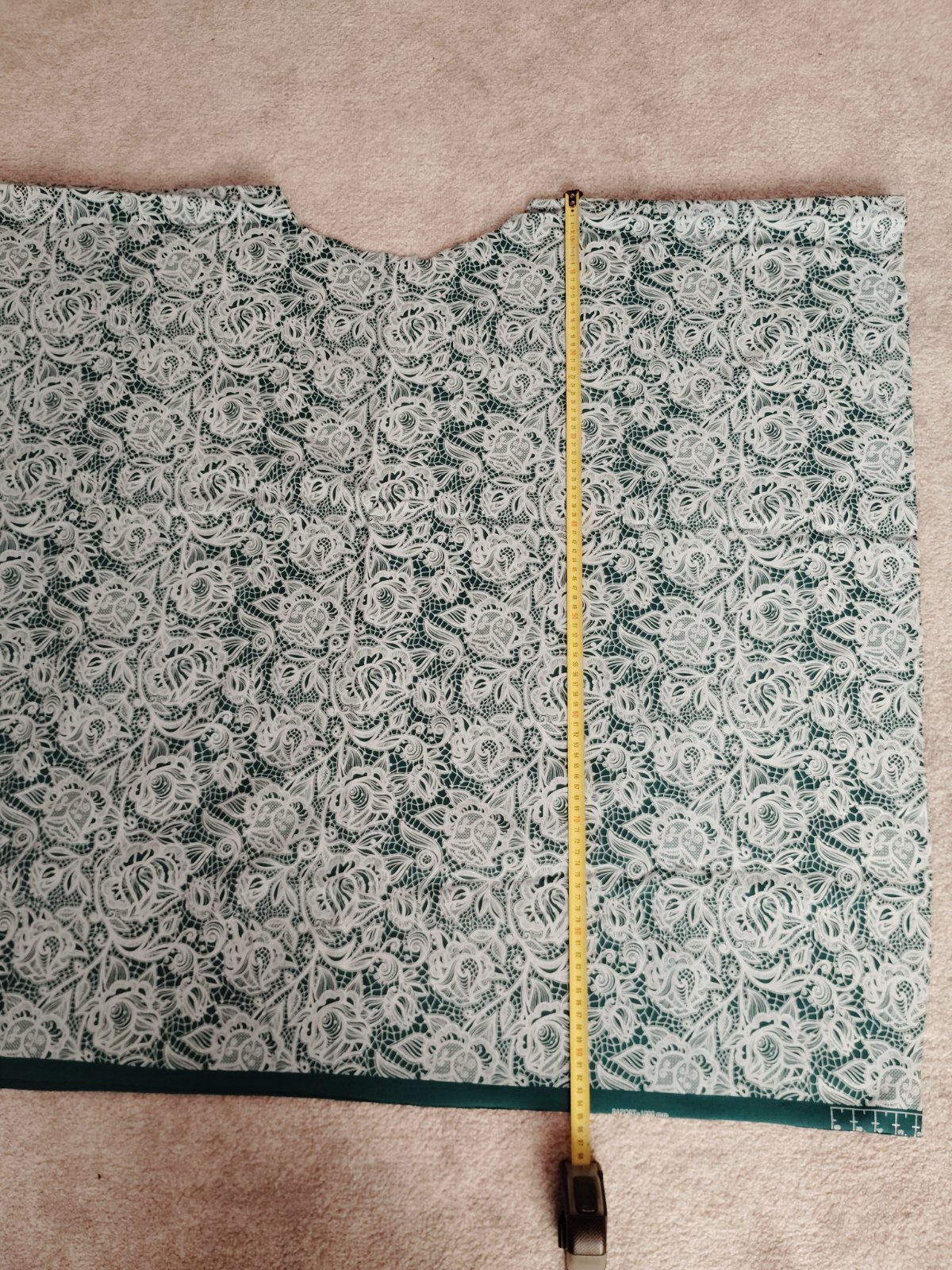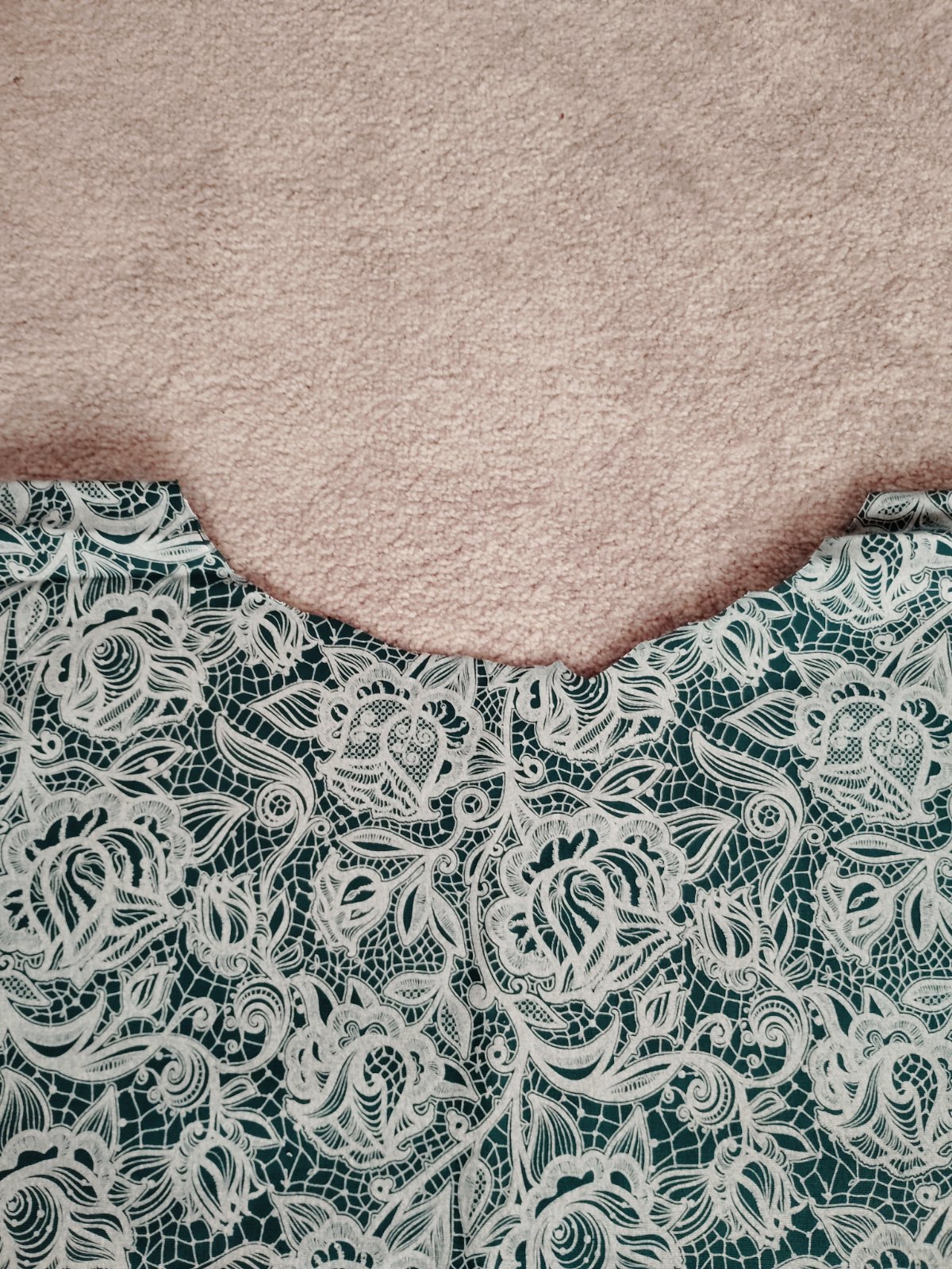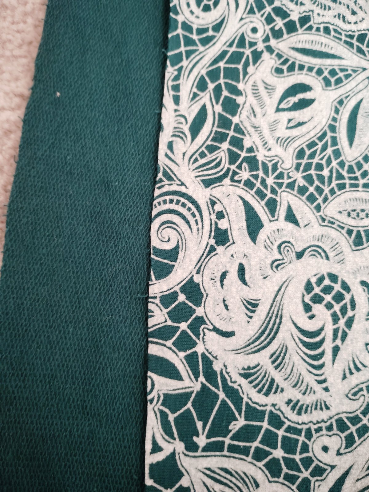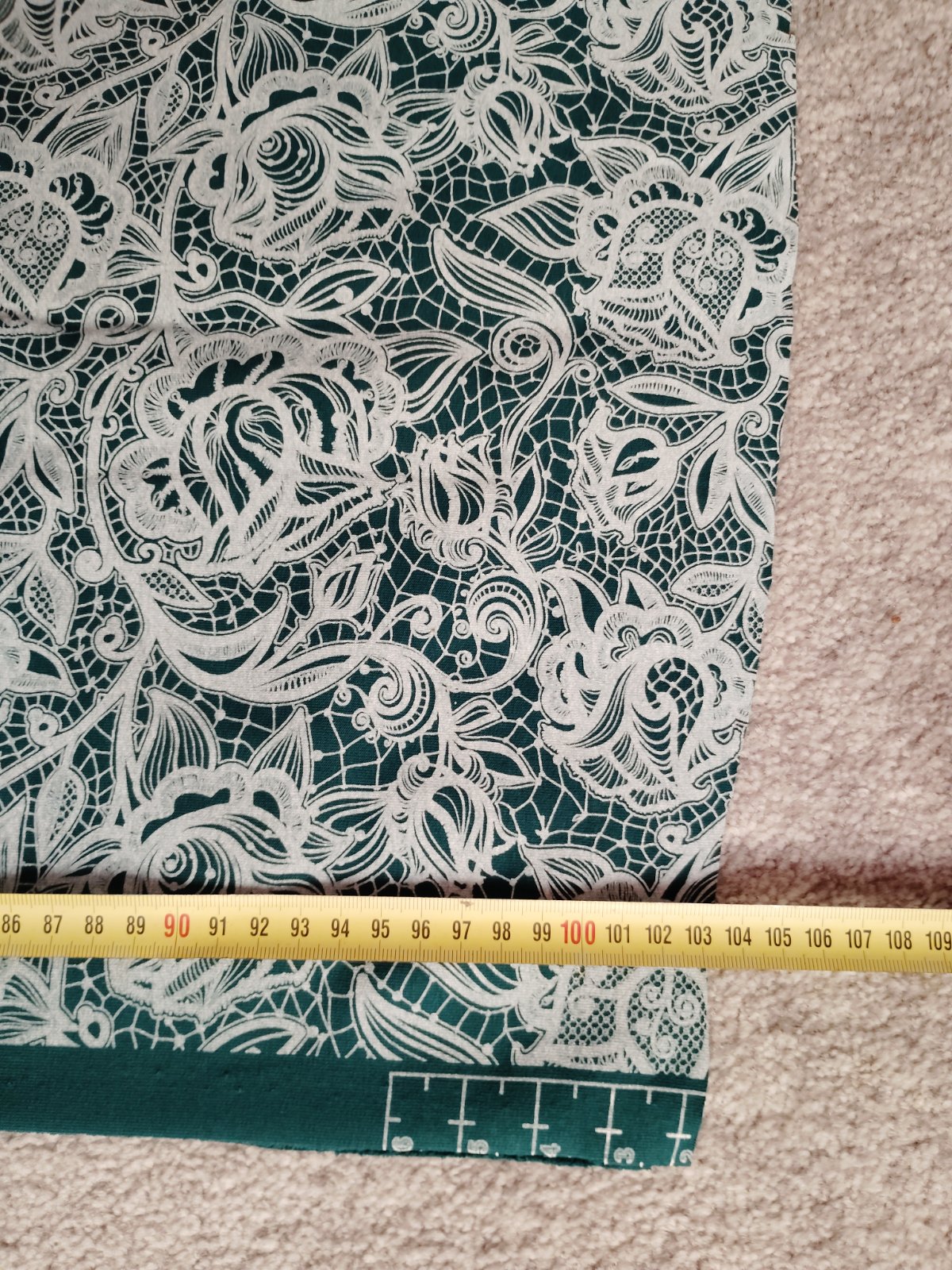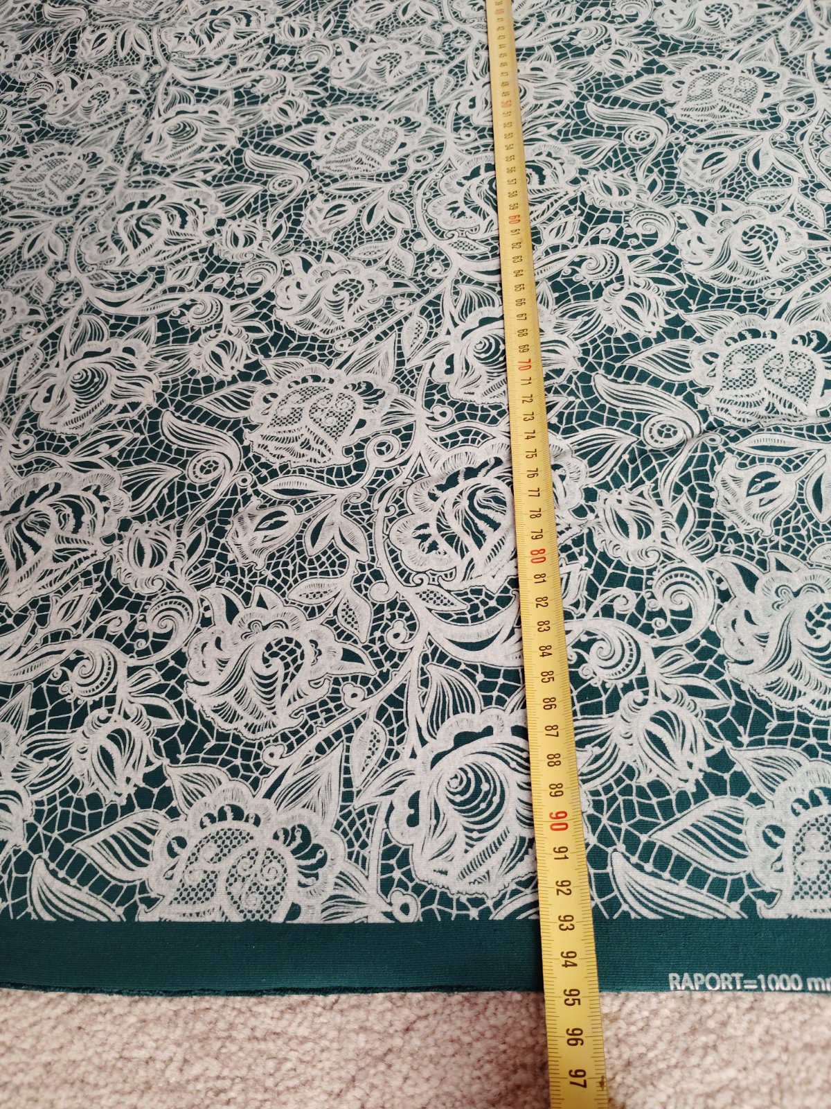 Druhý kúsok z látky, -teplákovina s potlačou čipky, ktorú ponúkam v inom inzeráte. Má trochu vystrihnuté, zrejme si niekto z nej šiel niečo ušit, ale ja som ju už takúto kúpila. Rozmer je na fotkách - širka v preklade je 2x90 CM a dľžka 100cn.