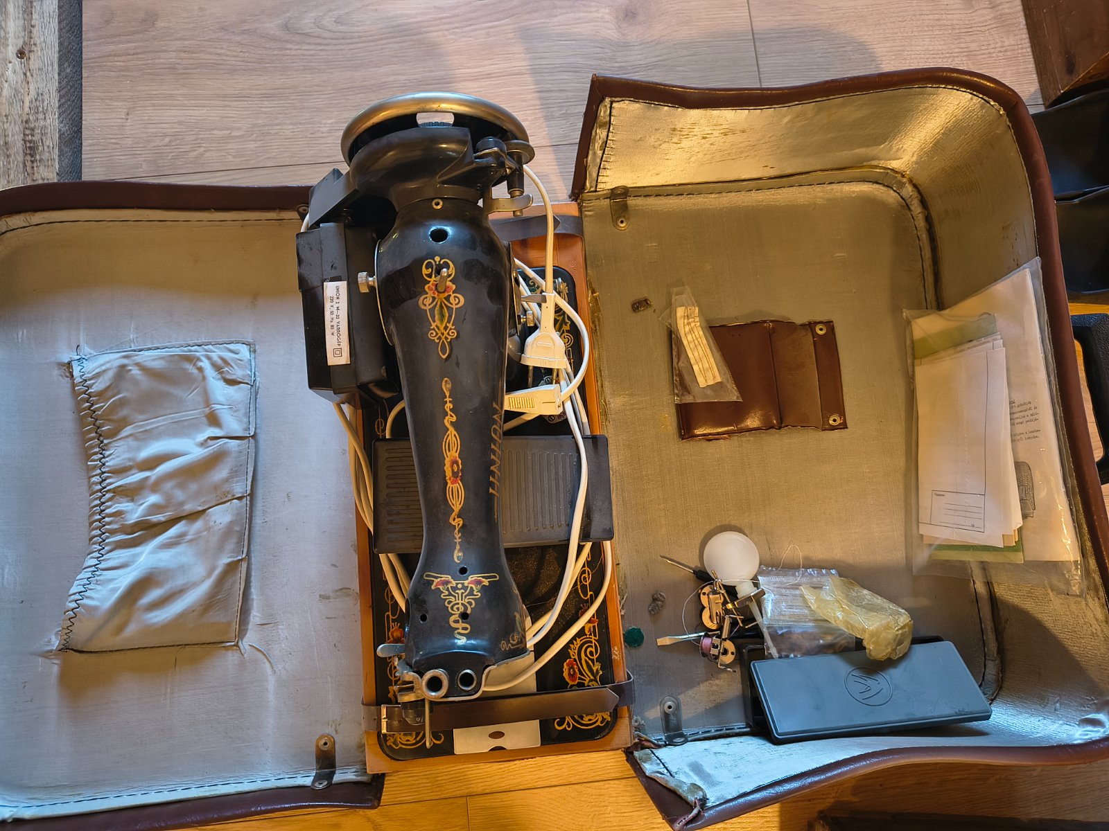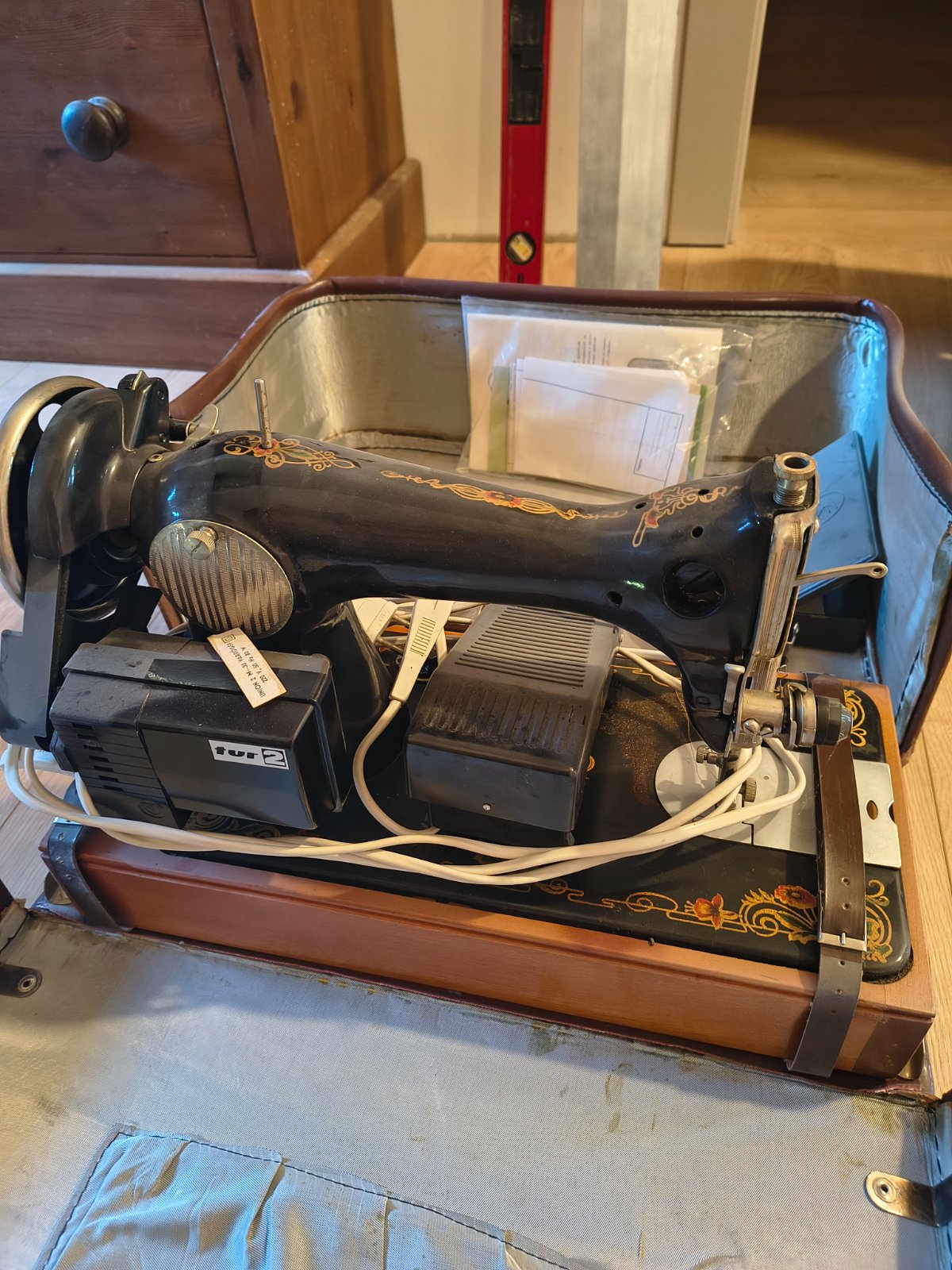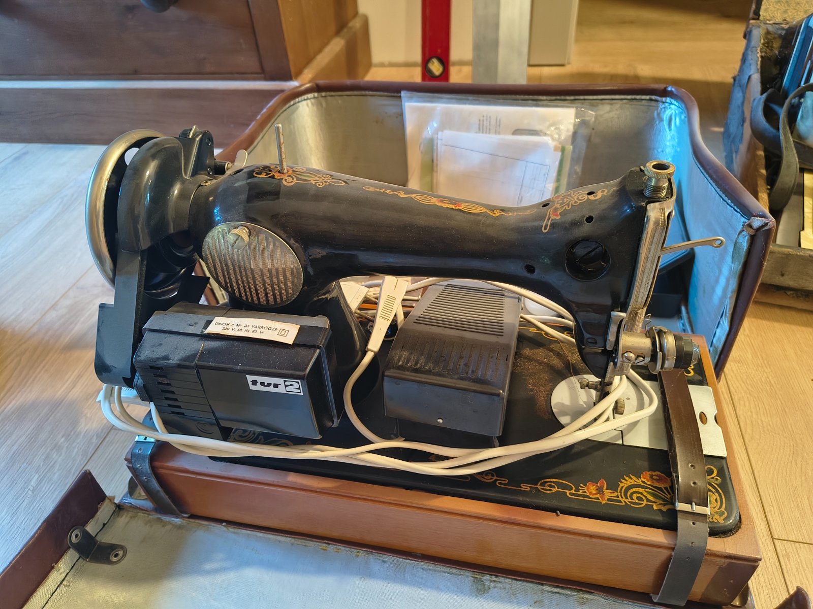 Starožitný šijací stroj ruskej výroby, v puzdre, na elektrinu