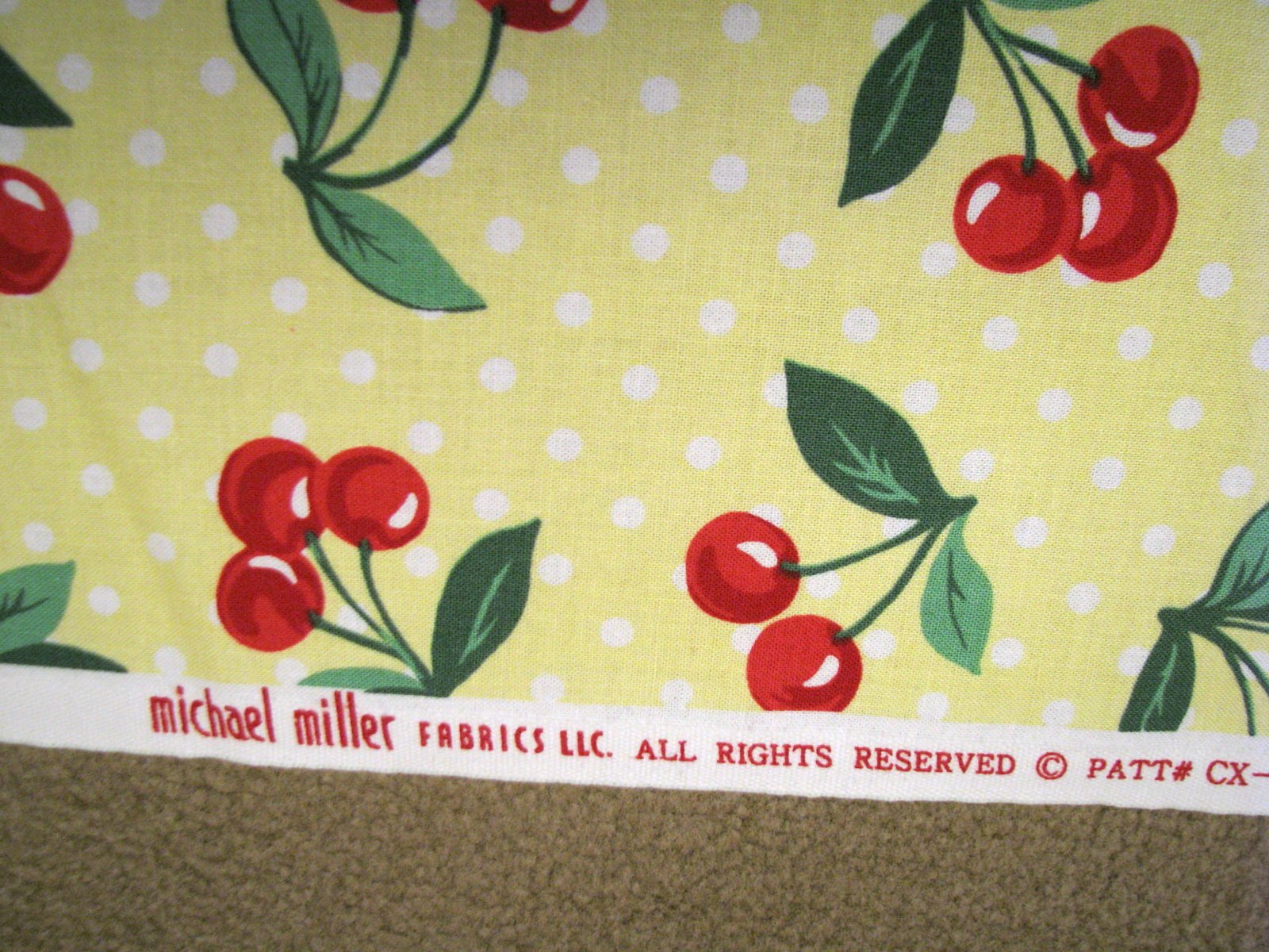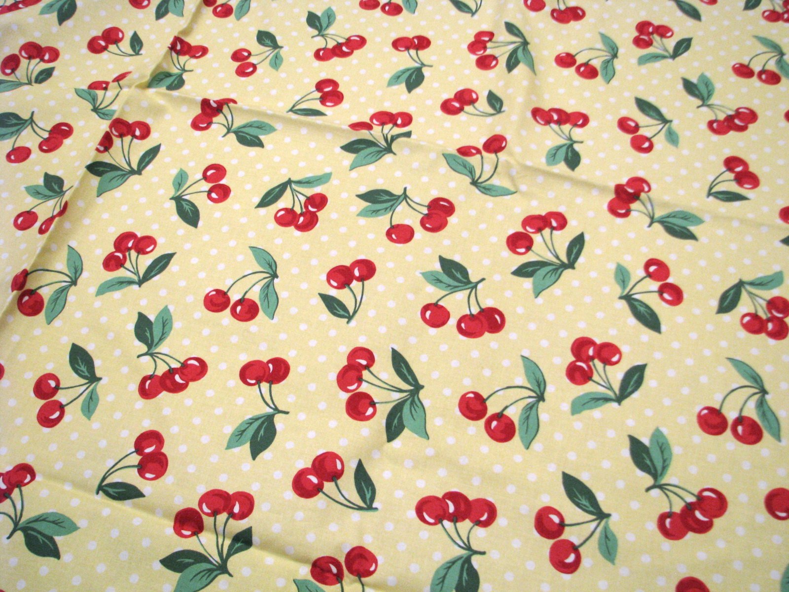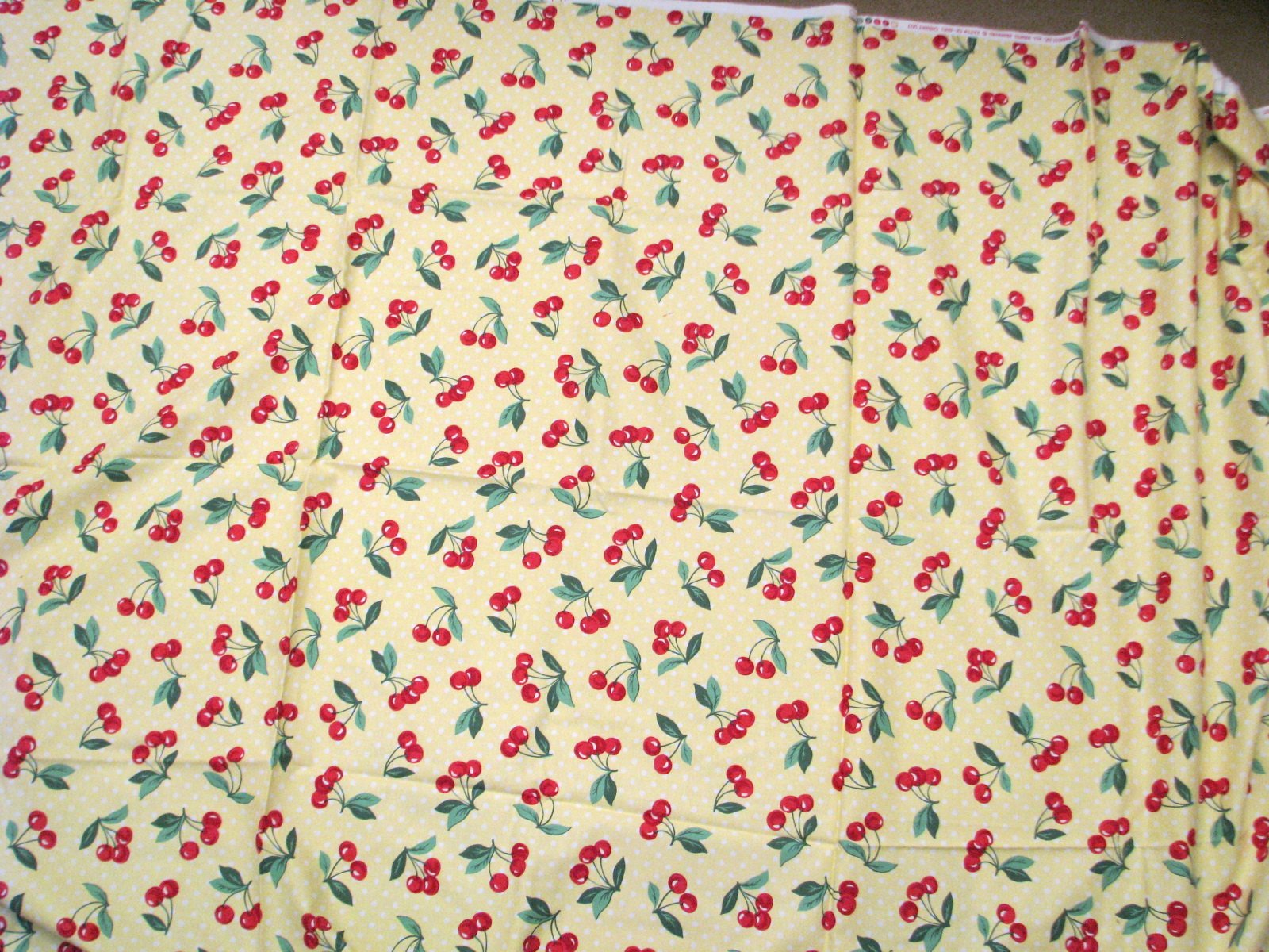 Nepoužitý kus dizajnovej bavlnenej látky s krásnym vzorom čerešničiek s lístkami na svetložltom podklade s bielymi bodkami. Je to veľmi príjemná, mäkká a kvalitná bavlna, bola drahá. Látka má šírku vrátane okrajov 112 cm, dĺžka je cca 208 cm. Cena je za celý kus, nestrihám.