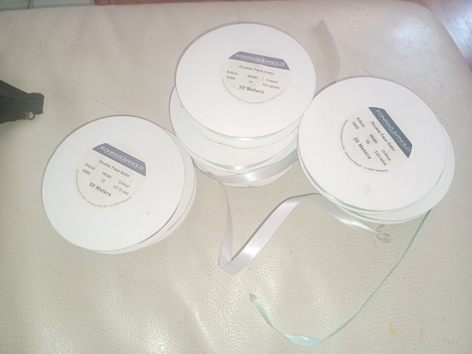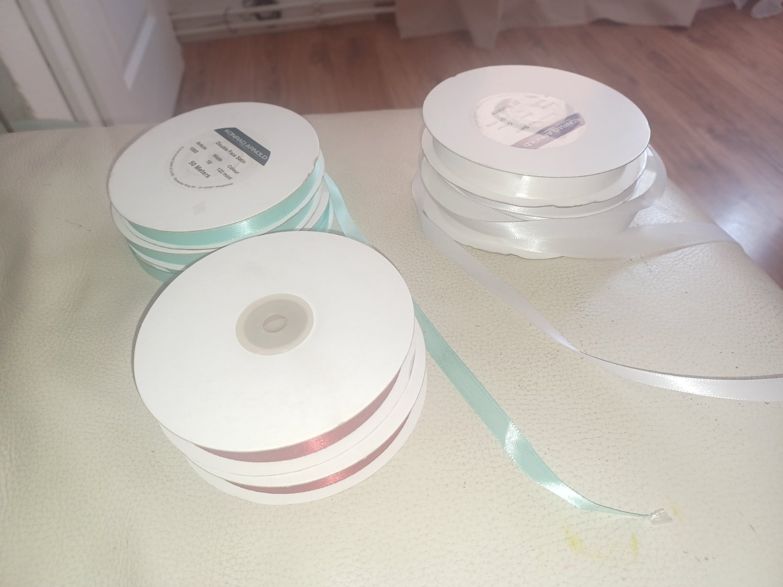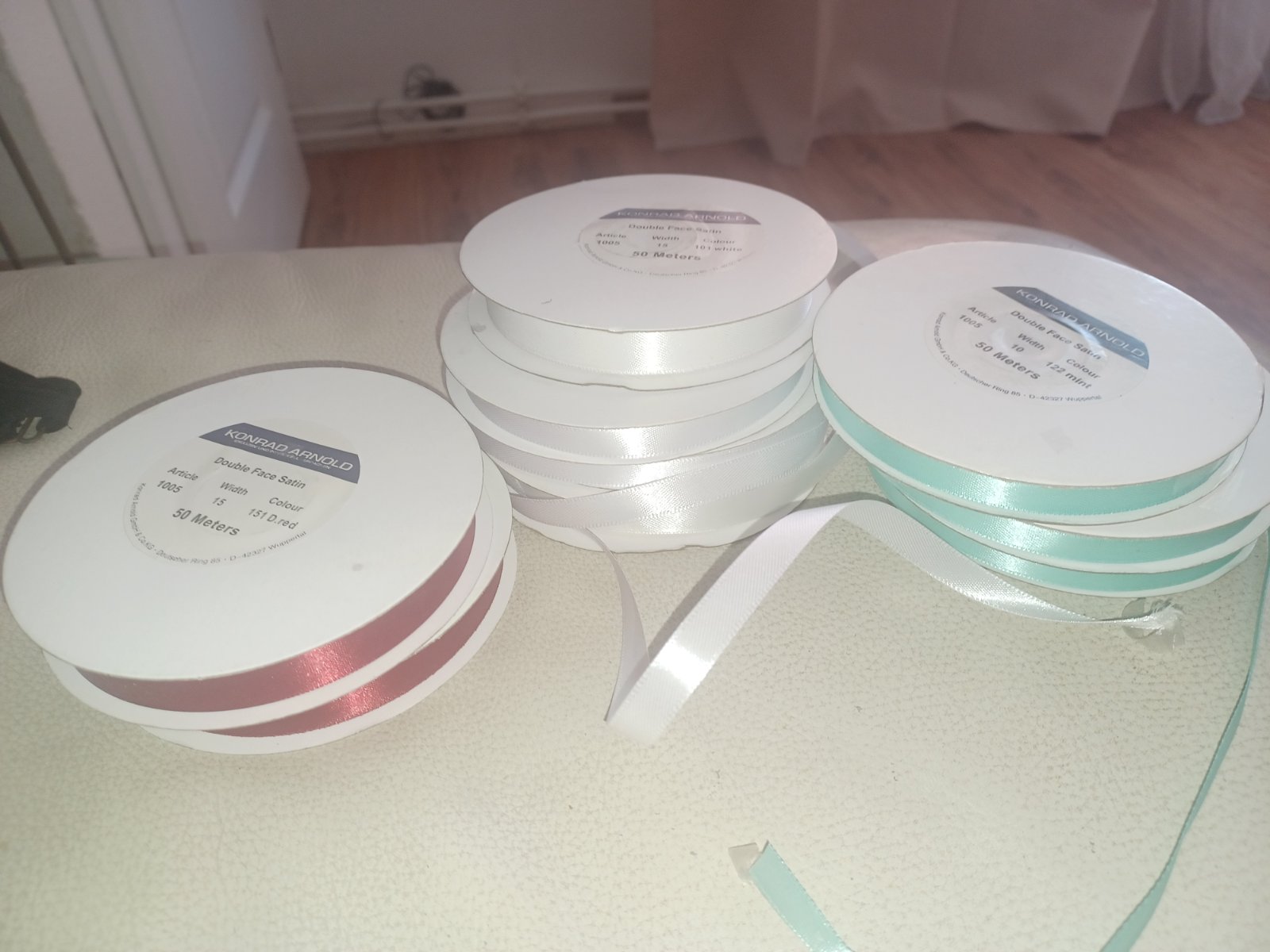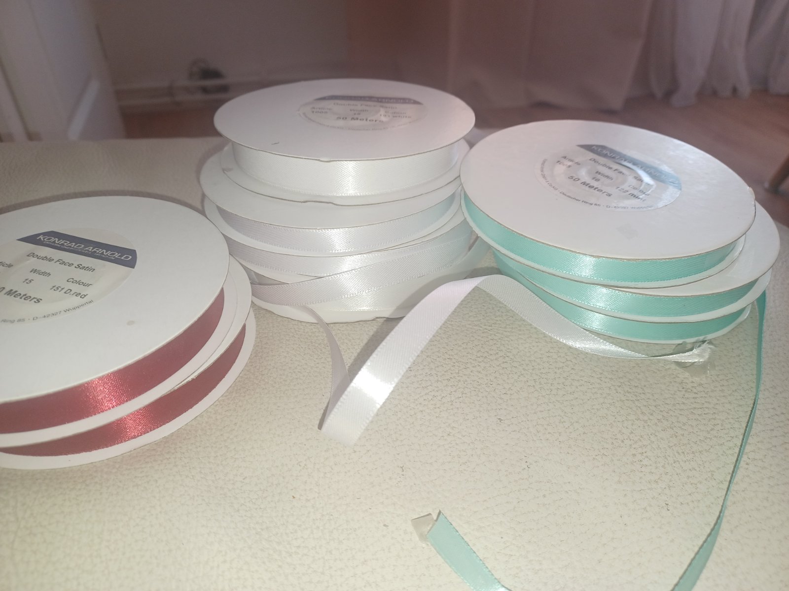 Predám stuhy 50metrov jedno balenie ma mám 2x biele,2x zelená a 2x bordovocervene ,cena 1,8eur kus alebo 11eur vsetky