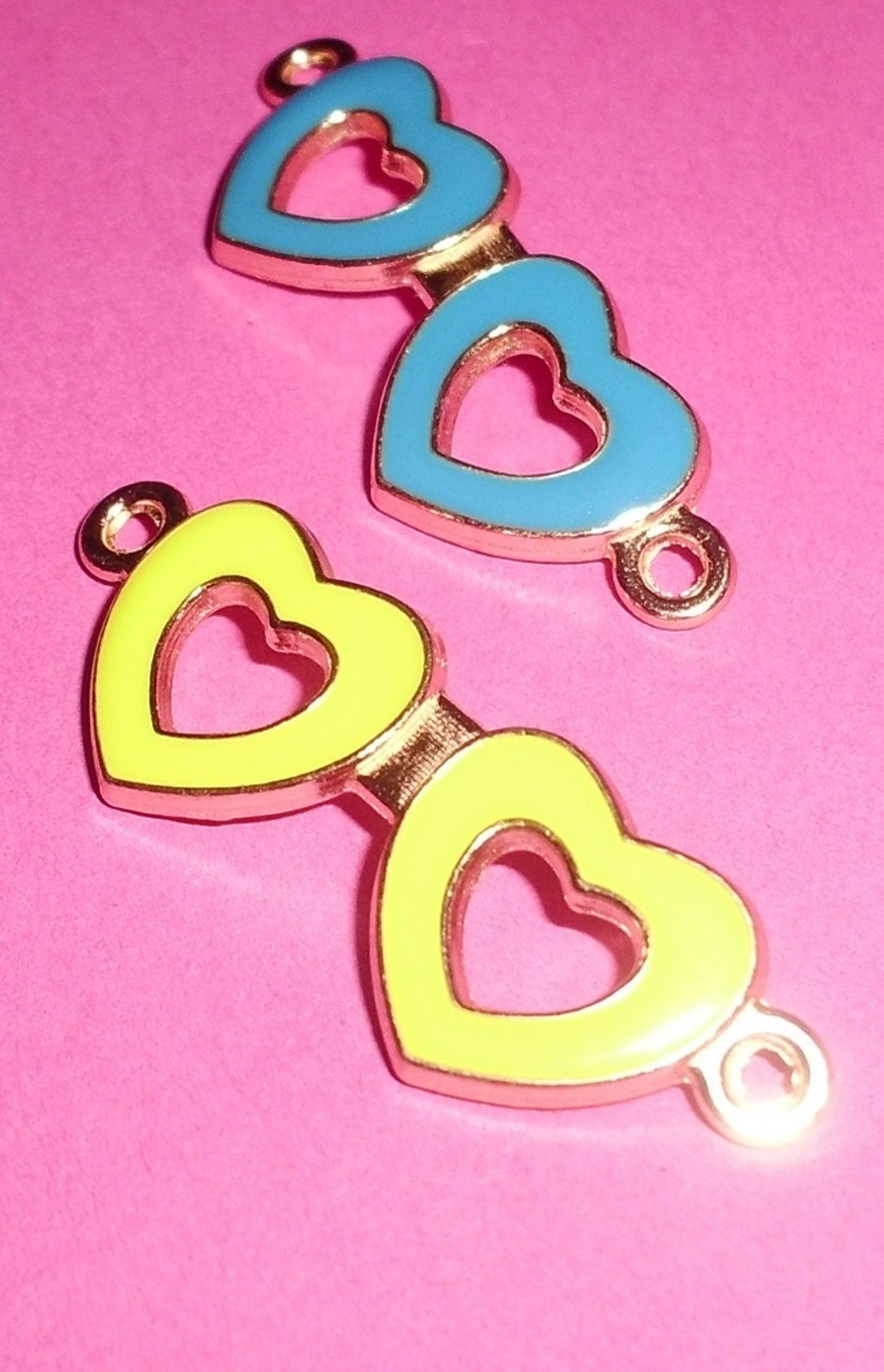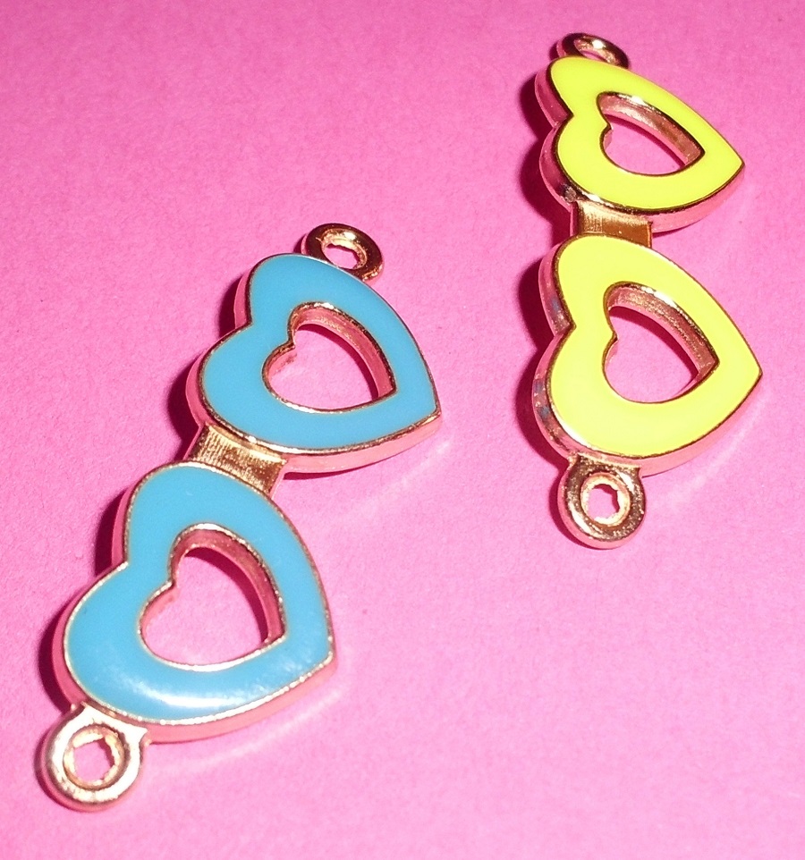 Kovový komponent v tvare dvojitých srdiečok, farba žltá so zlatým pozadím, veľkosť 35 x 15 mm, vhodný napr. na kabbalah náramky. Cena 0,50€/ks.