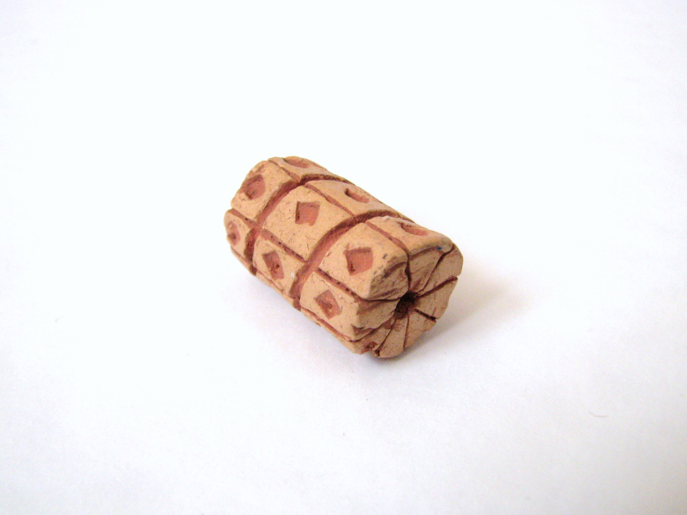 Mnou ručne ešte v detskom veku vyrobená keramická korálka z hliny v tvare valca, vypálená a následne domaľovaná, v odtieňoch svetlej a tmavšej tehlovej farby. Výborne zachovalá, bez poškodení.