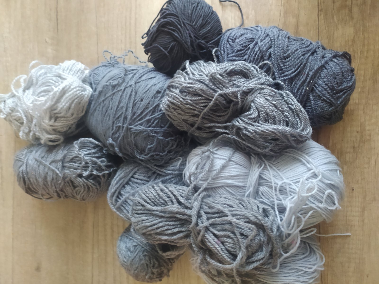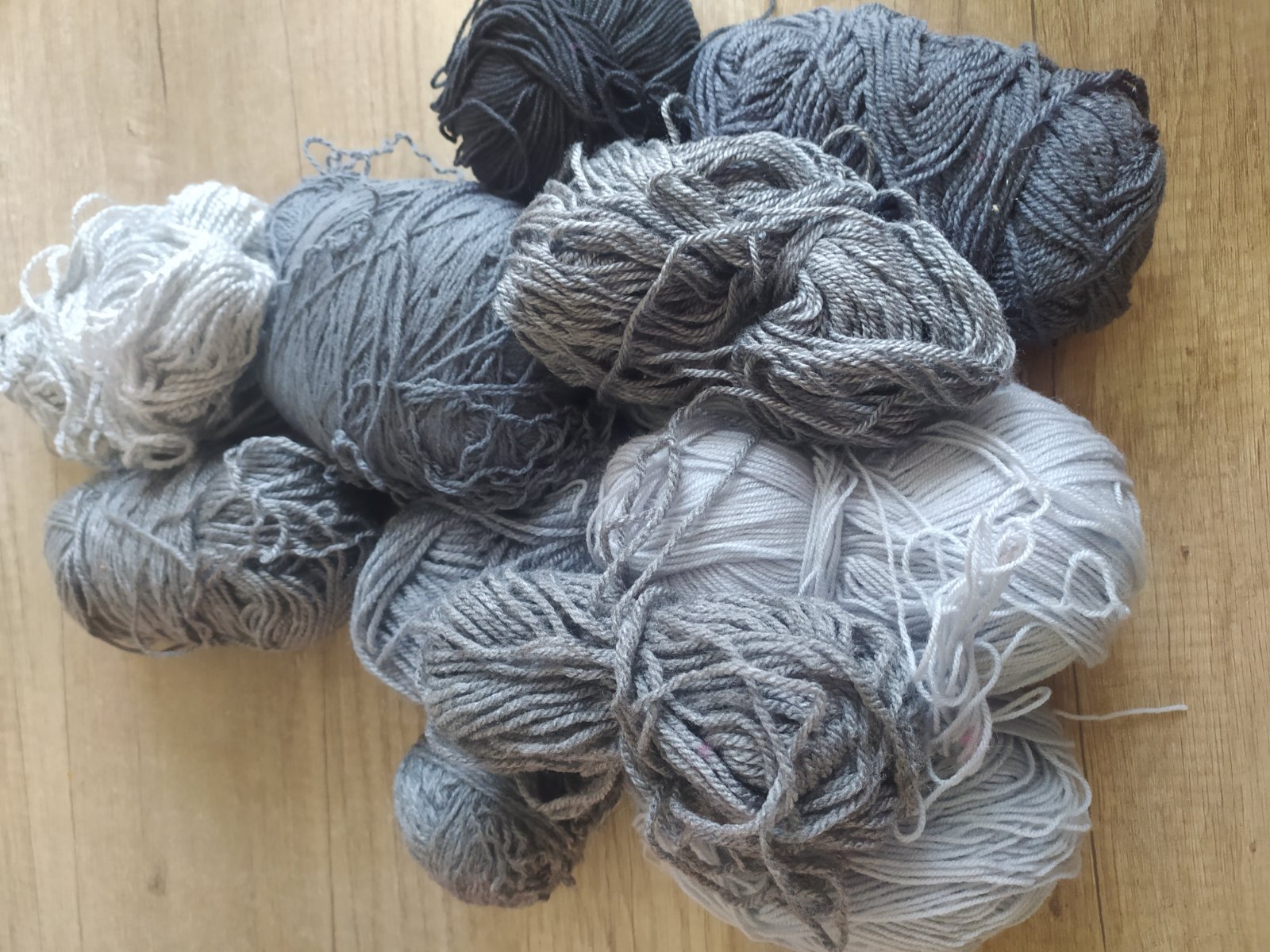 Veľké klbká, vlny na pletenie . Hmotnosti a ceny jednotlivých kusov: ostali - čierna: 650g (10 Eur) - ružovo sivá melír: 473g (6 Eur) Vážené boli na kuchynskej váhe. (5)