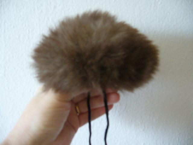 Rucne šity brmbolec z pravej jemnej kozusuny. Pekne sedi na ciapke, lebo je šity tak ze ma plochy spodok. Prichytit si ho môzte dvoma šnurkami.