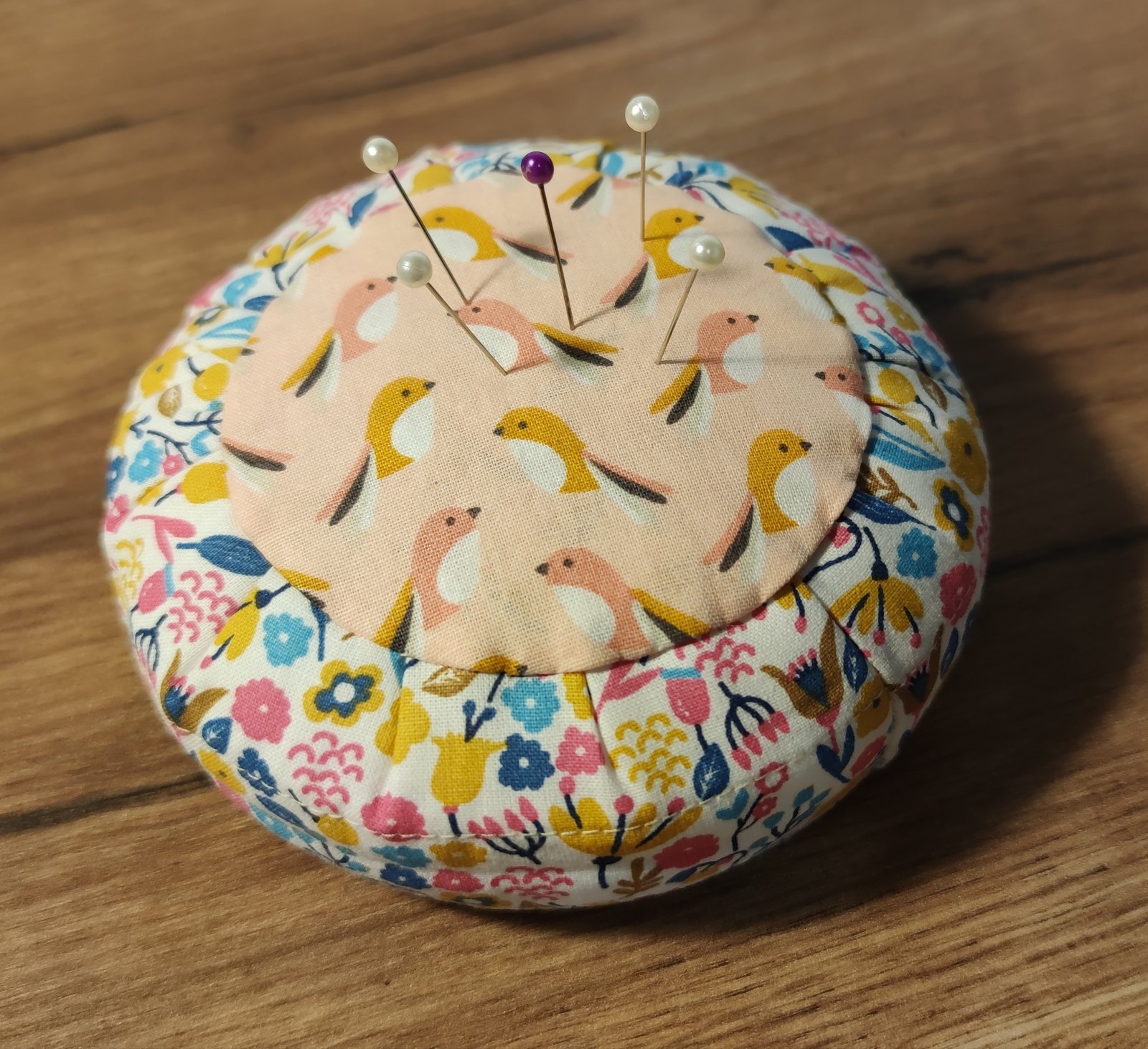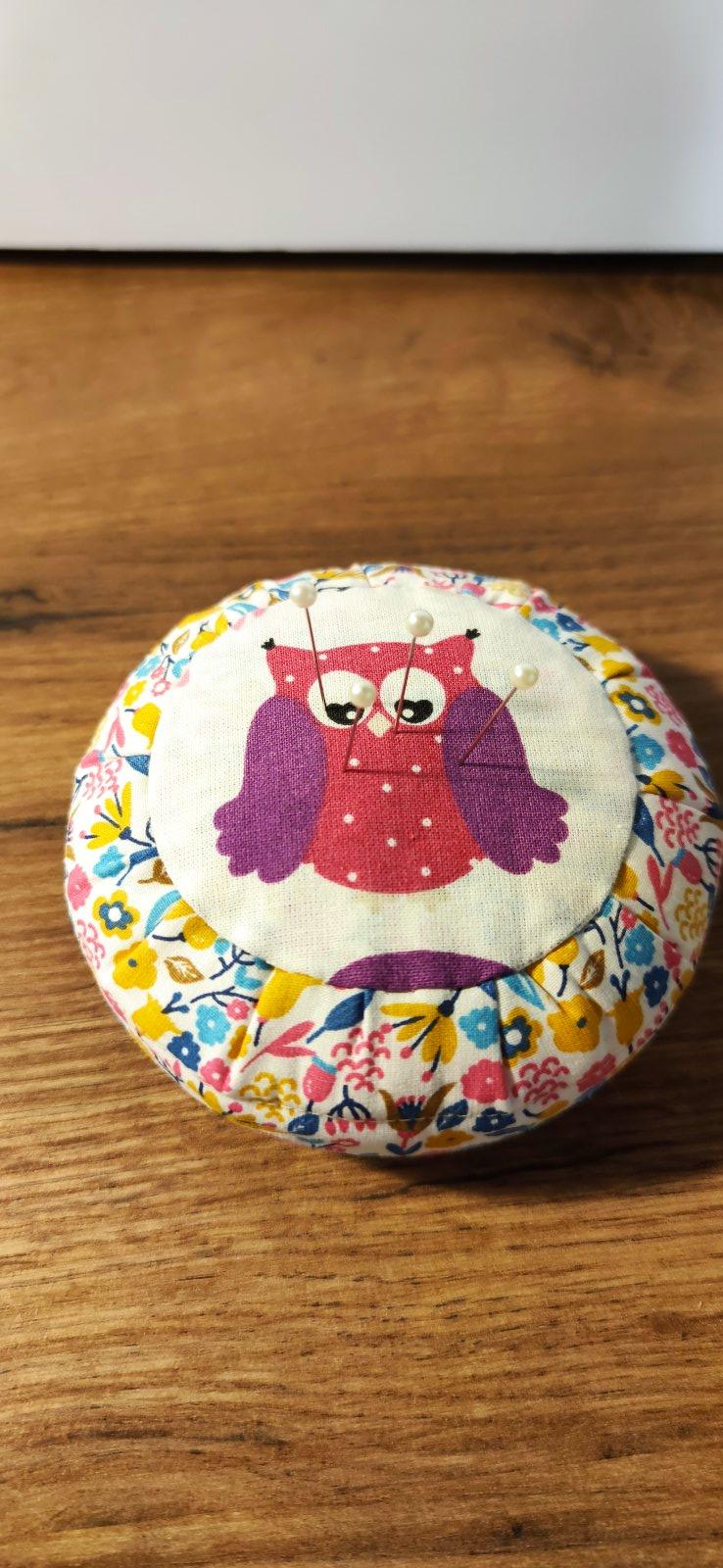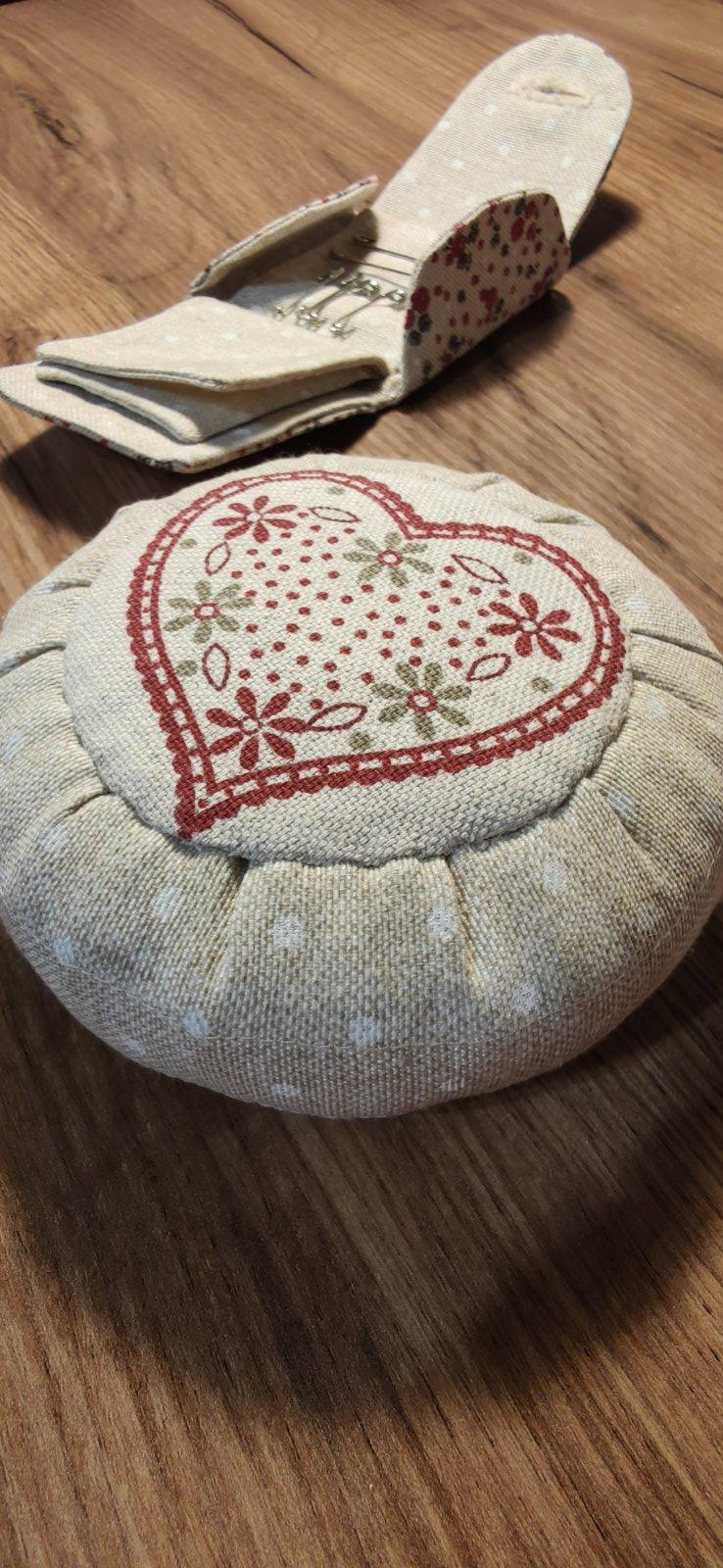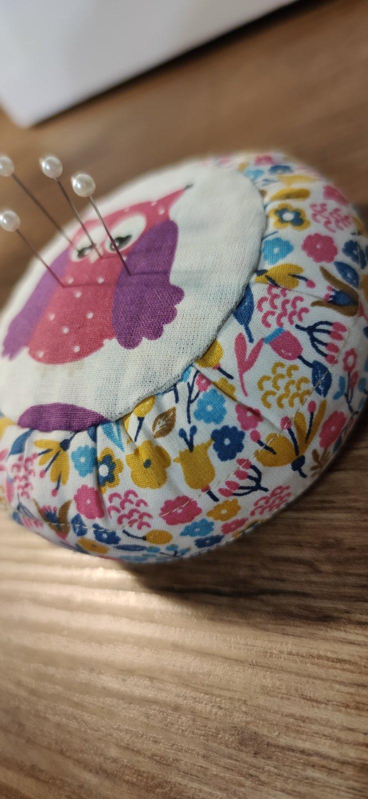 kruhový ihelníček, plnený dutým vláknom, spodok tvorí lepenka, možnosť vyrobiť aj z iných látkových kombinácii. Spracovanie podľa knihy Tilda.