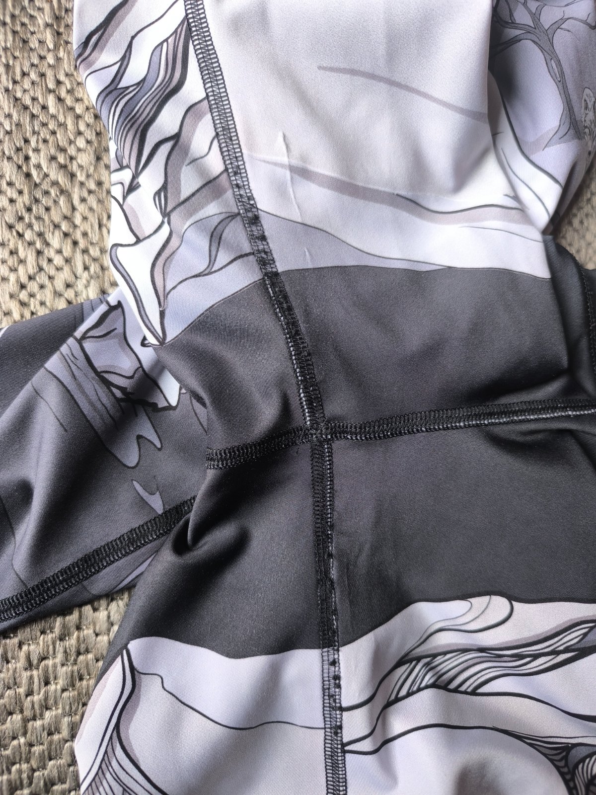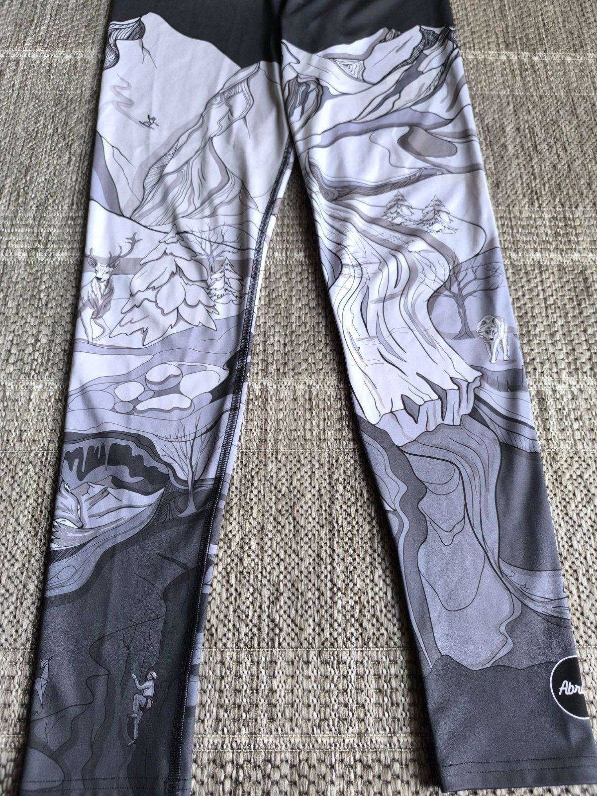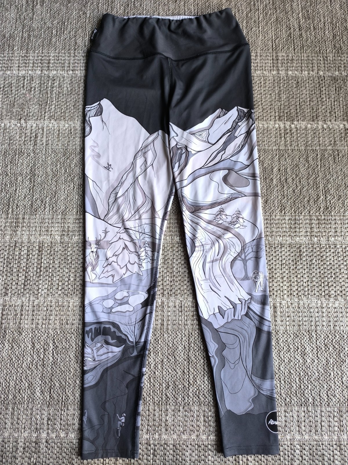 Nádherné legíny slovenskej značky Abraka, motív Ďumbier. Vo veľmi dobrom stave, bez poškodenia, len pár hnedých bodiek na stehne a minižmolky na prešití v rozkroku (na fotke sa zdá akoby bola látka navrhnutá, ale nie je, je to len pokrčené, pozrite detail, kde som to nafotila). Veľkosť L, dĺžka 103cm, šírka v páse 35-47cm.