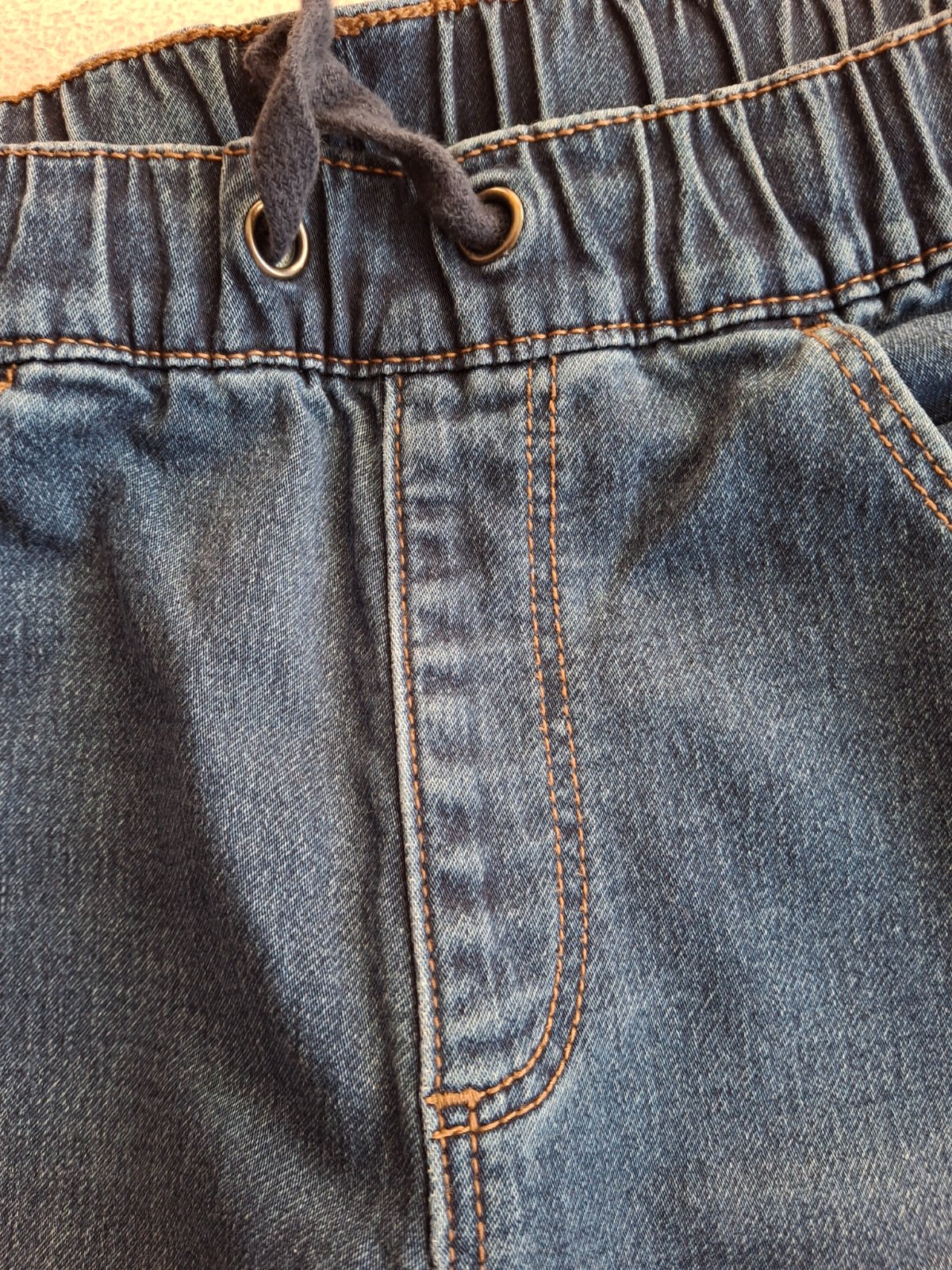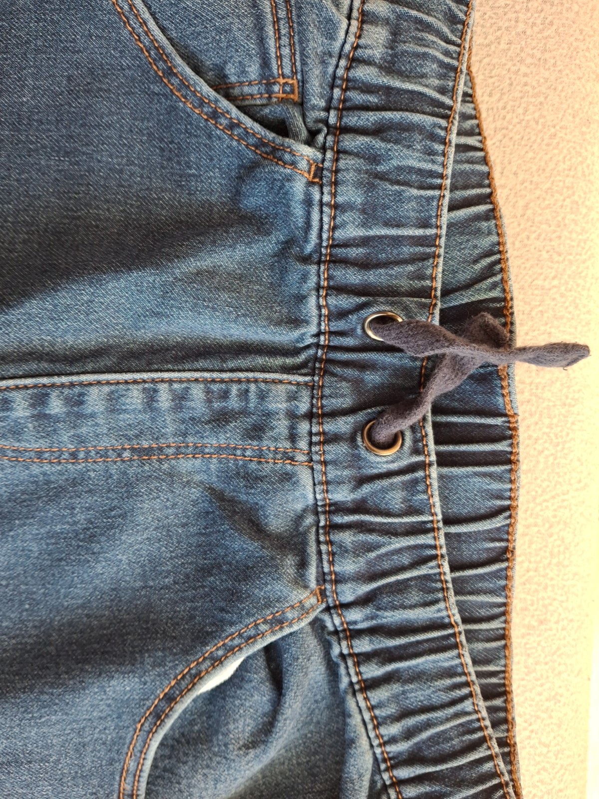 Bez zapínania, gumička v páse a šnúrka. Prešívanie nad kolenami aj vzadu.