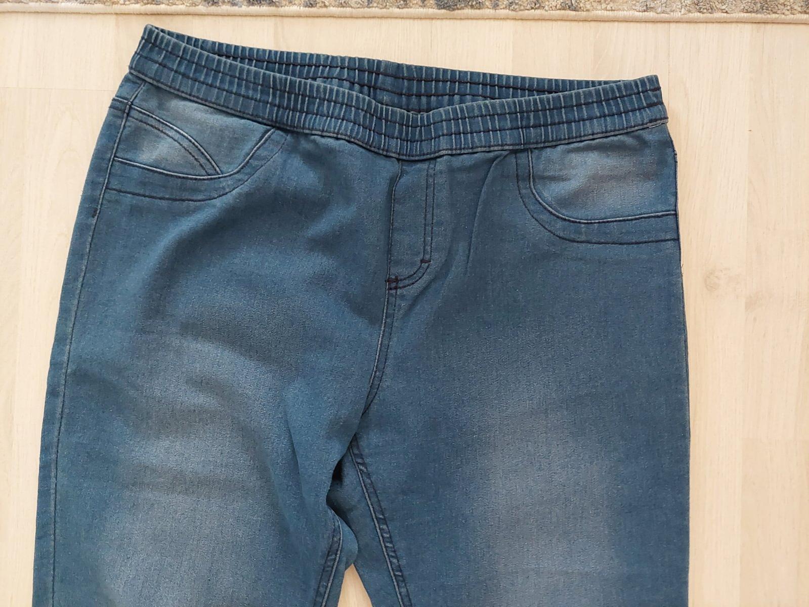 Nohavice z mäkkej rifloviny, na spôsob jegínsov, vel.tak 42 ale vojde aj 44, prispôsobia sa, oblečené asi 2x. Cena 8eur+ pošta