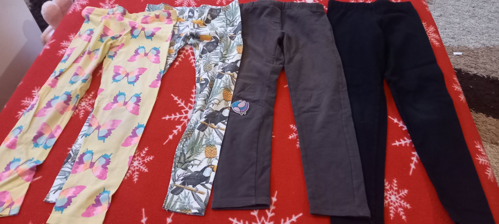 Predám balík legin, sú nosené, žlté majú už trochu povolenú gumu v páse, ideálne by bolo navliecť tam novú, sede s vtacikom sú teplejšie, vtáčik je záplata, na kolene bola dierka, takže vtáčik tam bol nasity.