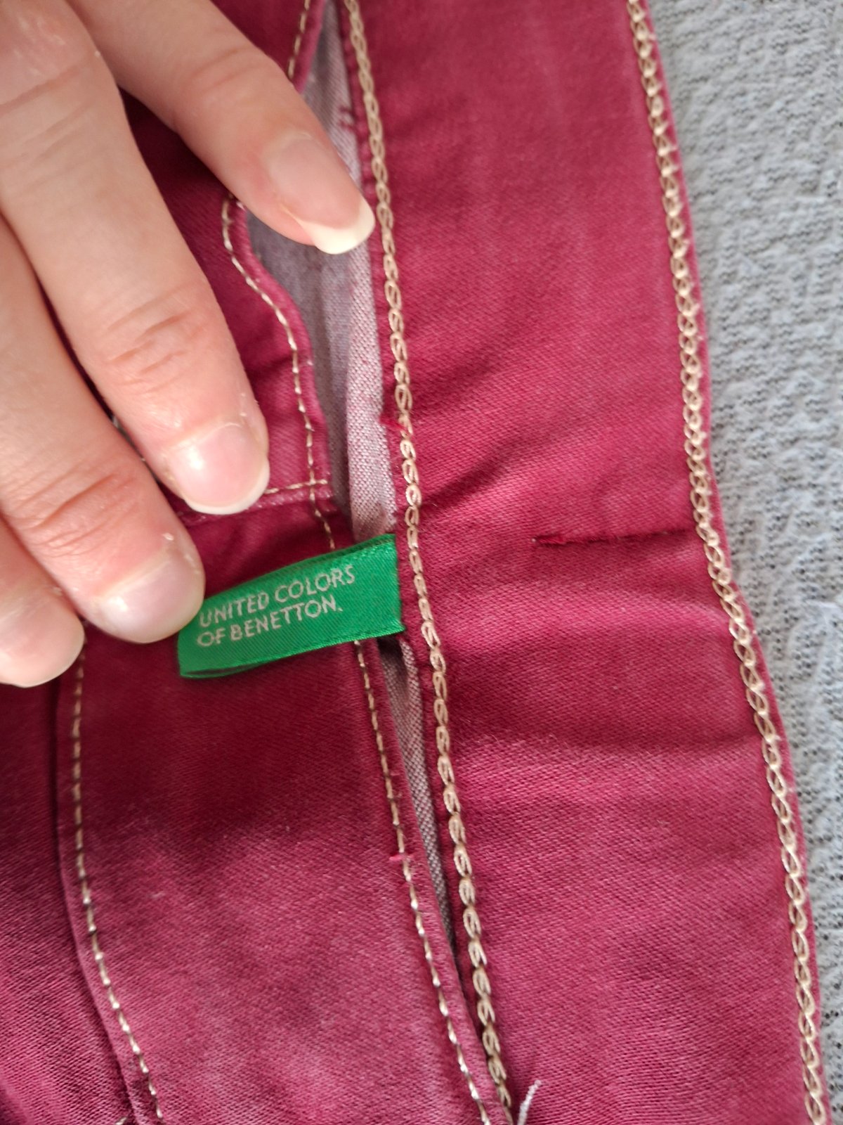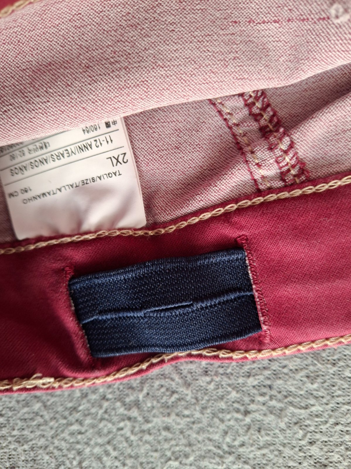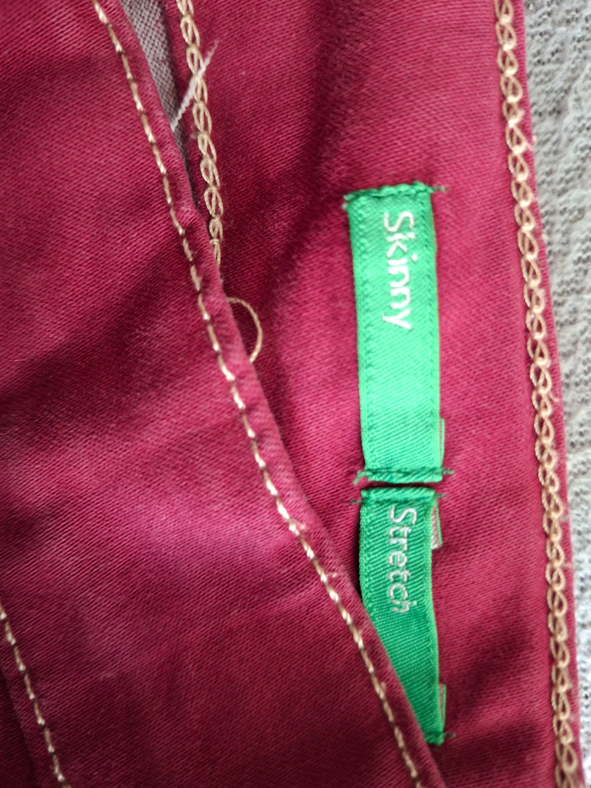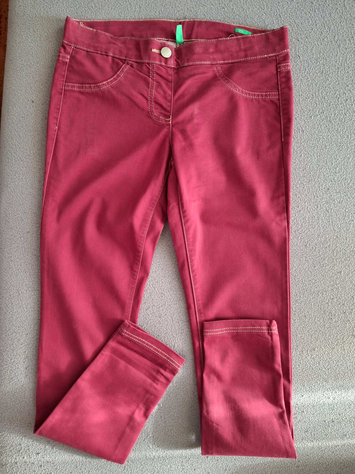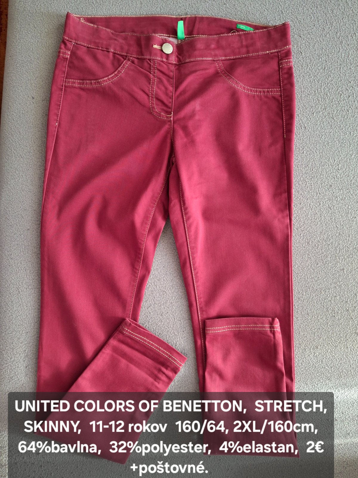 Predám málo nosené dievčenské bordové džeginy, 160cm, na 11-12 rokov, UNITED COLORS OF BENETTON, SKINNY, Stretch, imitácia skrytého zipsu, vreciek a gombík, pás regulovaný gumičkou, vzadu 2x vrecká, 64%bavlna, 32%polyester, 4% elastan.