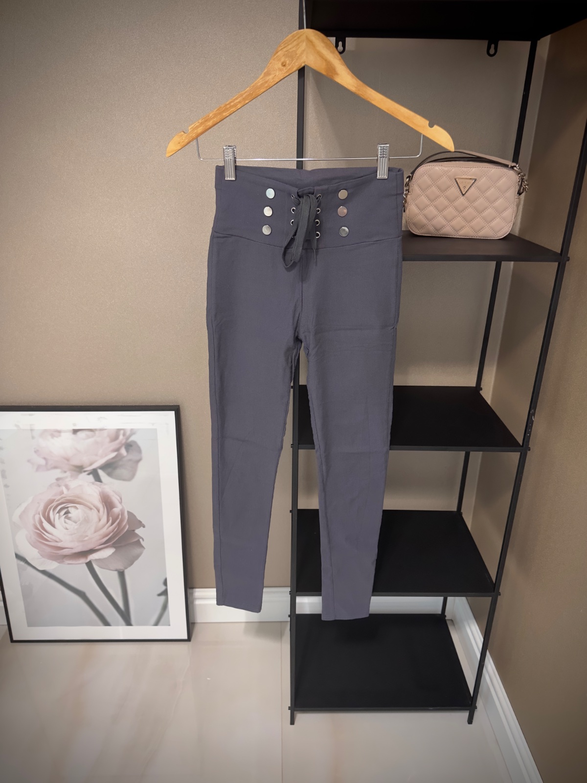 Posuniem elastické legíny, legínové nohavice s vysokým pásom, veľmi pekný nosený stav, pekne tvarujú postavu. Na páse s ozdobnou šnurovačkou a striebornými gombíkmi.